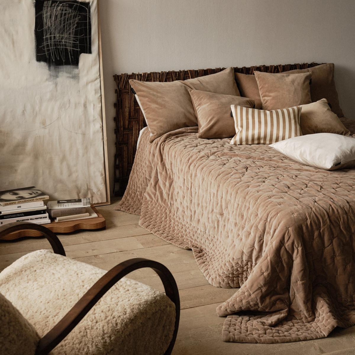 In common with PAOLO, the PICCOLO bedspread in colour camel brown is made with 100% organic cotton velvet, giving it a natural lustre. The fabric creates a modern and exclusive look that gives your bedroom an urban and sophisticated feel. PICCOLO also mirrors PAOLO’s style with a number of exquisite details, including the quilted and timeless chequered pattern and the sewn edging. PICCOLO measures 170x260 cm, perfect for single beds of up to 140 cm depending on position. PICCOLO can also be styled horizontally on a double bed, when it acts more like a bed runner.