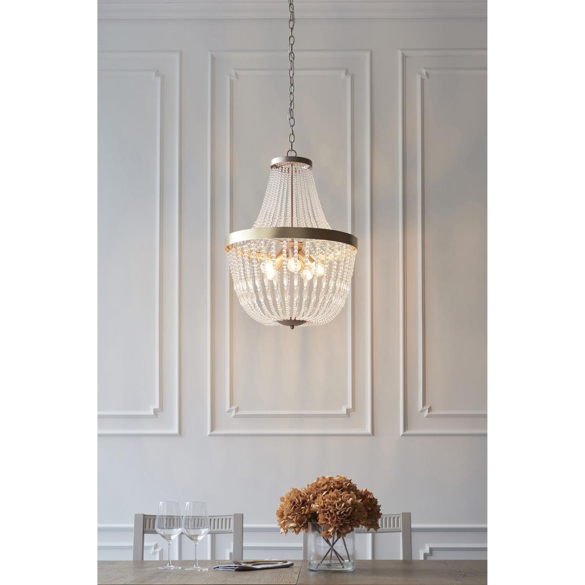 Our Pickett pendant light is a modern take on the classic chandelier. This striking piece has a glitzy feel that wouldn't look out of place in the grandest of ballrooms. With beautiful glass beading and stunning rose gold accents, bring a touch of glamour into your home and stand back to admire.