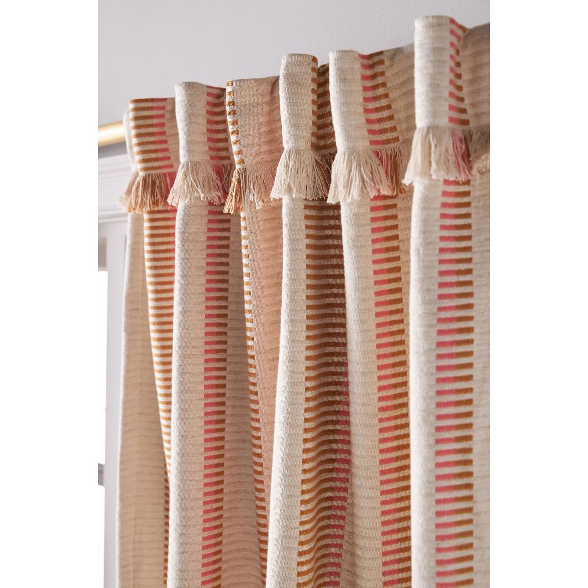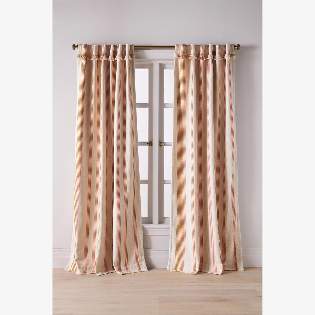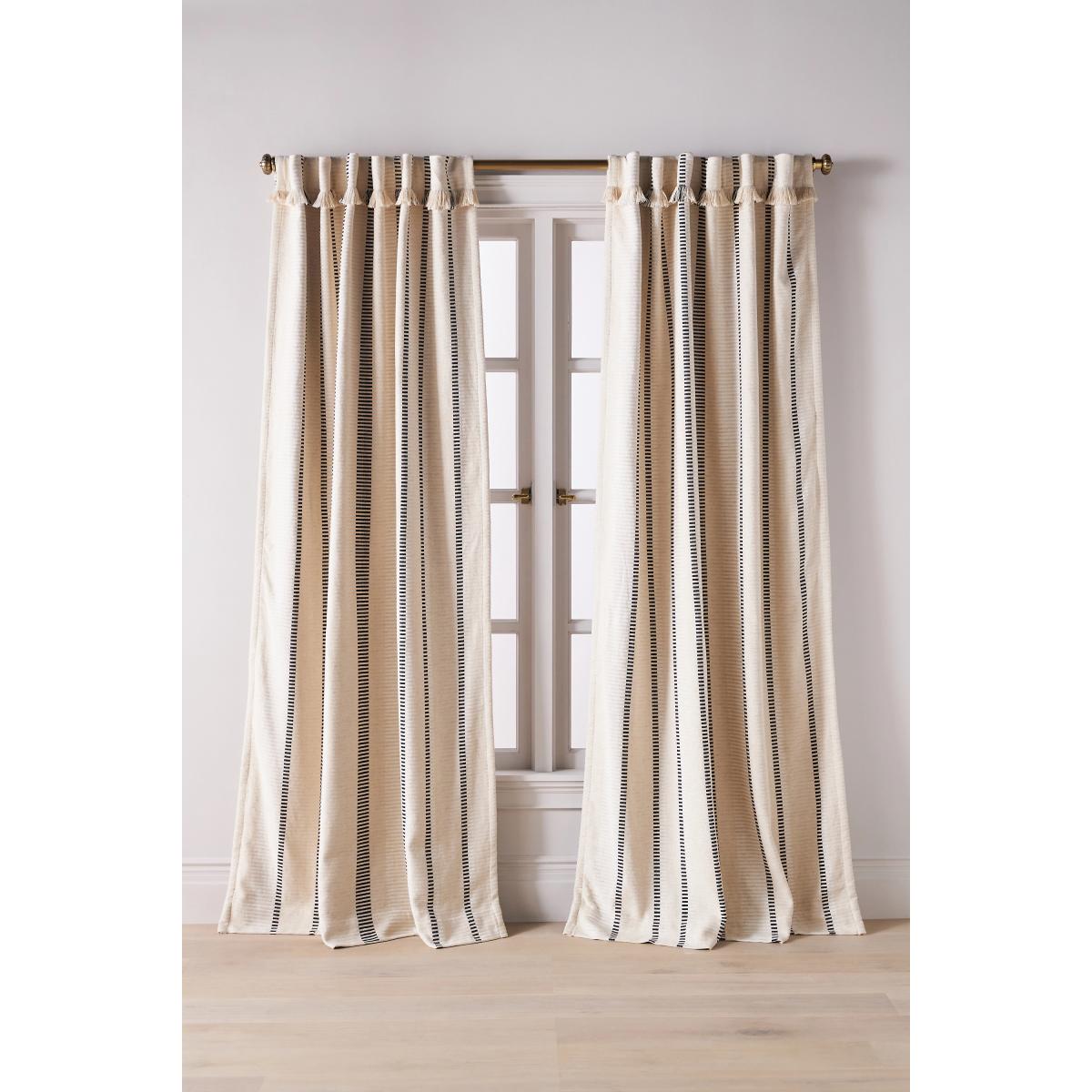 Featuring striped fabric fragments pieced together with zig-zag stitching, this curtain invites a pop of pattern to any window. * Sold individually * Tunnel tab construction * 56% cotton, 36% rayon, 8% linen * Appliqué embellishment * This style is light filtering * Unlined * Machine wash; line dry and iron to retain length * Spot clean recommended * Imported