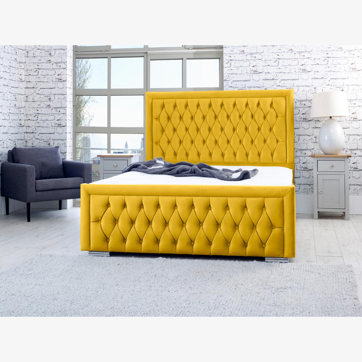 Sleep and wake up like royalty that you are in our glamorous Piera bed. This is nothing out of Alice in Wonder Land or a dainty bed frame. Rather, it is sturdy, powerful, and majestic in every sense of the word. Stylishly framed and compact to fit into any space. The exquisite finishing with the crystal buttoning makes the bed stand out in your bedroom space. It features Spanish upholstery that gives it a strong form that can withstand any weight. The matching headboard and footboard feature perfect finishing with the tufting, while the plush velvet only adds class and style to the whole package. The 4-inch solid thick frame, chrome feet, and solid board base make the bed a solid piece that will last very long. You will love sleeping and waking up on this stunning bed every day.