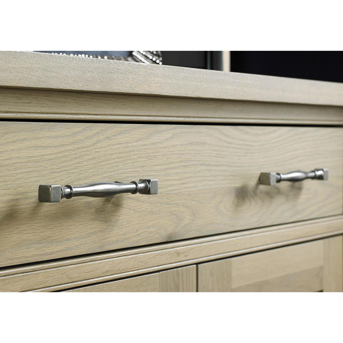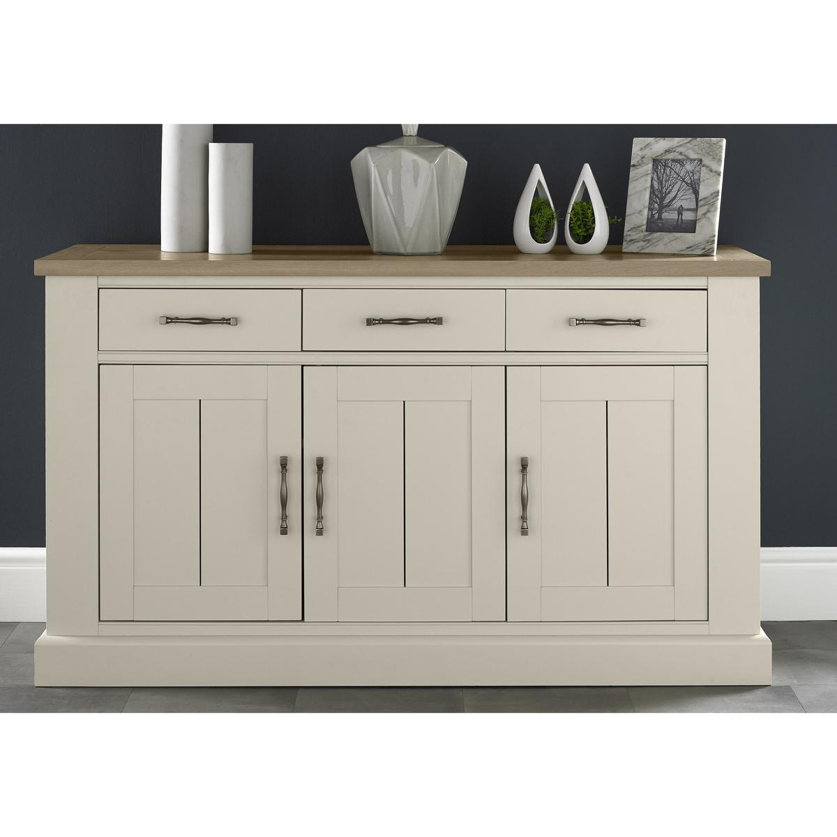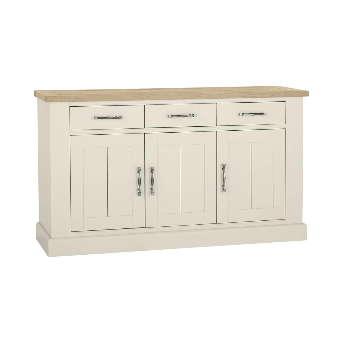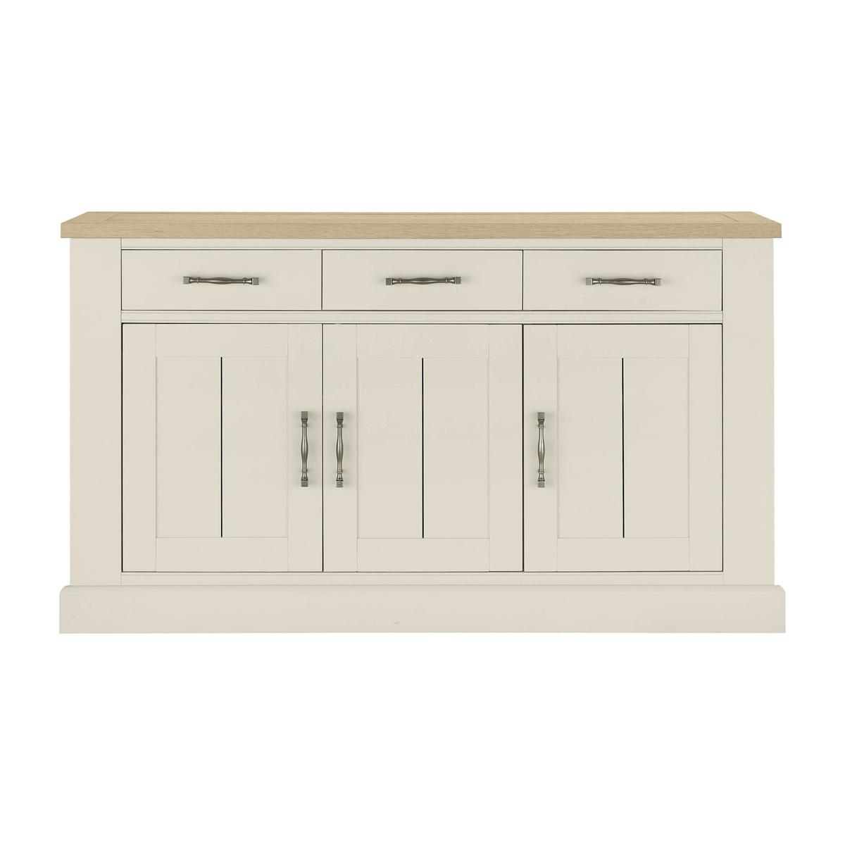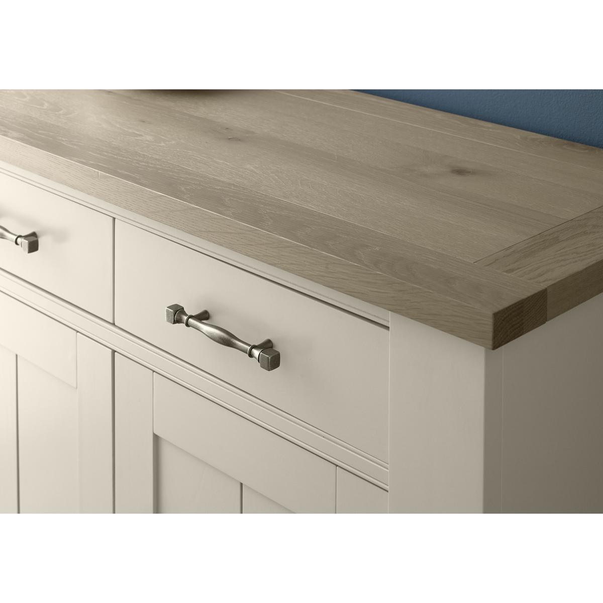 Elegant sideboard with two equally beautiful looks. Made using the finest knotty American oak. Choose solid oak top with aged oak veneers and a solid oak frame. Or solid oak top with beech and MDF frame painted antique white. Three large cupboards below, three useful drawers above. Over hanging top, panelled cupboards, soft close drawers. Beautifully shaped, bespoke metal drawer and cupboard handles