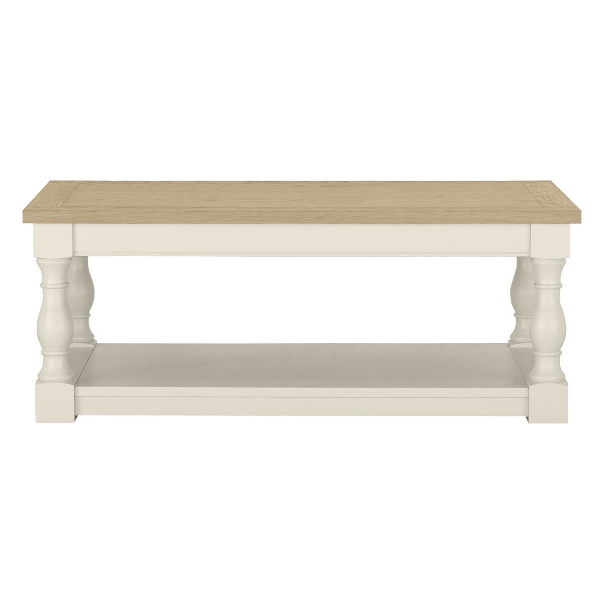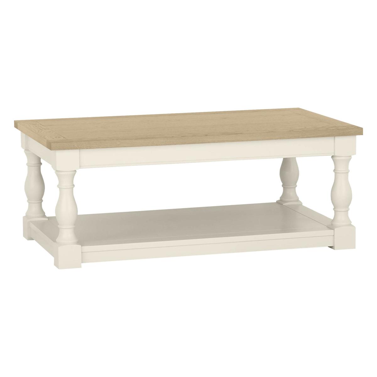 Elegant coffee table, with a timeless classic style. Made from the finest knotty American oak. Table top is solid oak with beautiful, aged oak veneers. Two equally attractive looks to choose from. Choose an oak and oak veneer top with a solid oak frame. Or two tone with oak top and antique white painted beech legs. Classically styled turned legs, with useful shelf below