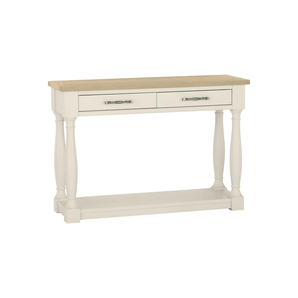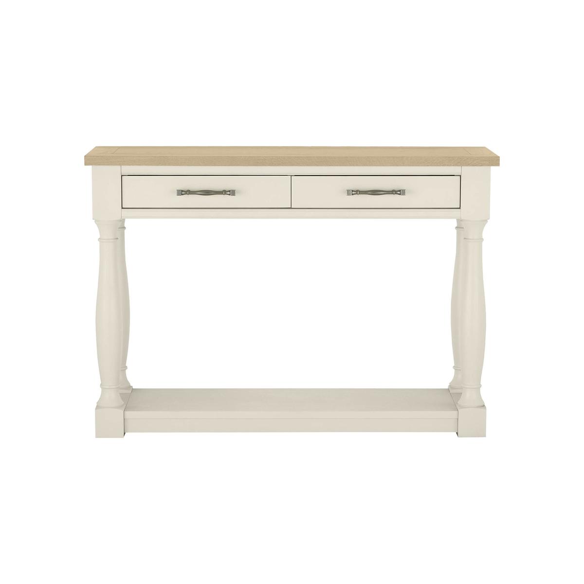 Elegant console table, with a timeless classic style. Made from the finest knotty American oak. Table top is solid oak with beautiful, aged oak veneers. Two useful drawers with bespoke metal handles. Choose an oak and oak veneer top with a solid oak frame. Or two tone with oak top and antique white painted beech legs. Classically styled turned legs, with shelf below