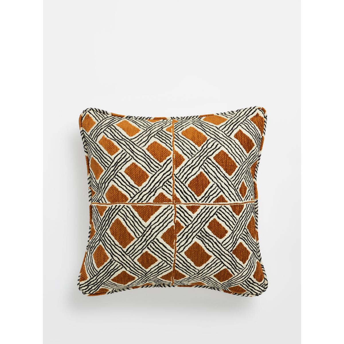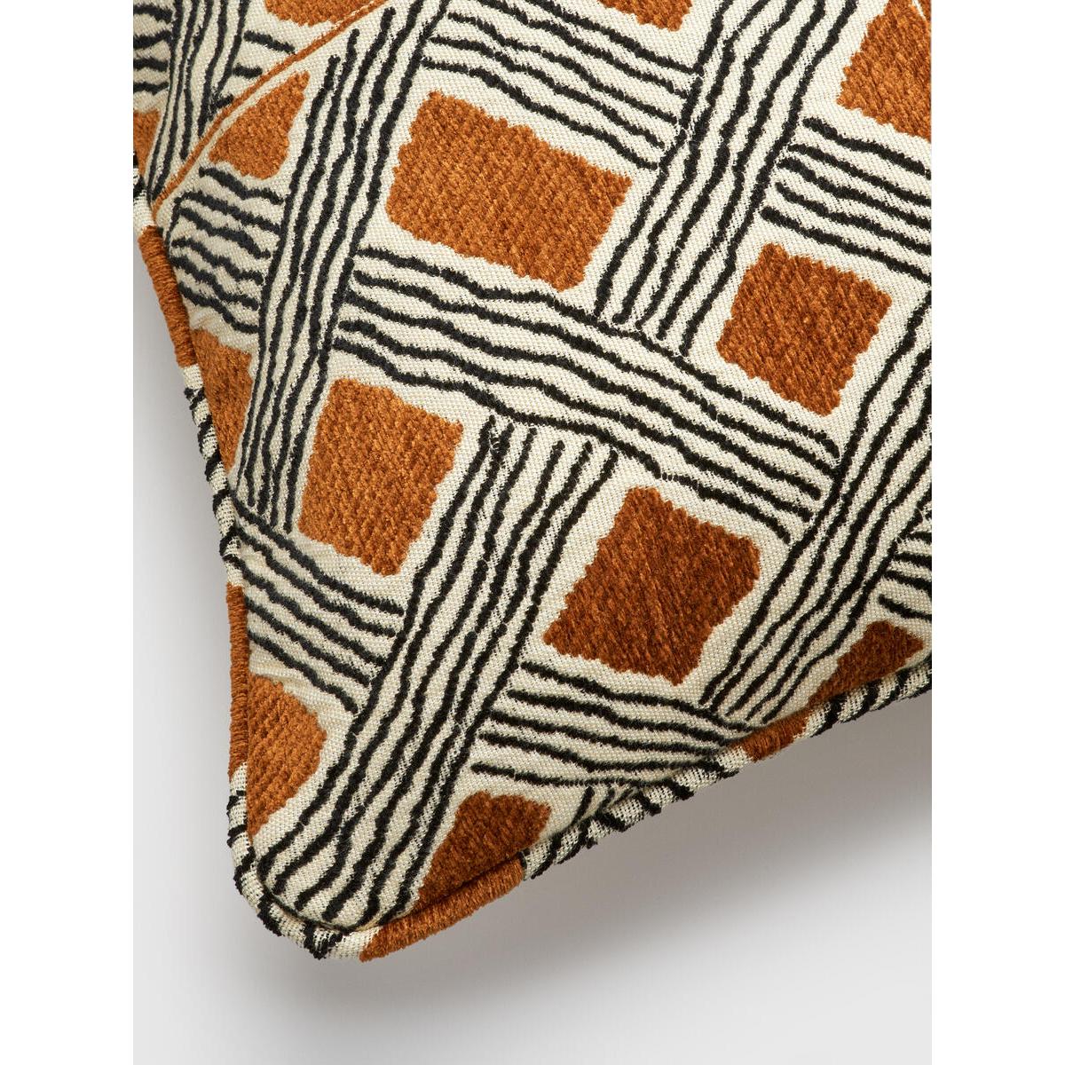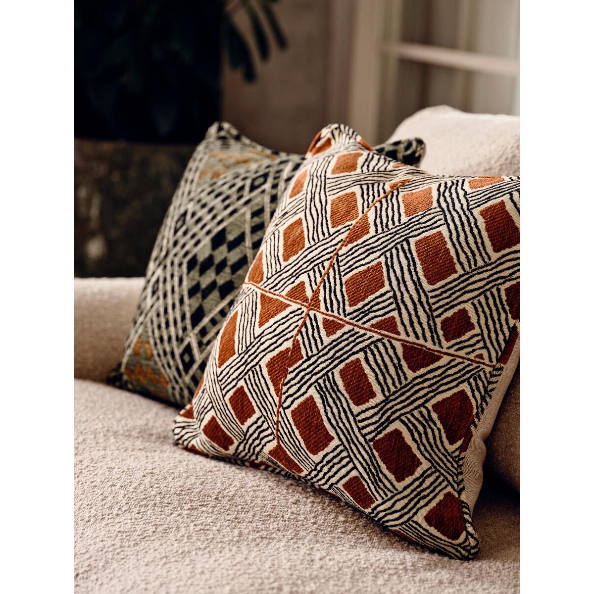 I love the Pierre Frey Behanzin cushion for its striking geometric pattern and rich earthy tones, which add a warm, tactile element to any space. It works particularly well in modern, bohemian, or eclectic interiors, where its bold design can serve as a statement piece or be layered with softer textures for added depth. Practical styling tips include pairing it with neutral-toned sofas to let the pattern stand out or mixing it with other textures like knits or velvets for a curated, cosy vibe. To keep the look fresh, consider combining with cushions in more subdued colours or different patterns, ensuring the overall aesthetic remains balanced and inviting.