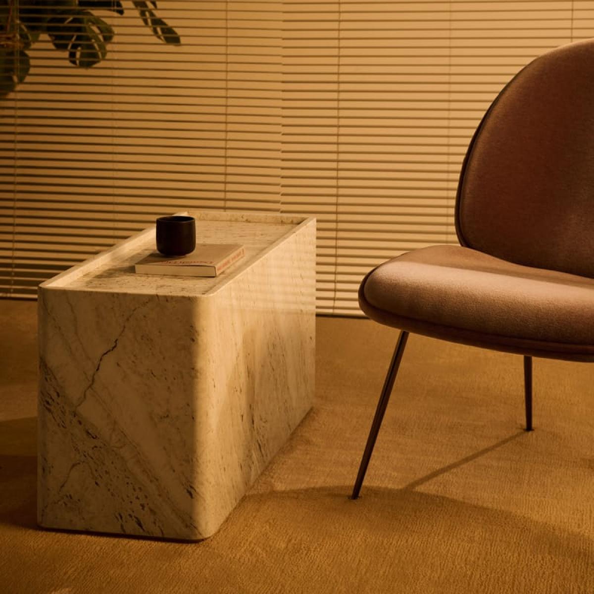 I love this side table because of its clean, minimal aesthetic and the natural warmth of the travertine stone. It works particularly well in interiors that embrace a neutral, Scandinavian, or contemporary style, adding texture and a touch of luxury without overwhelming the space. For practical styling, it’s ideal as a bedside table or a complement to a low sofa, where it can hold a lamp, a book, or decorative objects. To keep it looking its best, avoid placing overly wet or harshly acidic materials directly on the stone. Its neutral palette makes it versatile for both light and darker colour schemes, making it an elegant yet functional addition to most modern living areas.