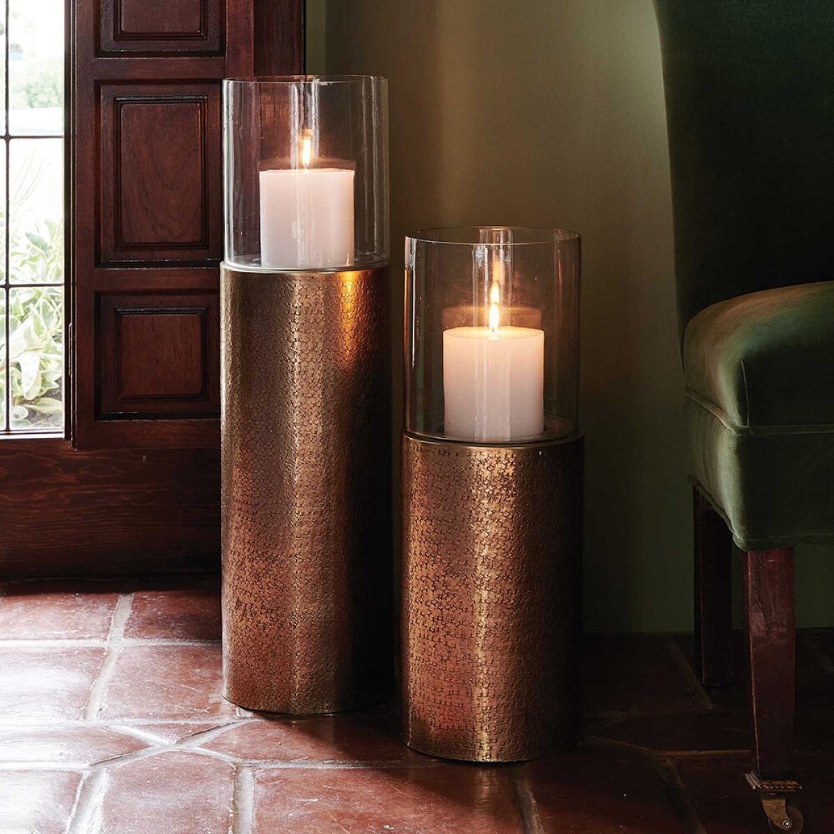 This candle holder offers a lovely blend of industrial charm and understated elegance, making it versatile for various interiors. I love its hammered iron finish paired with the clear glass hurricane, which adds a layer of texture and visual interest. It works particularly well in contemporary, minimalist, or even rustic schemes, bringing a warm glow without feeling too formal. A practical tip is to group a few of these on a sideboard or mantel for a cosy, inviting focal point or to set several at different heights along a dining table for a lush, layered look. Because of its sizeable form, it’s ideal for creating a statement in larger spaces or for adding ambiance in different rooms-think living rooms, bedrooms, or hallways.