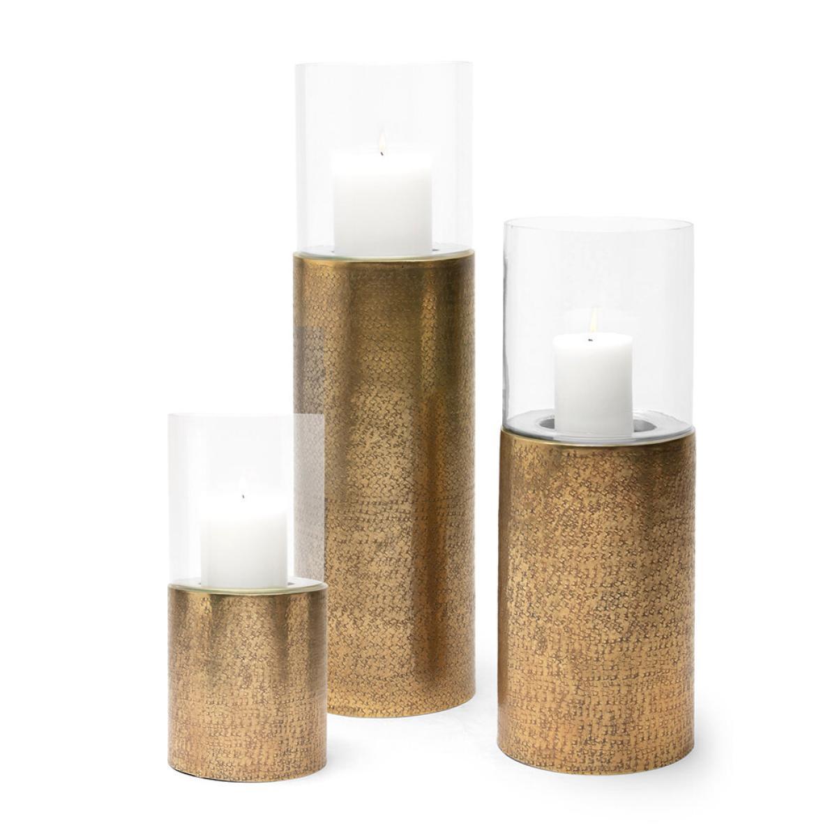 Add the perfect finishing touch to your home with this Ismay hurricane lamp from Pigeon and Poodle. Expertly crafted from brass with a glass vessel, it features a chic hammered texture in an antique gold finish.