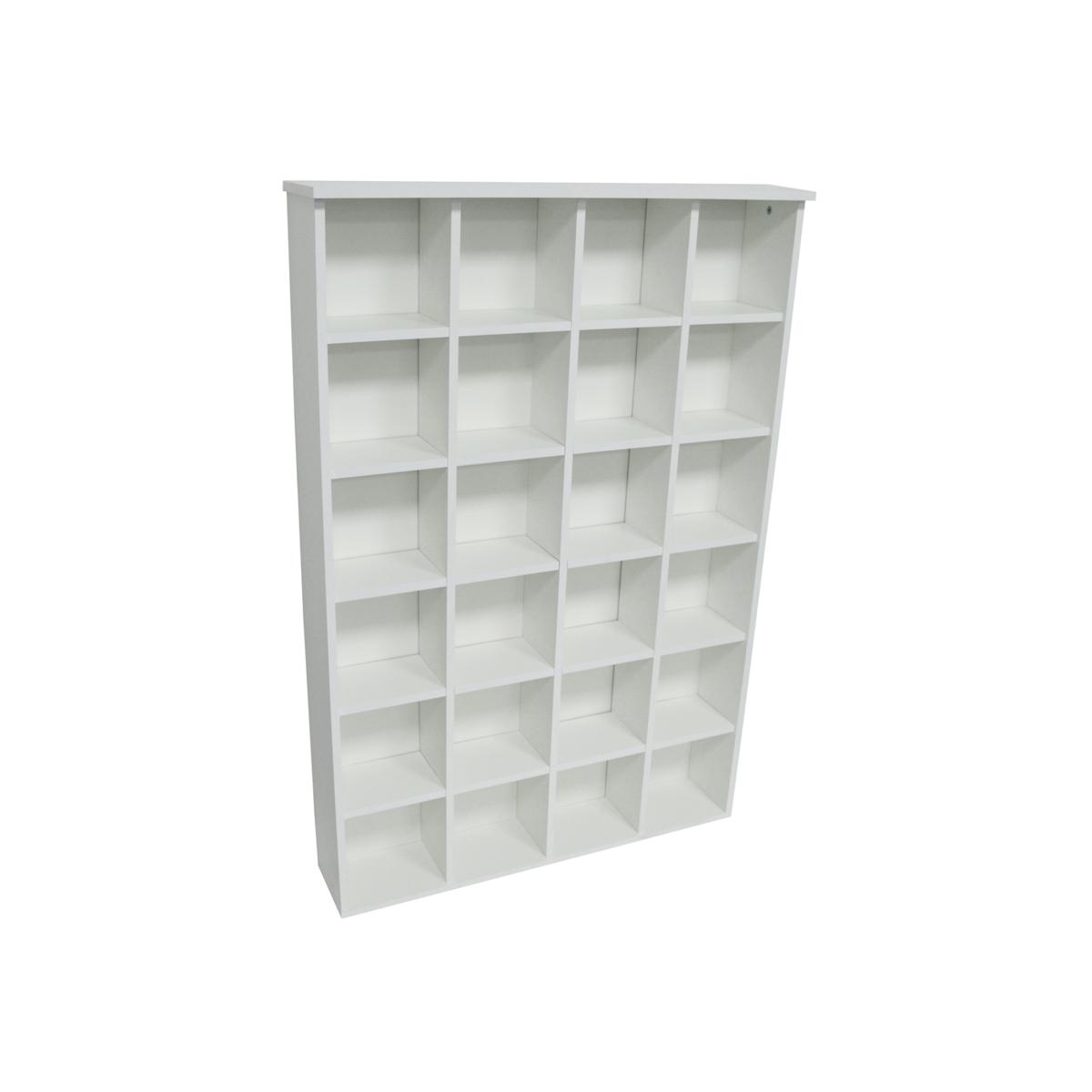 Free standing white finish pigeon hole unit great for media storage or for displaying treasured objects. Very simple design within an incredibly small footprint - it only projects 20cm from your wall. With four columns by six rows making 24 cubbies - each measuring 20h x 20w x 15d cm - maximum capacity 312 DVDs Blu-rays computer games or 480 CDs.