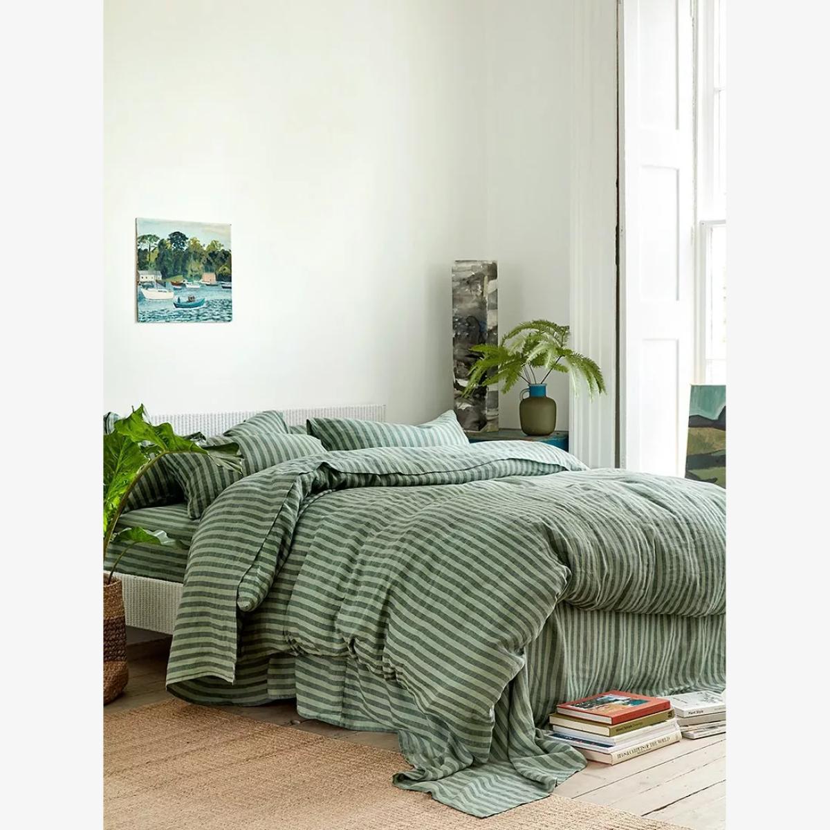 Introducing the Pembroke Stripe linen collection. Made in Portugal from high-quality European linen, this breathable, long-lasting, and thermoregulating, linen is a bedding material for all seasons; keeping you warm when it's cold and keeping you cool when it's hot. Beautifully simple and unfailingly pleasant, choose this ticking stripe linen bedding for timeless appeal. Piget in Bed bedding gets softer and softer with wear and can be mixed and matched with any of their linen duvet covers, flat sheets or pillowcases, adding natural texture and depth to any bedroom scheme, whether it’s for your master, guest or kids' bedroom. Sheeting sizes To fit mattress size (cm) Single, L190 x W90cm Double, L190 x W135cm King, L200 x W150cm Super king, L200 x W180cm Piglet in Bed believes in a natural, sustainable and enjoyable way of life that encourages reflection on what matters most. Born in, and inspired by the joys of rural Britain, Piglet in Bed makes products with longevity in mind. The brand is founded on the conviction that genuine quality should be with us forever and they look to nature as a wonderful provider; materials that are cosy and soft, but durable too. Creases are not the enemy. Wasting your one precious life on things like plucking, plumping and fluffing is. Life is for LIVING. And so are Piglet in Bed's products.