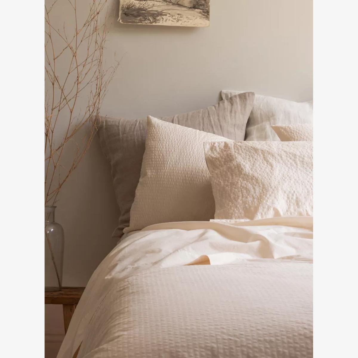 This seersucker bedding collection is achieved by weaving yarns of different tensions to create a relaxed, puckered effect. Made from 100% cotton with a 200 thread count, the signature softly crinkled texture allows for a breathable, cool and comfortable sleep. All Piglet in Bed cotton bedding is sustainably sourced in partnership with the Better Cotton Initiative. Additional details: OEKO-Tex Standard 100 certified Breathable Made with Salt Pink seersucker on the top side, with smooth matching cotton percale underneath Closed with button fastenings