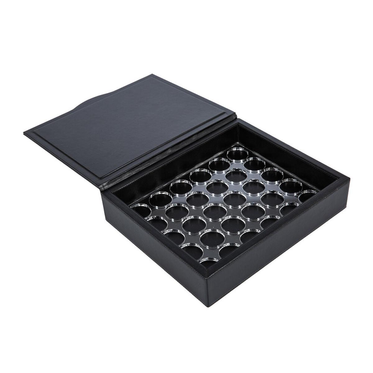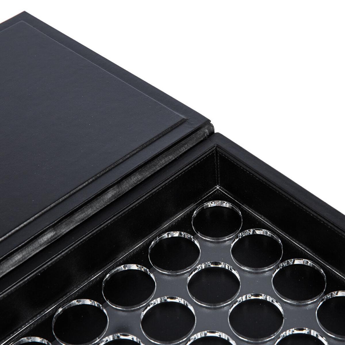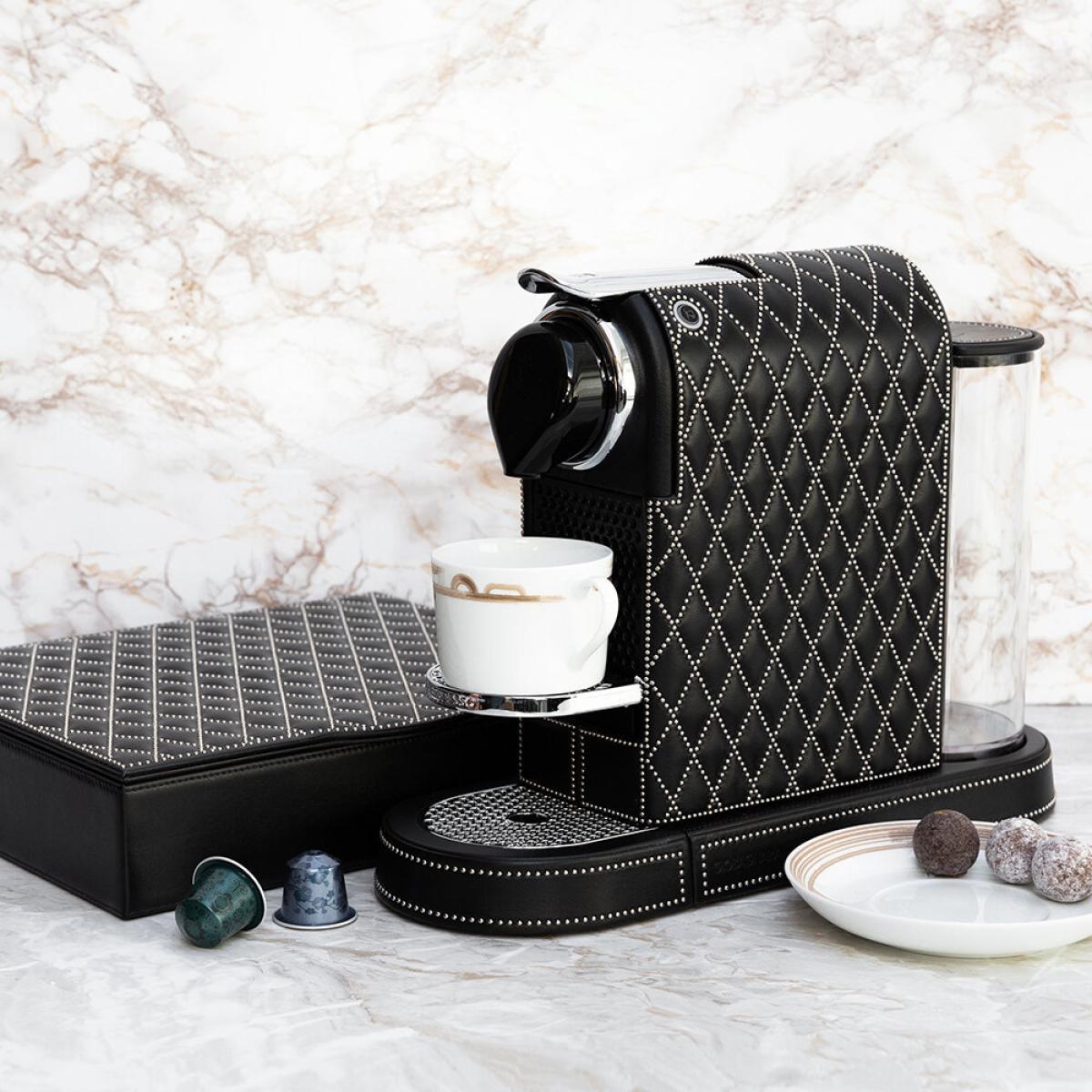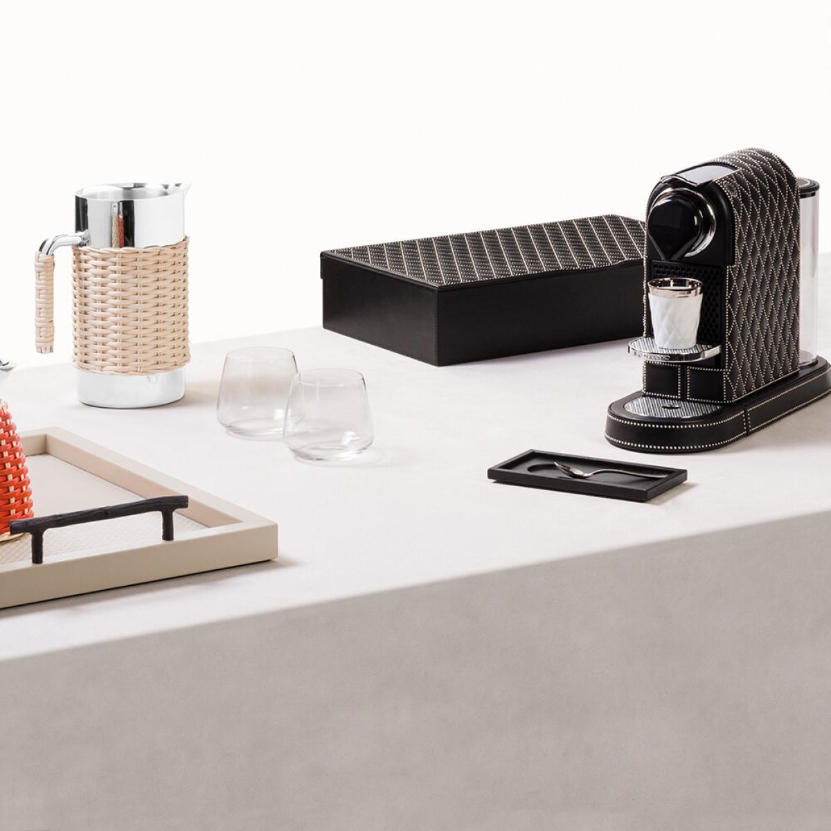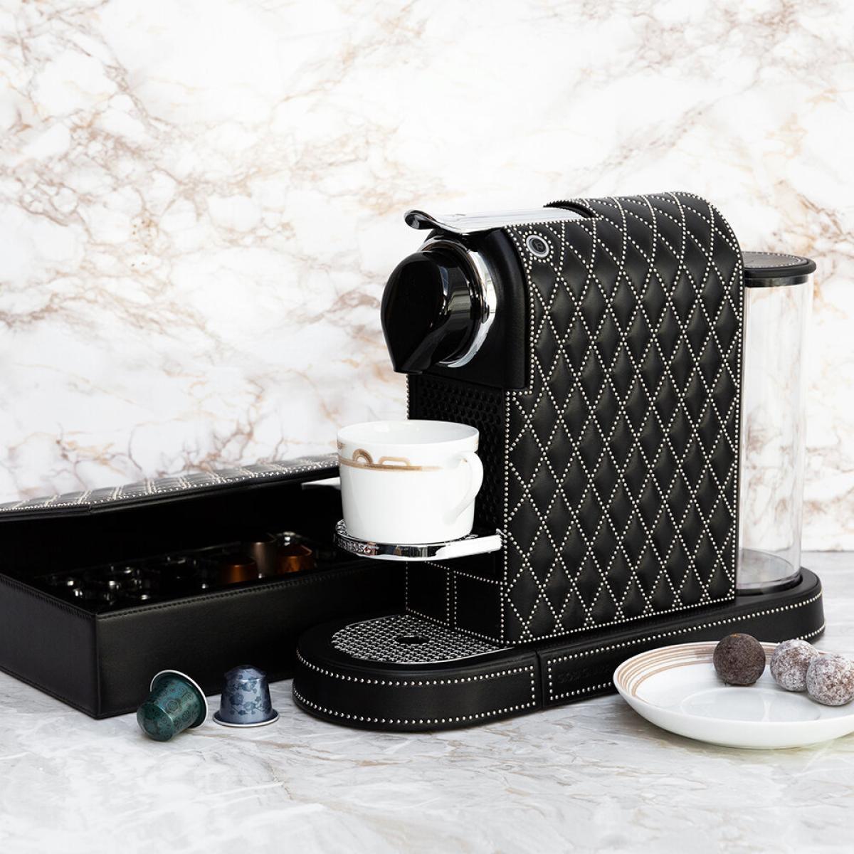 Add a new level of luxury to your kitchen with this Nespresso Capsules Java Pixie box from Pigment France. A practical wooden structure dressed in leather, it has been expertly crafted by skilled artisans in northern France and features an opulent quilted design with studded detailing. Distinguished by intricate details and impeccable craftsmanship, the precious leathers used by Pigment France have been tanned in Italy with a special treatment that makes them waterproof and scratch resistant. Inside, a plexiglass panel holds up to 30 Nespresso classic capsules making this a must-have addition to your kitchen.