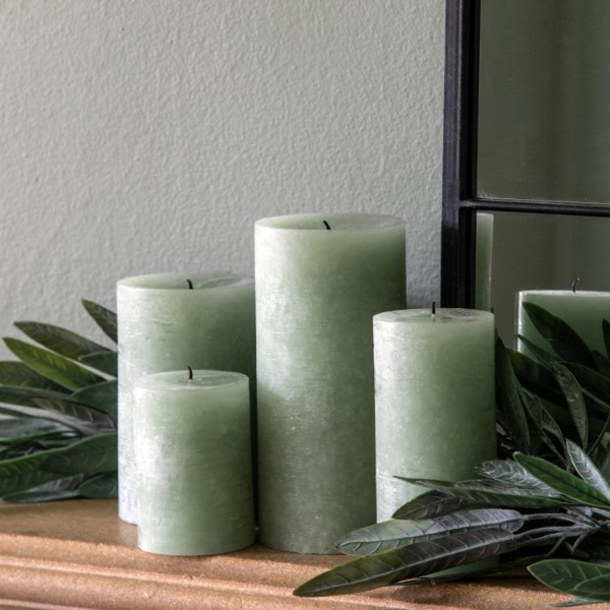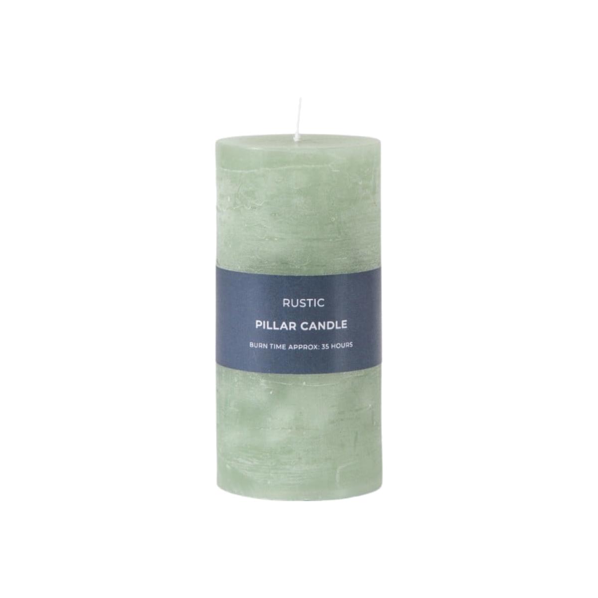 Sage Green rustic finish pillar candle with 35 hour burn time per candle.. Add warmth to your room by adding our stunning rustic finish pillar candles in fresh, modern sage green. Ideal for adding drama to fireplaces in darker evenings or on diniging tables as a enticing display.