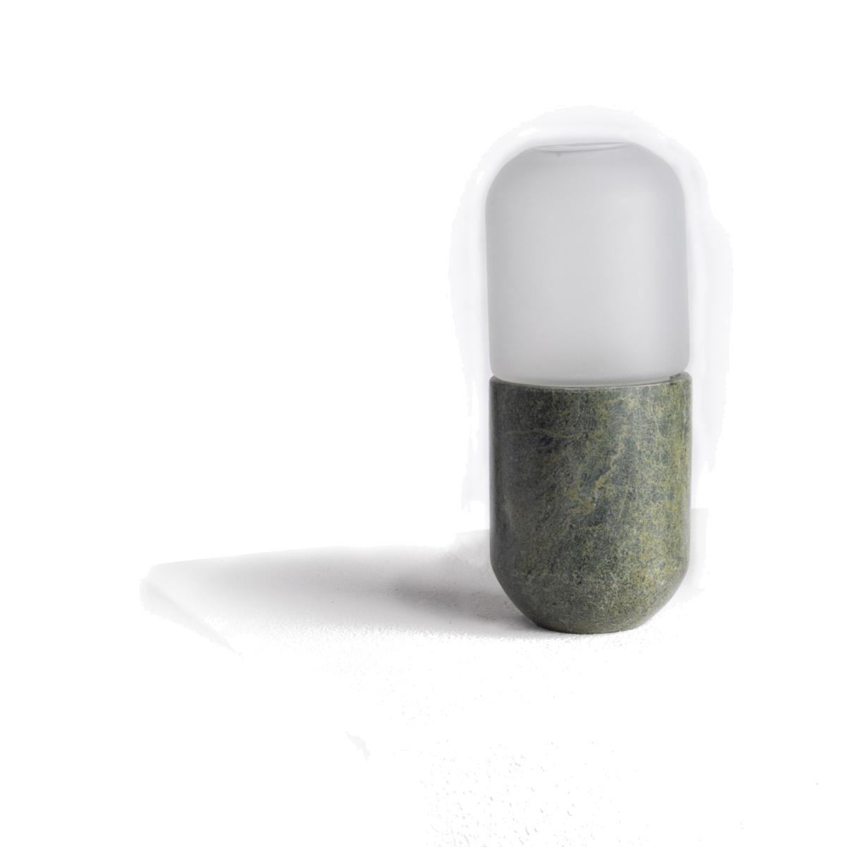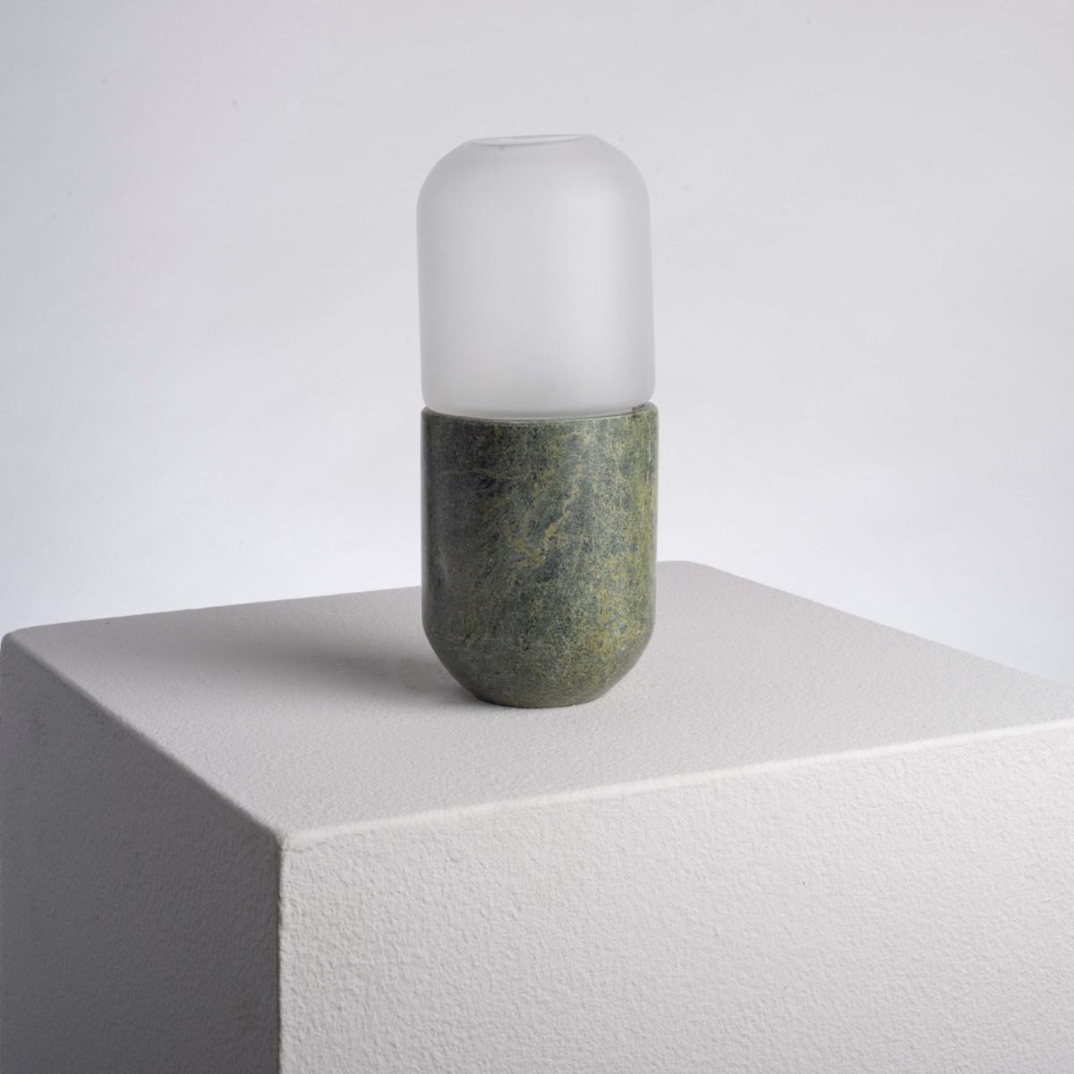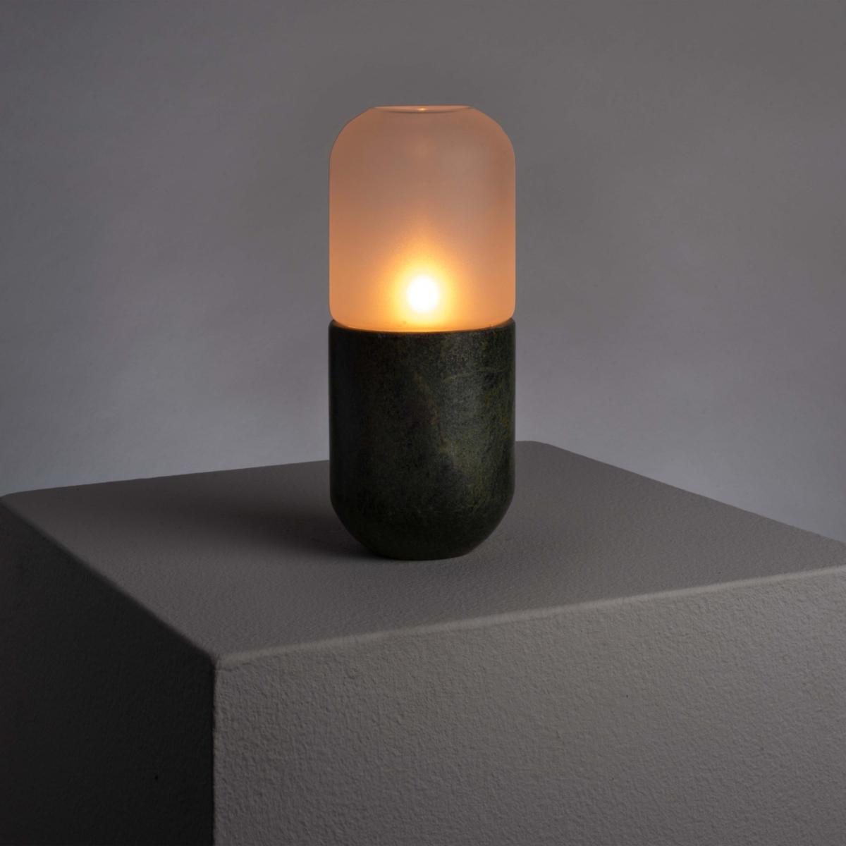 This is a very clever decorative candle holder, simulates a capsule, the lower part comes out of a solid block of marble where a jumbo tealight candle easy to replace rests, the upper part is a frosted borosilicate glass that has the function of a shade, keeping the light from the flame diffused and protected from gusts of wind. This candle just makes a beautiful, clean and comfortable atmosphere.