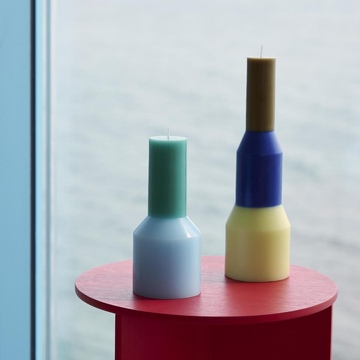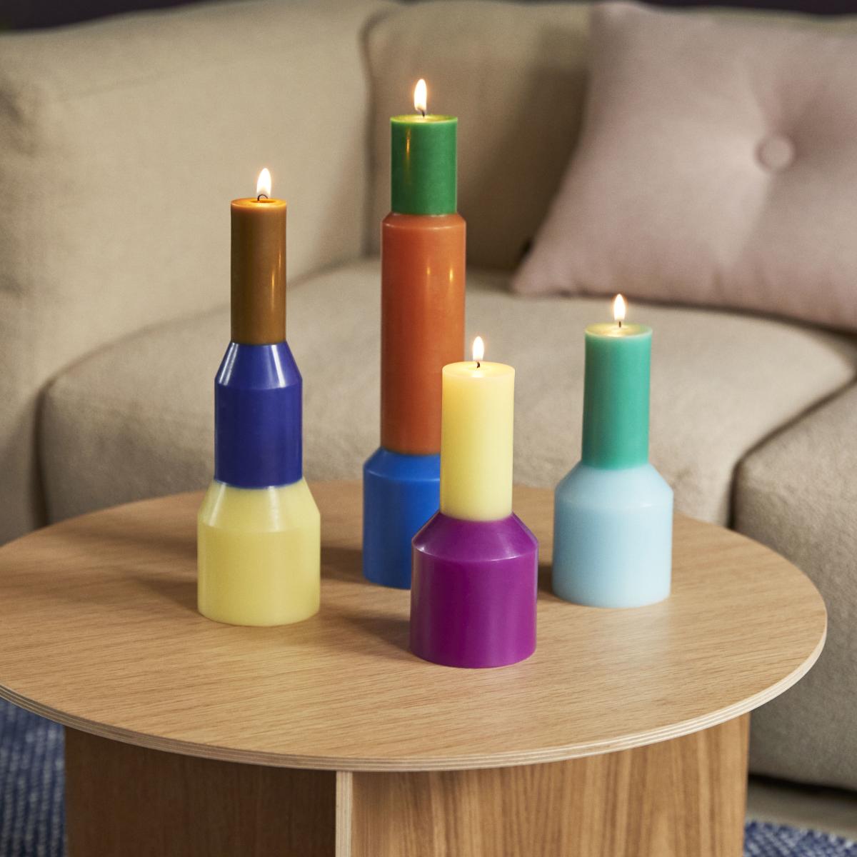 Colour block... Pillar candles are made up of superimposed cylinders of different sizes, available in a palette of ultra-trendy, flashy shades. This assembly of colour blocks creates a rhythmic composition with a very contemporary expression.