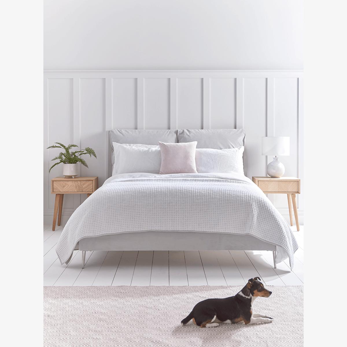 I love this bed frame for its plush velvet finish, which adds a touch of luxury without feeling too formal. The soft grey shade is versatile and pairs well with both contemporary and classic interiors, making it an adaptable choice for various colour schemes. It works particularly well in neutral and pastel-focused bedrooms, but can also serve as a calming backdrop in more eclectic spaces. For styling, consider keeping the bedding simple with crisp white or muted tones to let the fabric’s texture shine. Adding layered cushions and throws can make the bed inviting, and pairing it with light wood or minimalist furniture helps create a balanced, relaxed atmosphere.