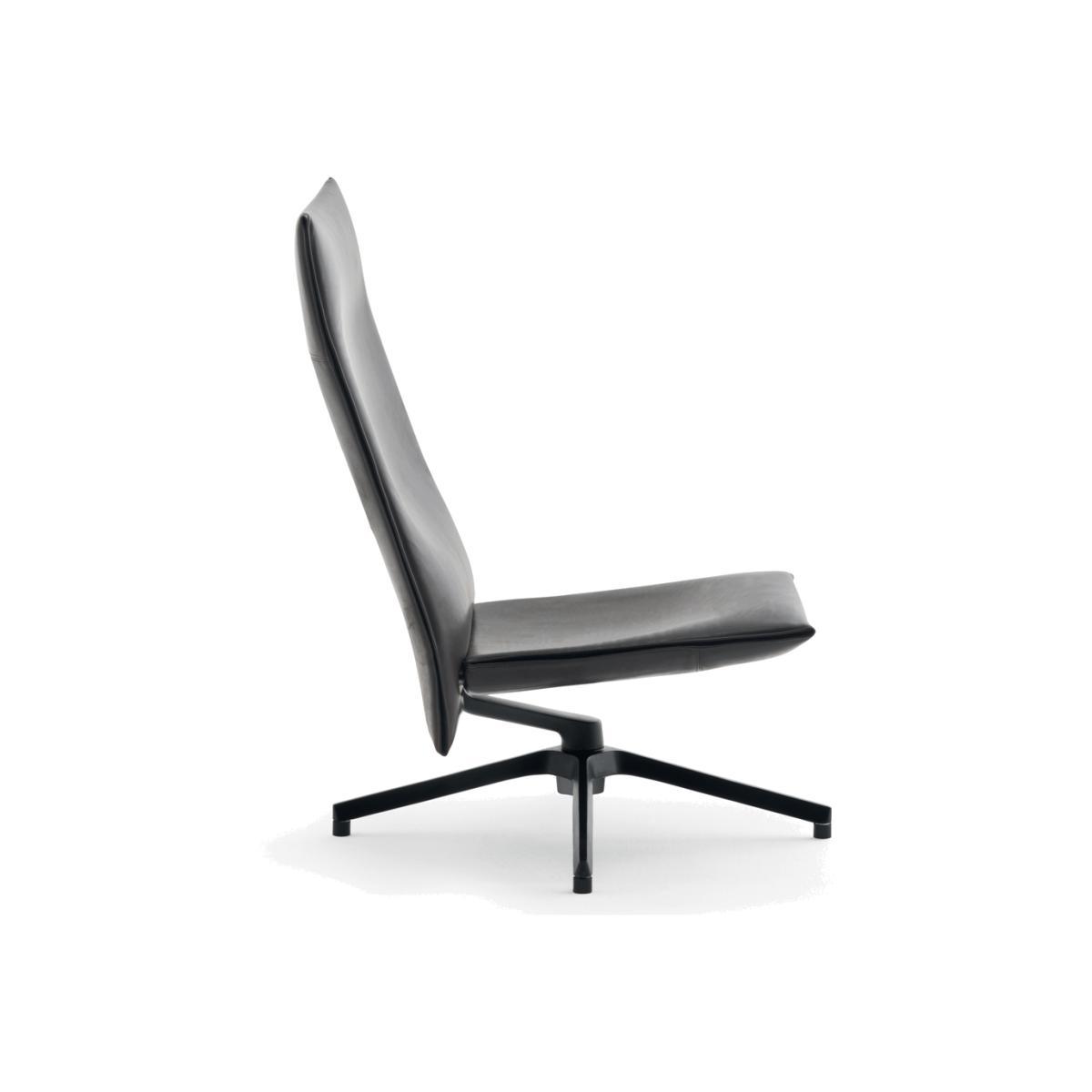 The newest design to emerge from the ongoing collaboration between British design duo Edward Barber and Jay Osgerby and Knoll, the high back Pilot Chair exemplifies refined craftsmanship and comfort, with a slim profile that suits living and workspaces alike. Featuring a cast-aluminium base structure and arms in a charcoal-painted finish that links the 360° swivel base to the seat and back, the cantilevered seat appears to almost float and is completely flexible and adjustable to the sitter's preferences. Barber and Osgerby explain, Our new Pilot chair not only responds to today's needs, but also offers an elegant, innovative design for a different culture. The Pilot Chair's wide frame offers more space when sitting and allows the chair to flex downwards, while its padded back ergonomically fits to the shape of the sitter, resulting in optimum comfort. The soft, high back edition of the Pilot Chair is available in an assortment of Spinneybeck premium 'Volo' leather upholstery options, which enhance its slim, clean-lined form with a rich natural grain. This strikingly contemporary Pilot Chair from Edward Barber and Jay Osgerby for Knoll would make the ultimate statement piece for your living area or study space.