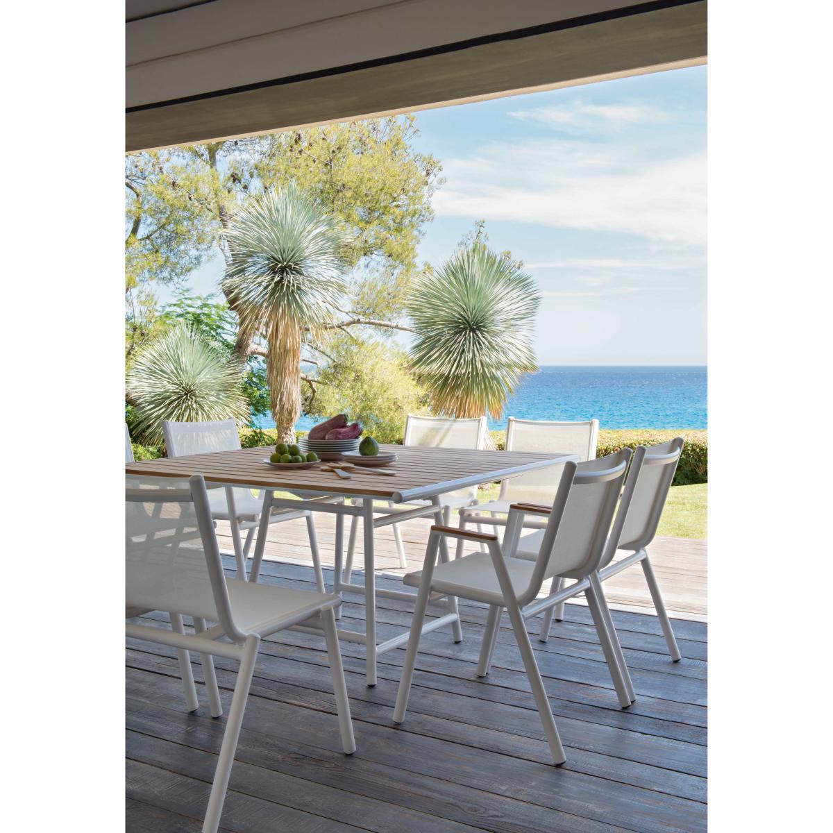 "With its ""lunch on the boat deck"" atmosphere, this collection makes play with a trio of materials: aluminium, Batyline® and teak, for top-of-the-range contemporary furniture.