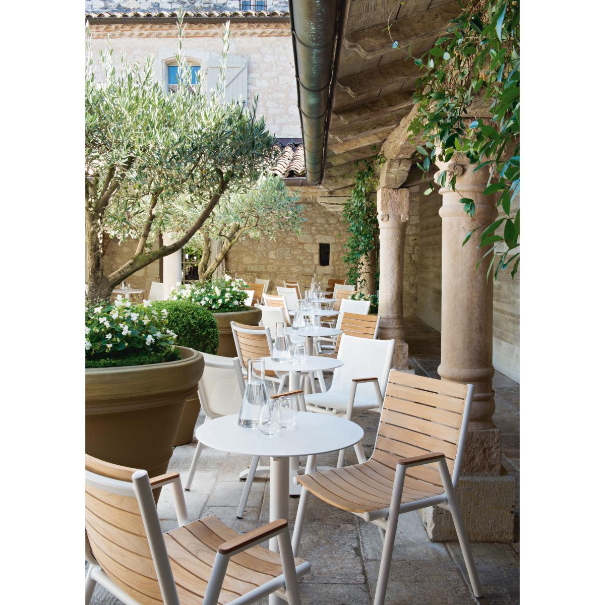 "With its ""lunch on the boat deck"" atmosphere, this collection makes play with a trio of materials: aluminium, Batyline® and teak, for top-of-the-range contemporary furniture.