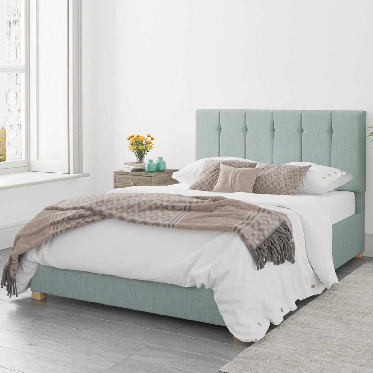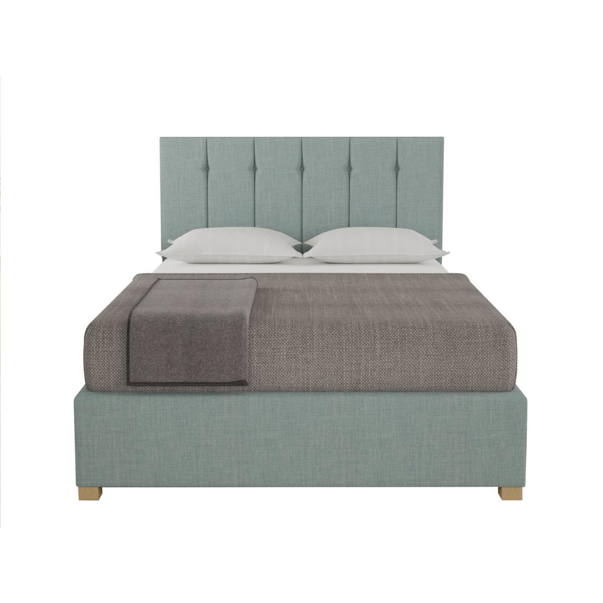 Quality upholstered ottoman storage bed hand crafted in the UK. Featuring chunky upholstered panels, a deep foam padded headboard and hand carved and varnished hard wood feet. Quality sprung slats improve comfort and mattress lifespan. The slats are manufactured with a multi-layer construction for superb durability and lifespan. The easy lift ottoman mechanism is powered with quality gas pistons enabling the storage to be accessed with minimal effort. Once the bed is raised the pistons will hold it in place allowing hands free access to the large storage area. The headboard features a contemporary squared design with deep padding and matching buttons. The bed is upholstered in a choice of quality fabrics with options to suit all decors. The design is finished off with stylish hand carved, hard wood feet which have been carefully hand varnished in the UK.