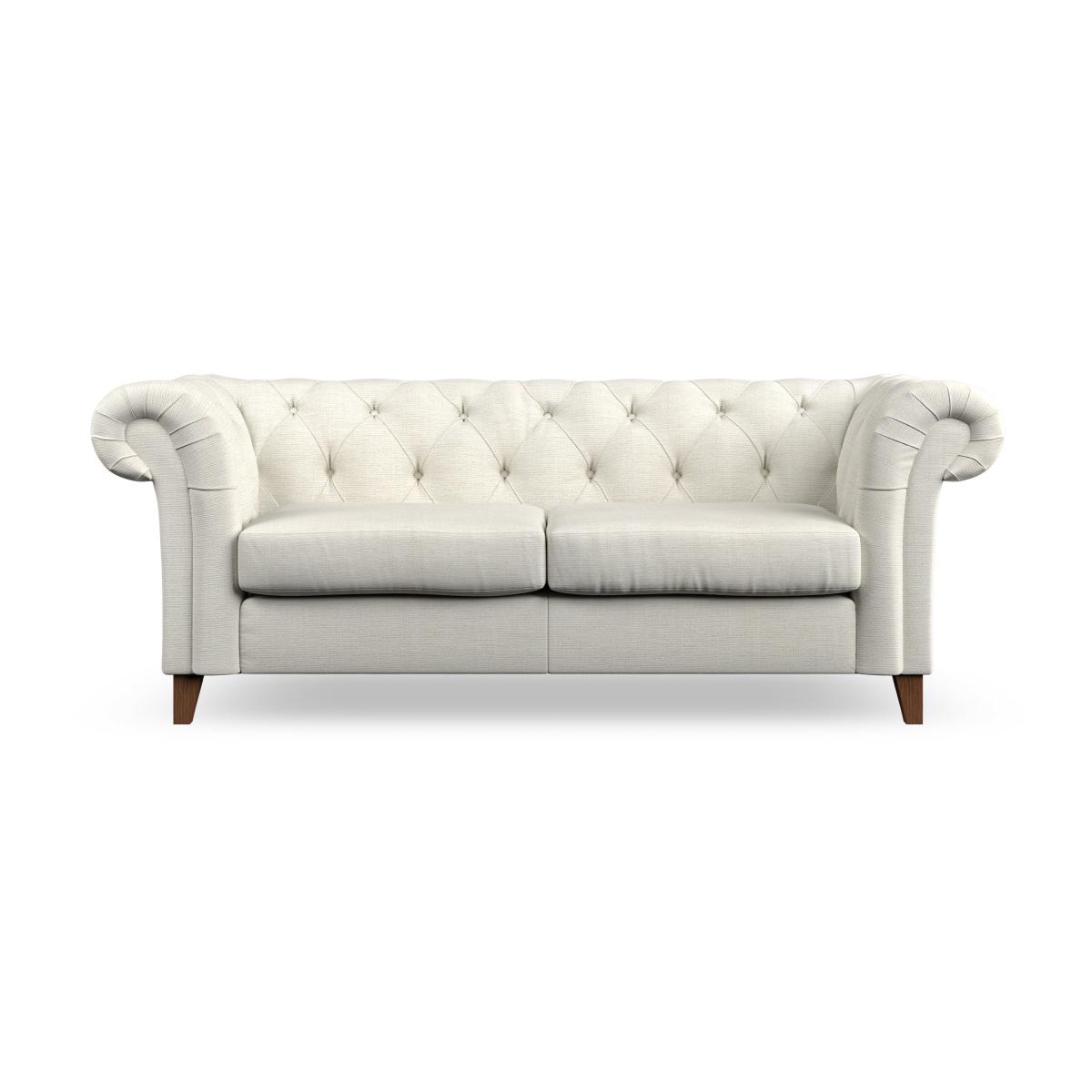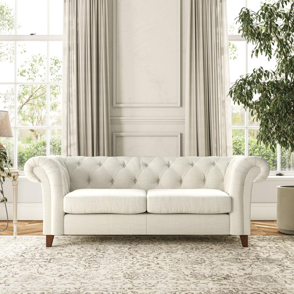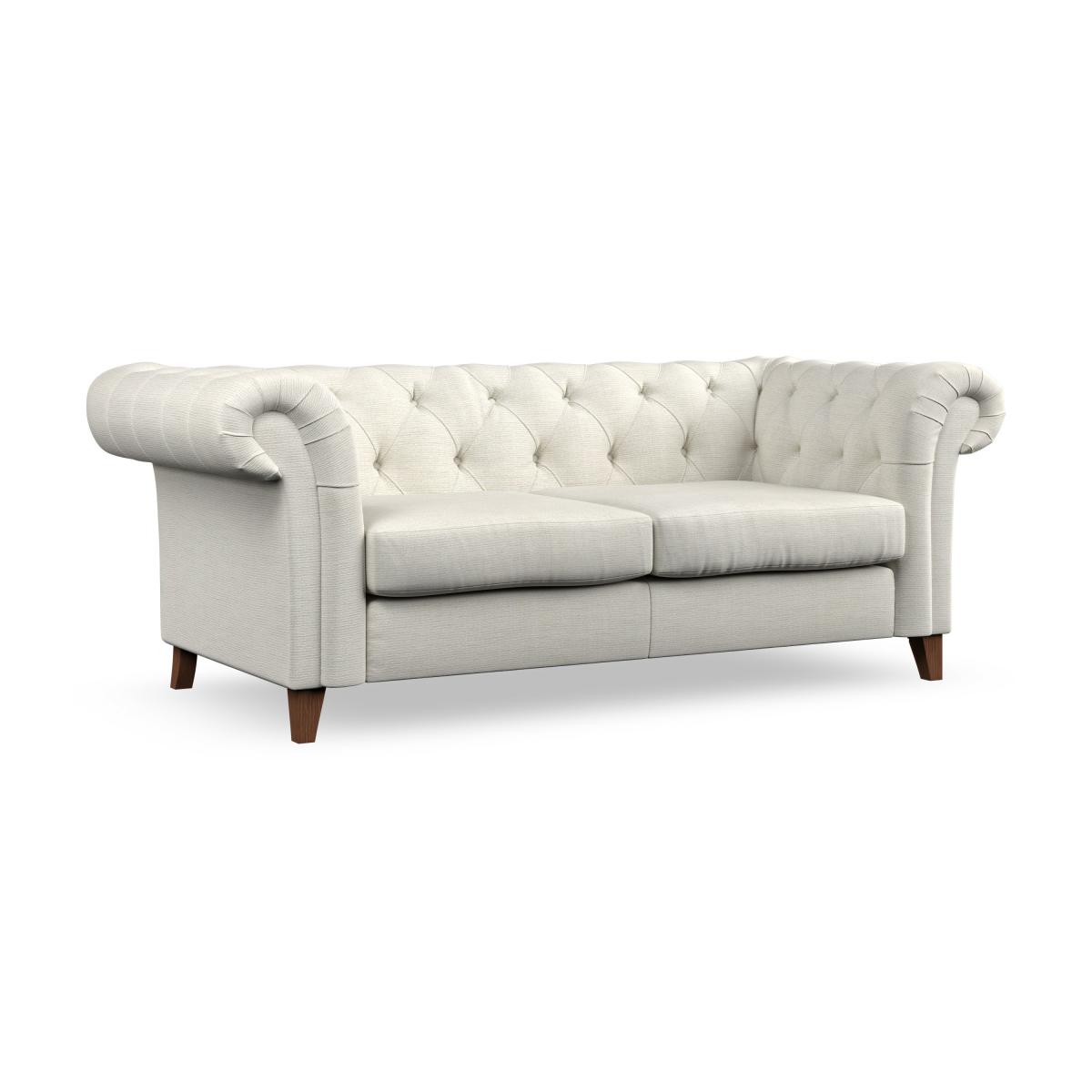 * Chesterfield style* Scroll arms* Serpentine seat springs* Choose your support, fabric and leg colour This sofa's authentic Chesterfield design showcases generously scrolled arms and deep buttoning detail, adding a refined touch to your home. Built with longevity in mind, the sofa features serpentine seat springs for long-lasting comfort and a Superloop sprung back for excellent support. You can choose between a supportive, easy-care foam seat or a more relaxed and inviting 'Qualofill Blue' fibre seat, crafted from 100% recycled polyester, including post-consumer and ocean plastics. The self-sewn seat cushions offer a more contemporary feel, while the hardwood legs, available in two attractive finishes, provide a bespoke touch and are easy to fit. Made to order, the Pimlico 3 Seater Sofa can be customised with a range of fabrics, colours, foot types, and fillings, allowing you to tailor it to your exact tastes and needs for a truly personalised and comfortable piece of furniture.