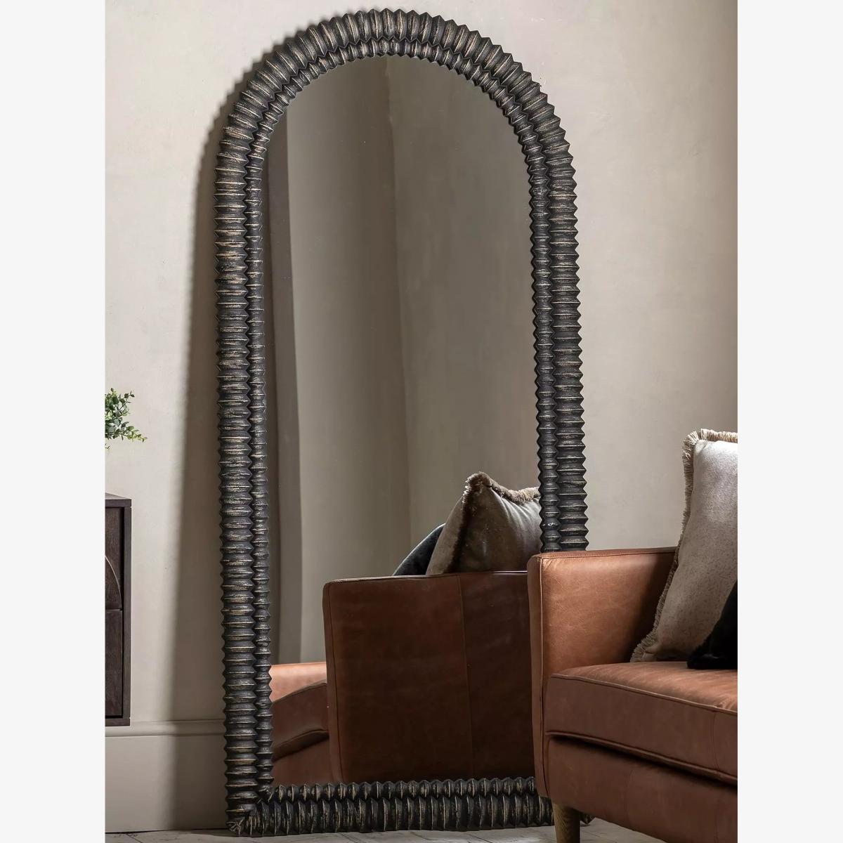 Elevate your decor with the unique charm of our arch-top leaner mirror, highlighted by a stunning 3D wooden etching style frame. The graceful arch design adds an elegant curve, while the intricate etching offers a textured, three-dimensional effect that catches the eye. The rich wood finish enhances the detailed craftsmanship, making this mirror a standout piece in any room. Perfect for leaning against a wall or as a striking design element, it combines functionality with artistic sophistication, adding timeless beauty and refined style to your living room, bedroom, or entryway. Elevate your decor with the unique charm of our arch-top leaner mirror, highlighted by a stunning 3D wooden etching style frame. The graceful arch design adds an elegant curve, while the intricate etching offers a textured, three-dimensional effect that catches the eye. The rich wood finish enhances the detailed craftsmanship, making this mirror a standout piece in any room. Perfect for leaning against a wall or as a striking design element, it combines functionality with artistic sophistication, adding timeless beauty and refined style to your living room, bedroom, or entryway.