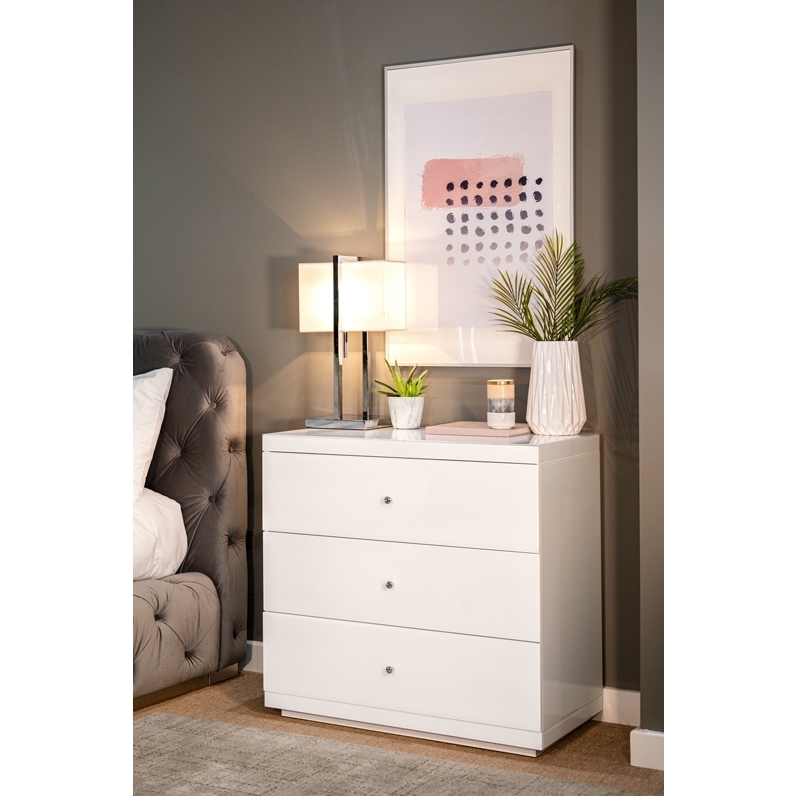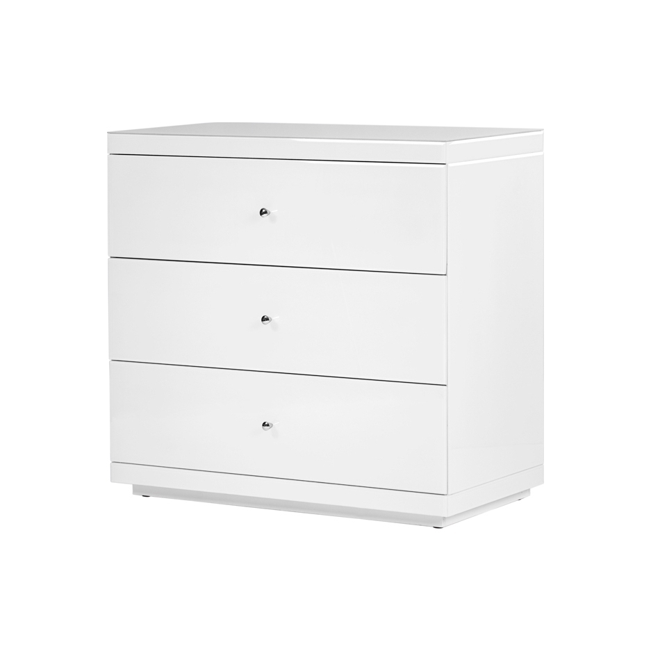 Timeless hand crafted three drawer chest. Toughened white glass with 4mm bevelled edge. Three spacious drawers. Solid timber frame. Metal drawer runners. Sleek conical handles. Part of our extensive Pimlico furniture collection.