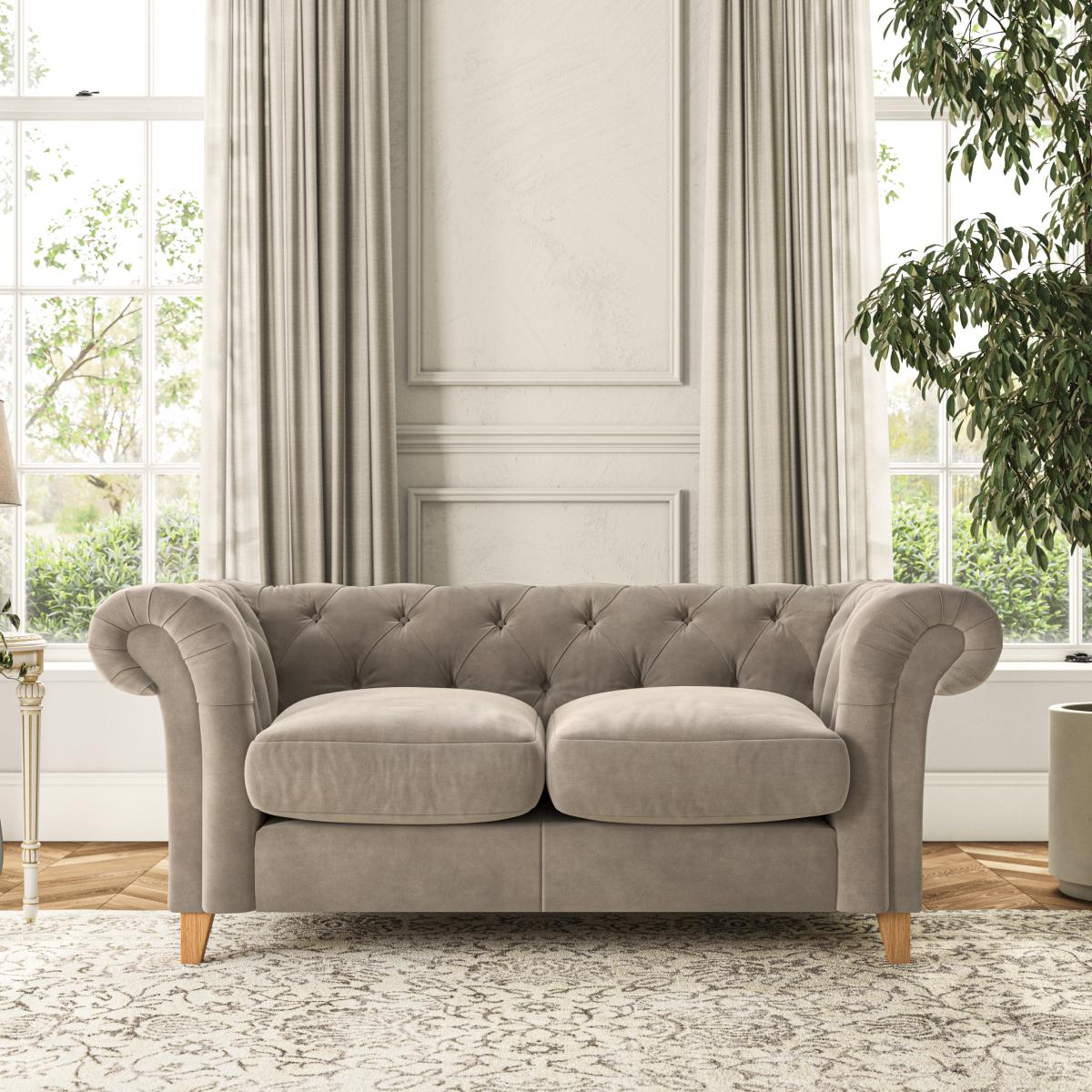 * Chesterfield style* Scroll arms* Serpentine seat springs* Choose your support, fabric and leg colour This sofa's traditional Chesterfield design, complete with generously scrolled arms and deep buttoning, brings an air of timeless elegance to your home. Built with longevity in mind, the sofa features serpentine seat springs for lasting comfort and a Superloop sprung back for excellent support. You can choose between a supportive foam seat for low-maintenance care or a more relaxed 'Qualofill Blue' fibre seat, crafted from 100% recycled polyester, including post-consumer and ocean plastics. The self-sewn seat cushions offer a more contemporary feel, while the hardwood legs, available in two finishes, provide a customisable and stylish touch, and are easy to fit. Made to order, the Pimlico Large 2 Seater Sofa can be tailored to your exact preferences, offering a wide selection of colours, fabrics, foot types, and fillings for a truly personalised and comfortable piece.
