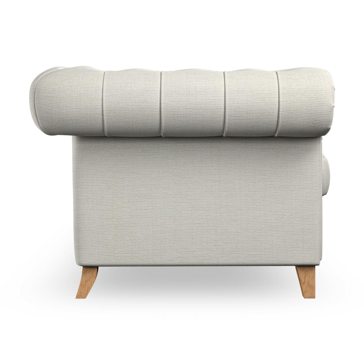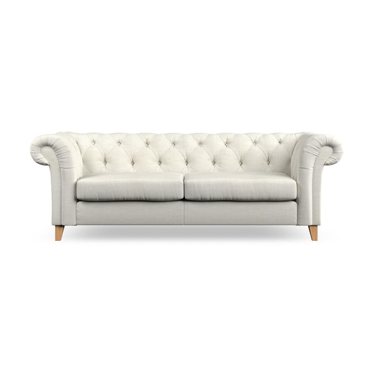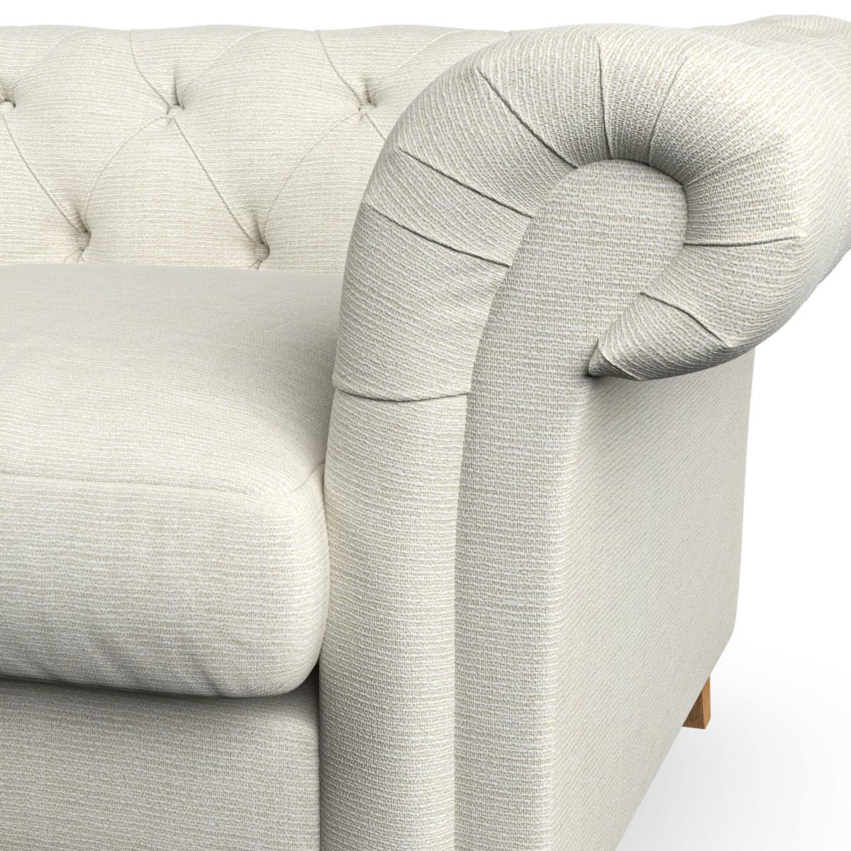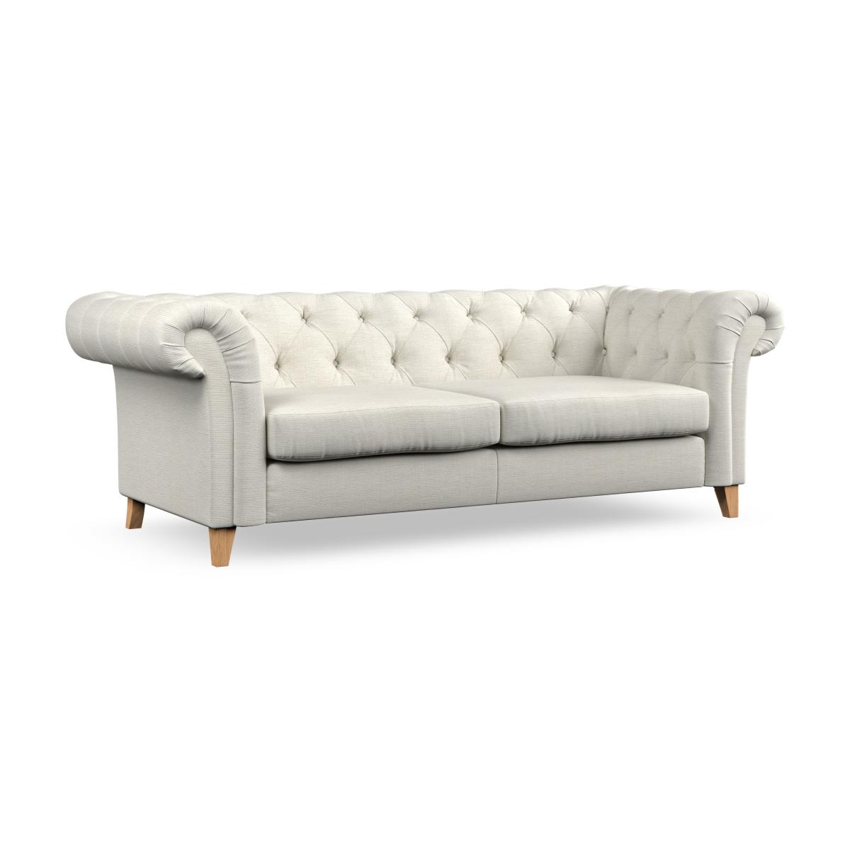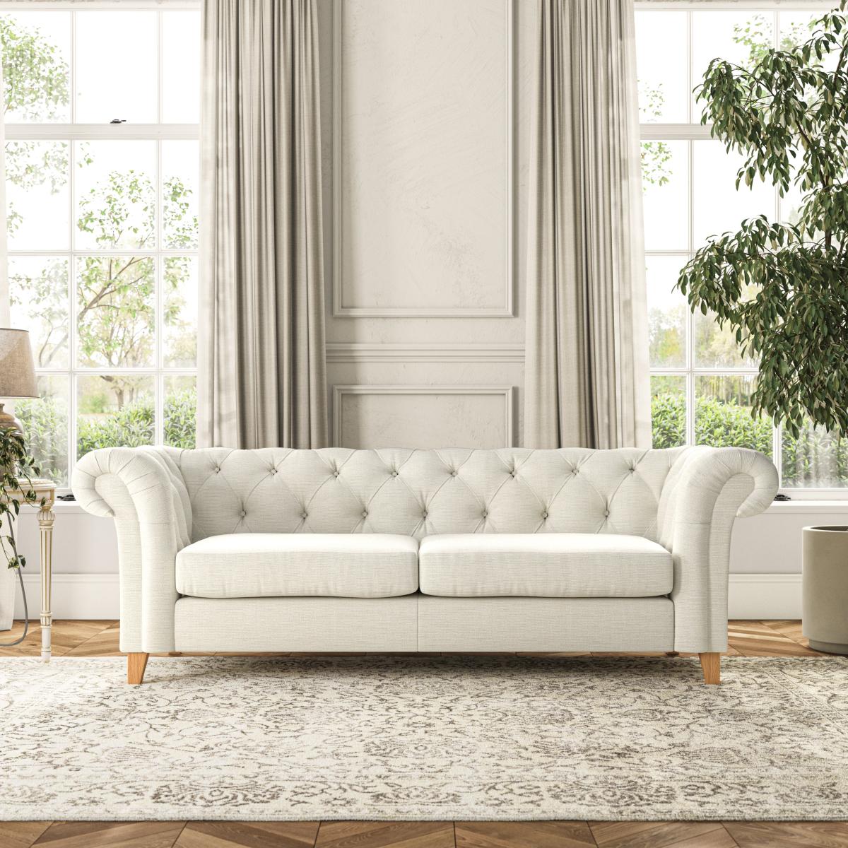 * Chesterfield style* Scroll arms* Serpentine seat springs* Choose your support, fabric and leg colour Featuring a classic Chesterfield design with generously scrolled arms and deep buttoning, this sofa adds a touch of elegance to any room. Designed with durability and comfort in mind, it comes with serpentine seat springs for long-lasting support and a Superloop sprung back for excellent back support. You can choose between a supportive, low-maintenance foam seat or the more relaxed 'Qualofill Blue' fibre seat, which is made from 100% recycled polyester, including post-consumer and ocean plastics. The self-sewn seat cushions provide a contemporary twist, while the hardwood legs, available in two finishes, offer a customisable touch and are easy to fit. Made to order, the Pimlico Large 3 Seater Sofa can be fully personalised with a wide range of fabrics, colours, foot types, and fillings, allowing you to create a stylish and comfortable centrepiece for your living space.