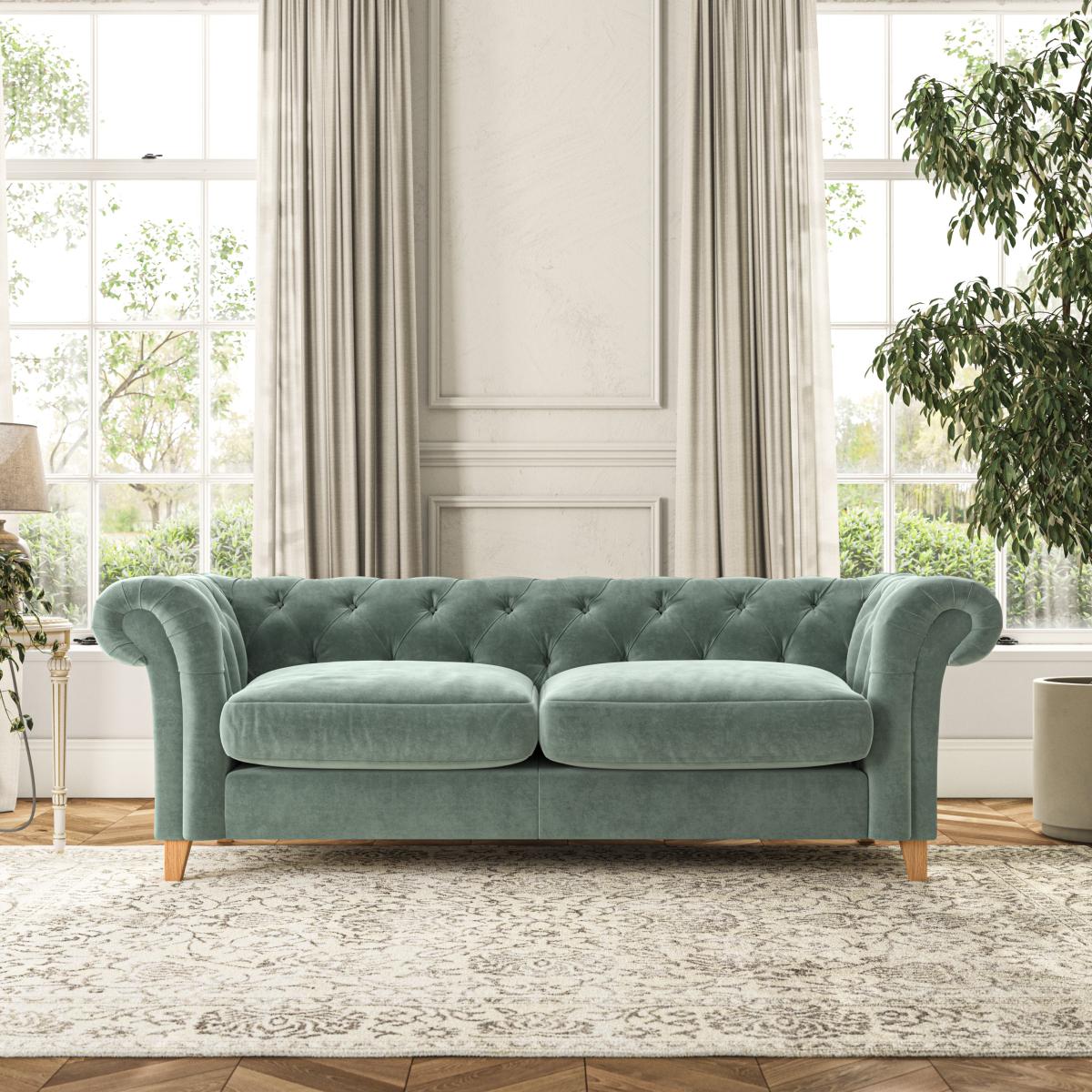 * Chesterfield style* Scroll arms* Serpentine seat springs* Choose your support, fabric and leg colour Featuring a classic Chesterfield design with generously scrolled arms and deep buttoning, this sofa adds a touch of elegance to any room. Designed with durability and comfort in mind, it comes with serpentine seat springs for long-lasting support and a Superloop sprung back for excellent back support. You can choose between a supportive, low-maintenance foam seat or the more relaxed 'Qualofill Blue' fibre seat, which is made from 100% recycled polyester, including post-consumer and ocean plastics. The self-sewn seat cushions provide a contemporary twist, while the hardwood legs, available in two finishes, offer a customisable touch and are easy to fit. Made to order, the Pimlico Large 3 Seater Sofa can be fully personalised with a wide range of fabrics, colours, foot types, and fillings, allowing you to create a stylish and comfortable centrepiece for your living space.