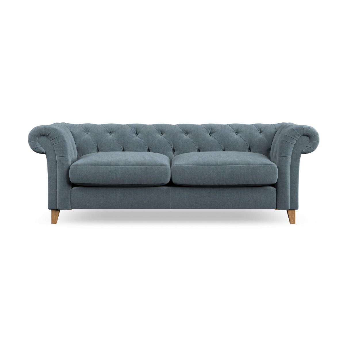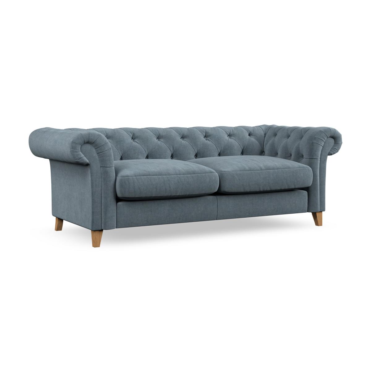 * Chesterfield style* Scroll arms* Serpentine seat springs* Choose your support, fabric and leg colour Featuring a classic Chesterfield design with generously scrolled arms and deep buttoning, this sofa adds a touch of elegance to any room. Designed with durability and comfort in mind, it comes with serpentine seat springs for long-lasting support and a Superloop sprung back for excellent back support. You can choose between a supportive, low-maintenance foam seat or the more relaxed 'Qualofill Blue' fibre seat, which is made from 100% recycled polyester, including post-consumer and ocean plastics. The self-sewn seat cushions provide a contemporary twist, while the hardwood legs, available in two finishes, offer a customisable touch and are easy to fit. Made to order, the Pimlico Large 3 Seater Sofa can be fully personalised with a wide range of fabrics, colours, foot types, and fillings, allowing you to create a stylish and comfortable centrepiece for your living space.