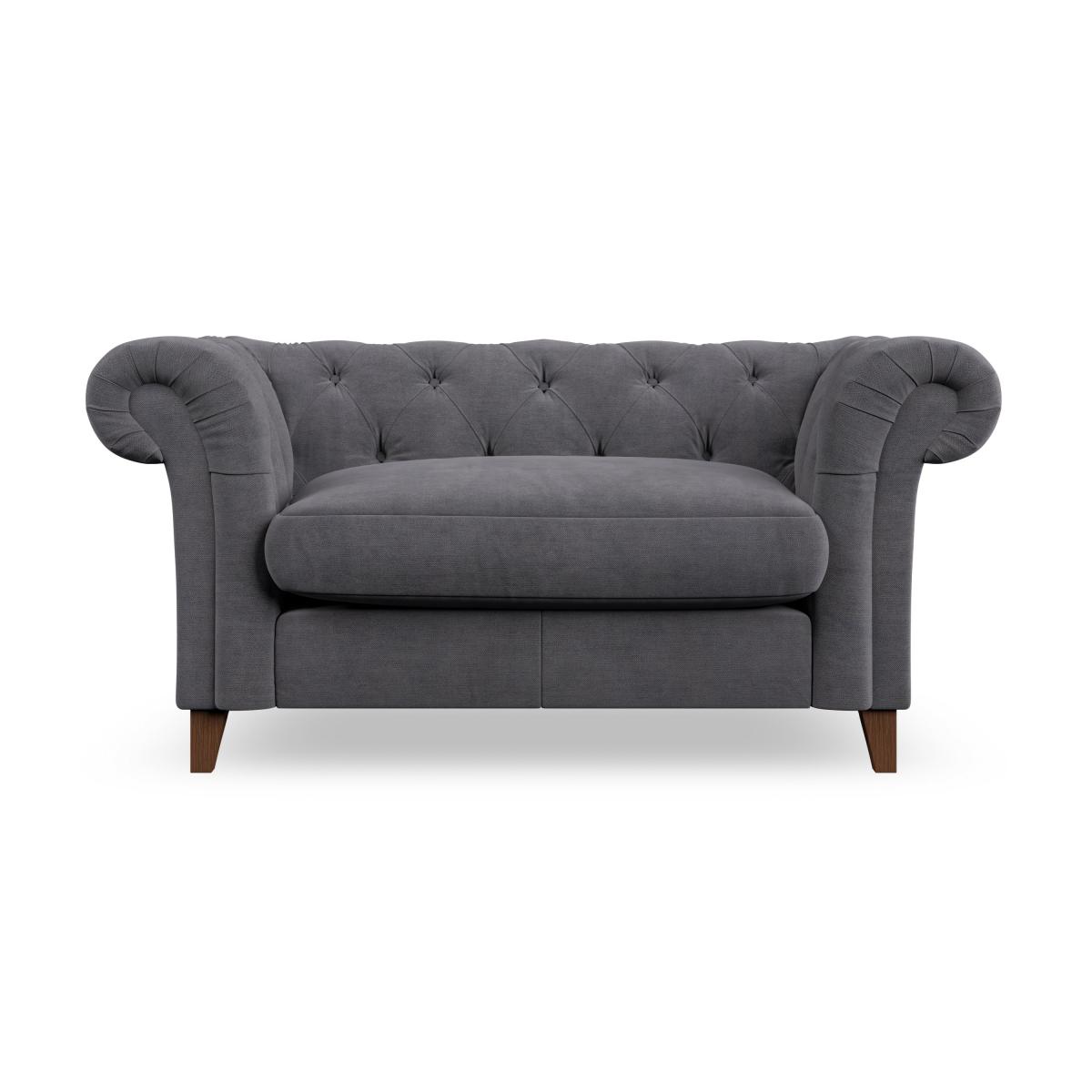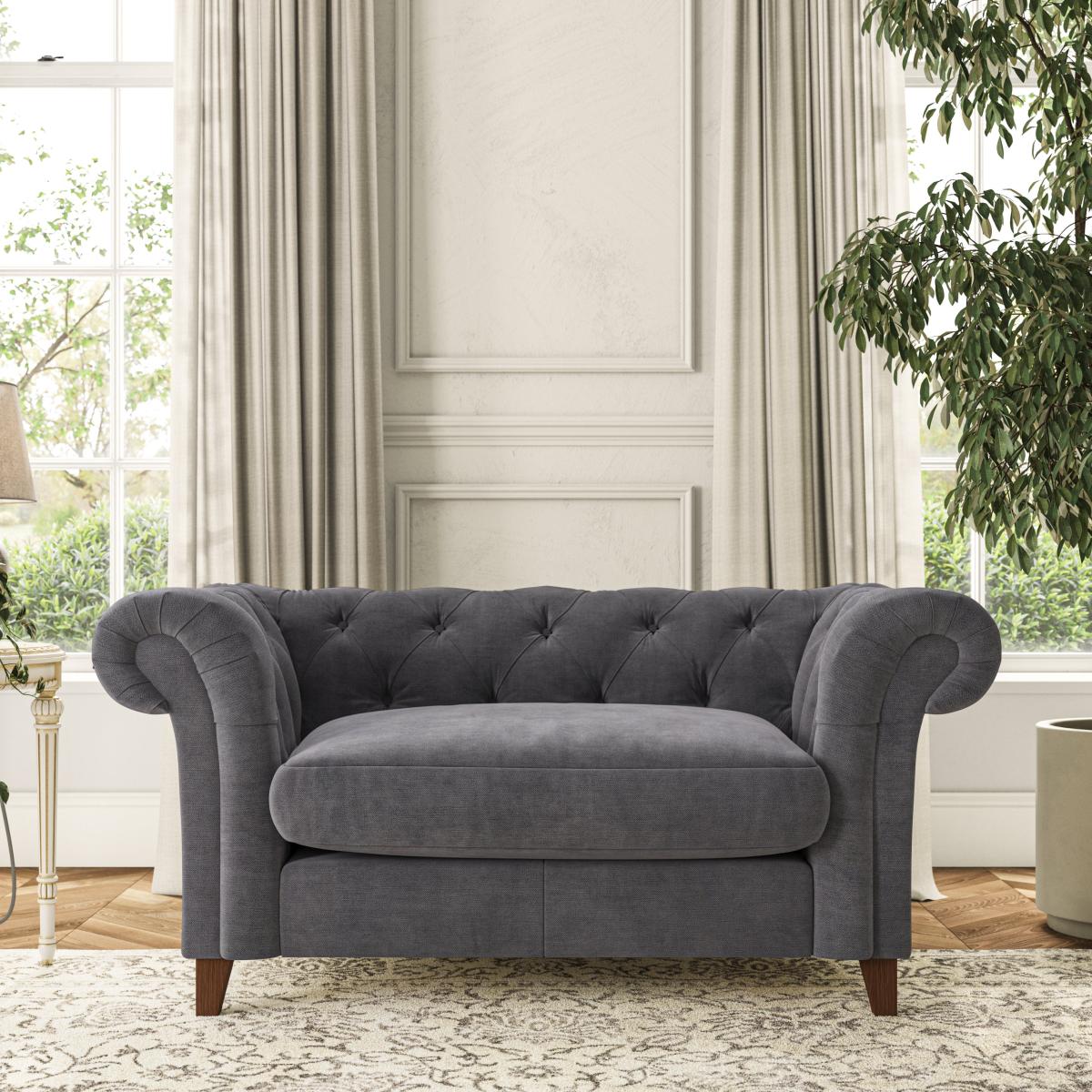 * Chesterfield style* Scroll arms* Serpentine seat springs* Choose your support, fabric and leg colour Featuring an authentic Chesterfield design with generously scrolled arms and striking deep buttoning, this chair adds a touch of sophistication to your living space. Built for both style and durability, it includes serpentine seat springs for lasting comfort and a Superloop sprung back for superior support. You can choose between a supportive, low-maintenance foam seat or a more relaxed 'Qualofill Blue' fibre seat, which is made from 100% recycled polyester, including post-consumer and ocean plastics. The self-sewn seat cushions lend a contemporary edge to the traditional design, while the hardwood legs, available in two finishes, offer a customisable touch and are easy to fit. Made to order, the Pimlico Snuggle Chair can be tailored to your preferences with a wide selection of colours, fabrics, foot types, and fillings, allowing you to create a truly personalised piece that enhances the comfort and style of your home.