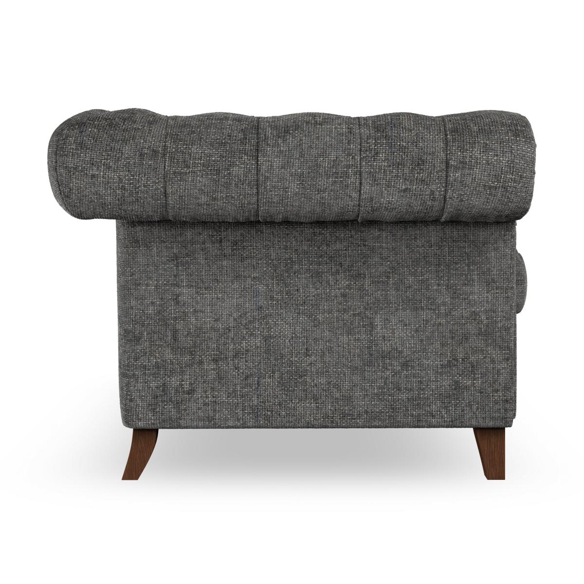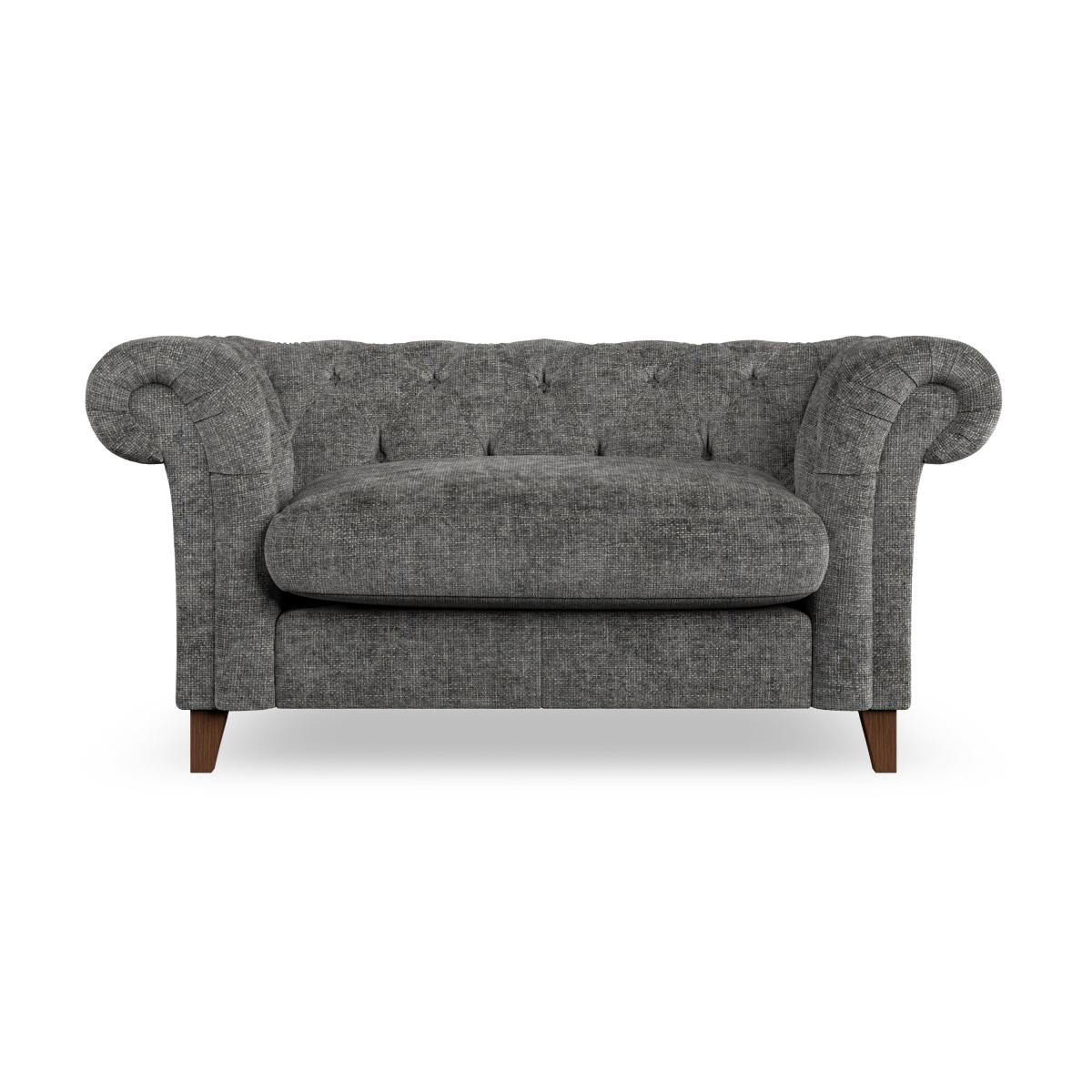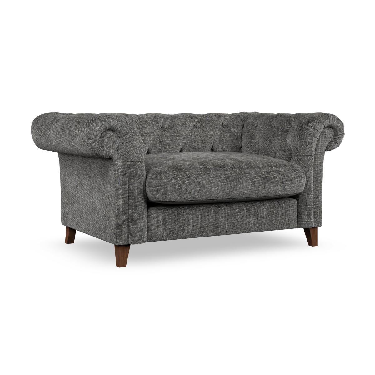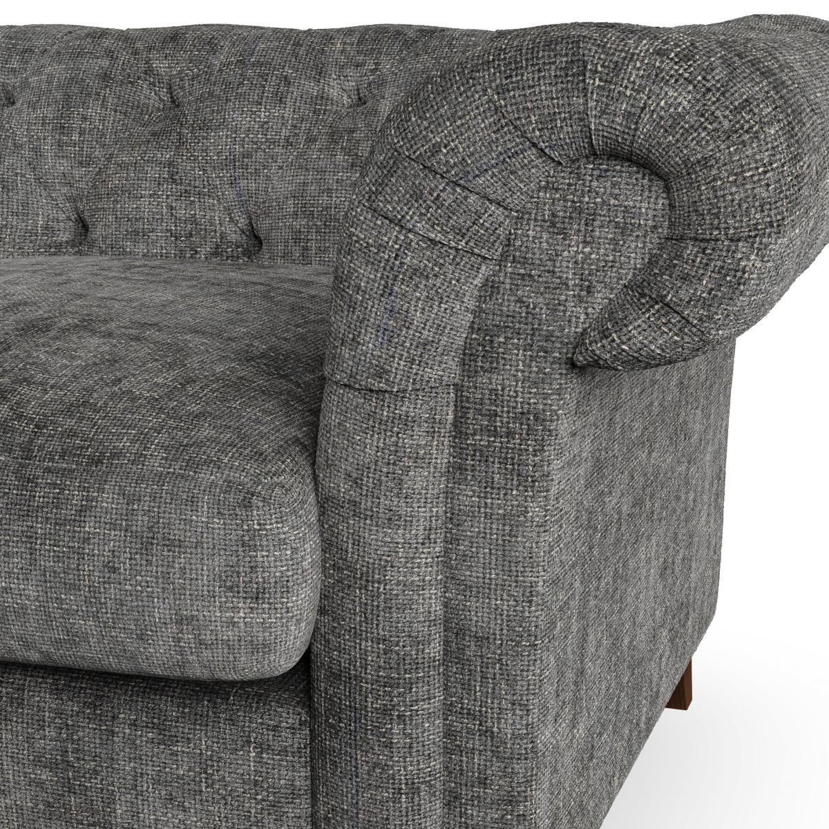 * Chesterfield style* Scroll arms* Serpentine seat springs* Choose your support, fabric and leg colour Featuring an authentic Chesterfield design with generously scrolled arms and striking deep buttoning, this chair adds a touch of sophistication to your living space. Built for both style and durability, it includes serpentine seat springs for lasting comfort and a Superloop sprung back for superior support. You can choose between a supportive, low-maintenance foam seat or a more relaxed 'Qualofill Blue' fibre seat, which is made from 100% recycled polyester, including post-consumer and ocean plastics. The self-sewn seat cushions lend a contemporary edge to the traditional design, while the hardwood legs, available in two finishes, offer a customisable touch and are easy to fit. Made to order, the Pimlico Snuggle Chair can be tailored to your preferences with a wide selection of colours, fabrics, foot types, and fillings, allowing you to create a truly personalised piece that enhances the comfort and style of your home.