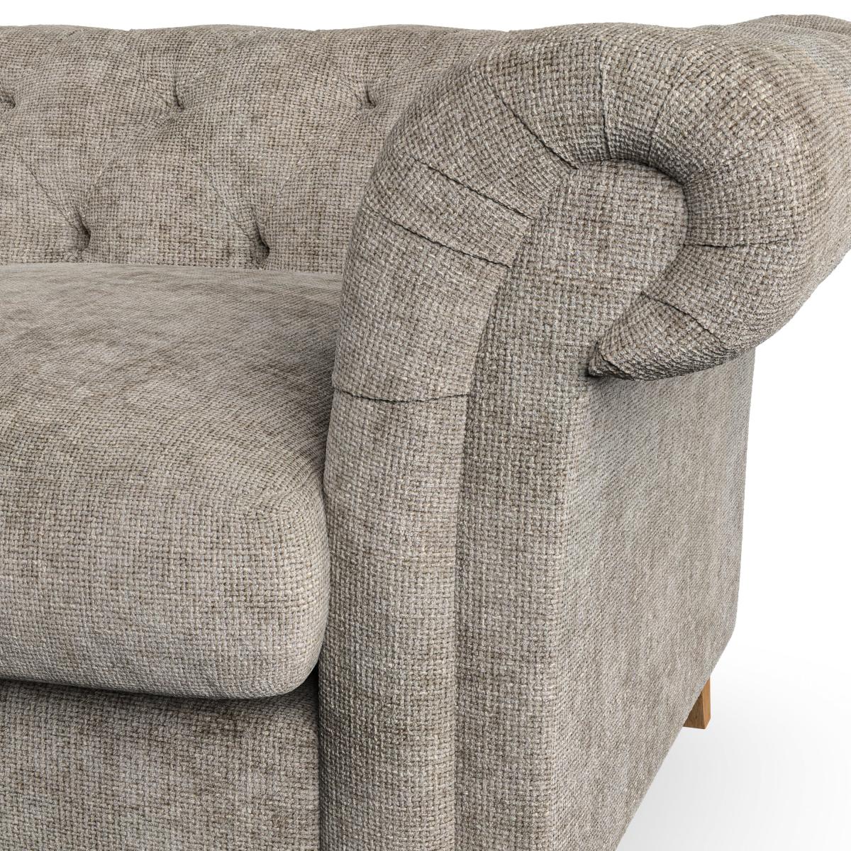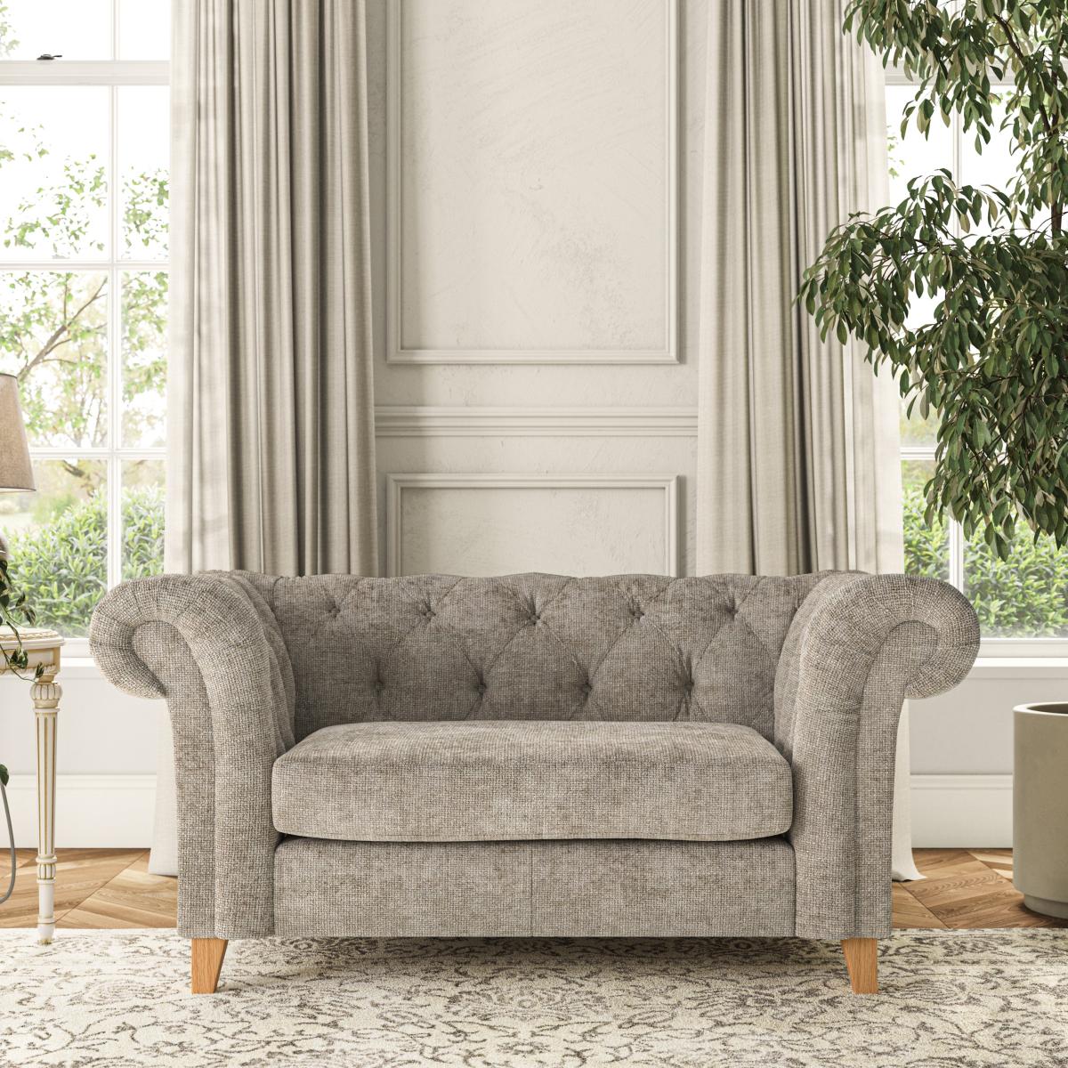 * Chesterfield style* Scroll arms* Serpentine seat springs* Choose your support, fabric and leg colour Featuring an authentic Chesterfield design with generously scrolled arms and striking deep buttoning, this chair adds a touch of sophistication to your living space. Built for both style and durability, it includes serpentine seat springs for lasting comfort and a Superloop sprung back for superior support. You can choose between a supportive, low-maintenance foam seat or a more relaxed 'Qualofill Blue' fibre seat, which is made from 100% recycled polyester, including post-consumer and ocean plastics. The self-sewn seat cushions lend a contemporary edge to the traditional design, while the hardwood legs, available in two finishes, offer a customisable touch and are easy to fit. Made to order, the Pimlico Snuggle Chair can be tailored to your preferences with a wide selection of colours, fabrics, foot types, and fillings, allowing you to create a truly personalised piece that enhances the comfort and style of your home.