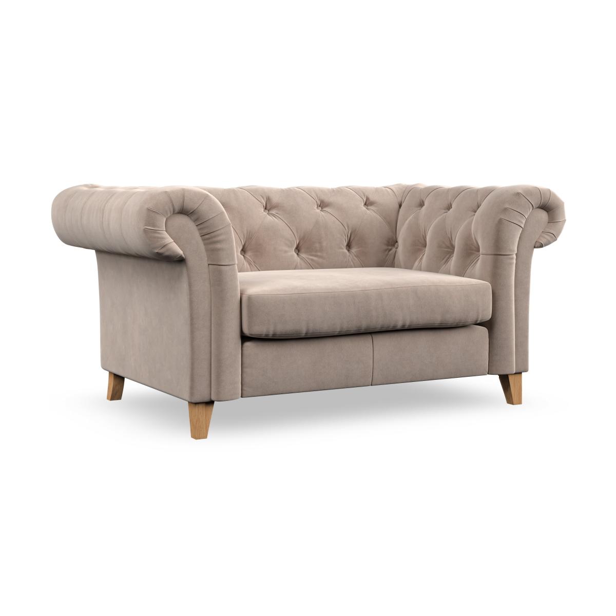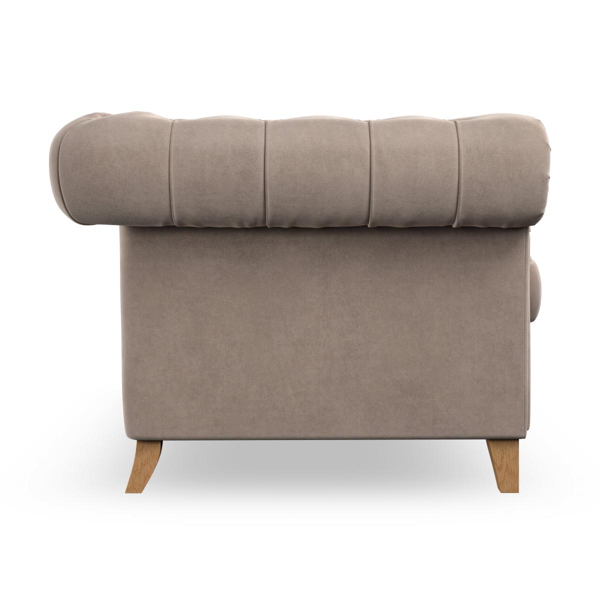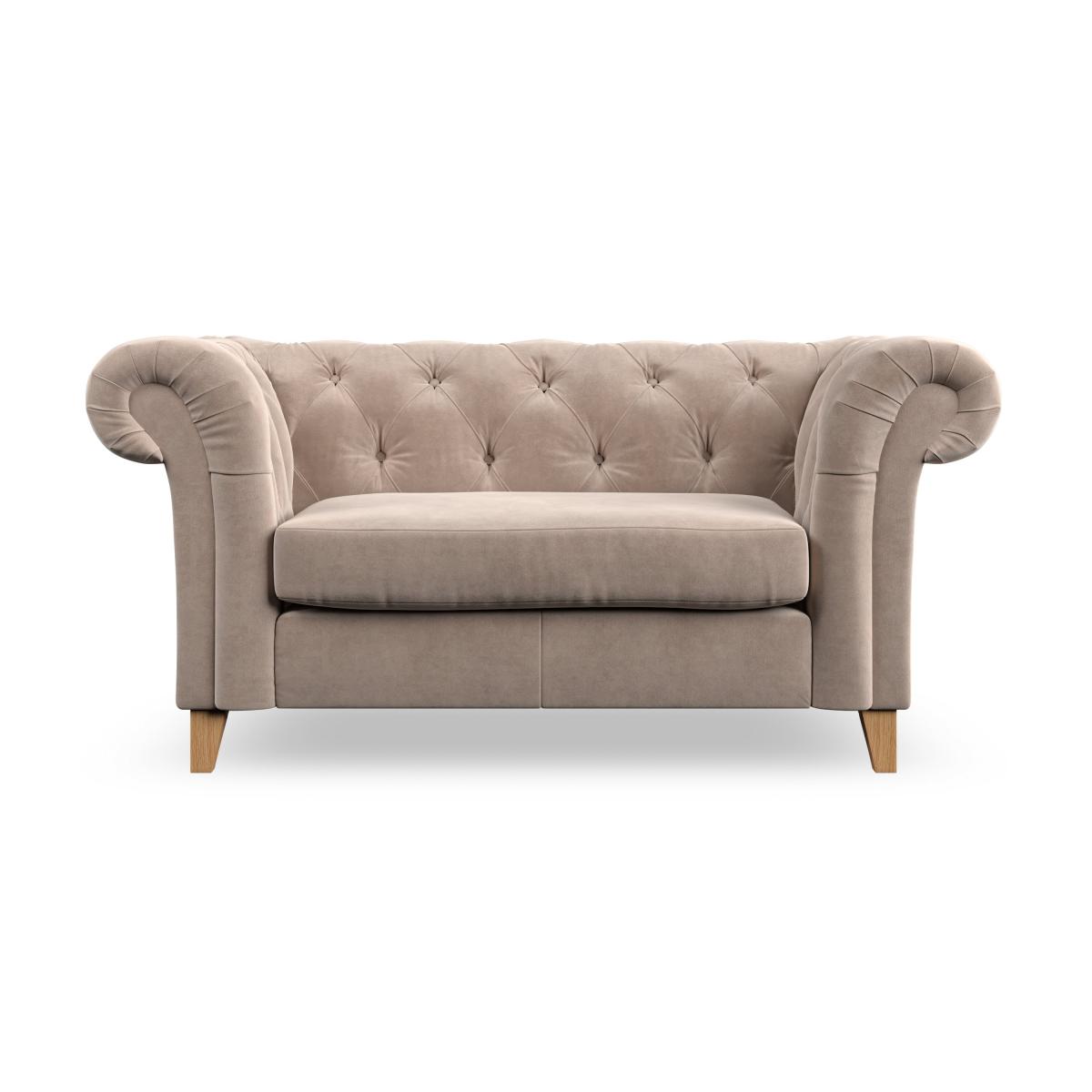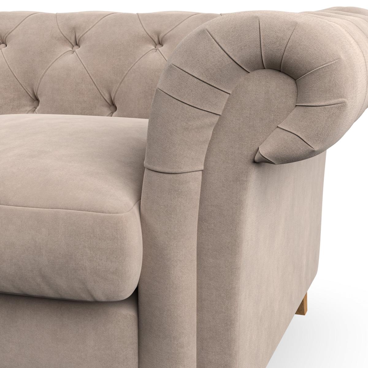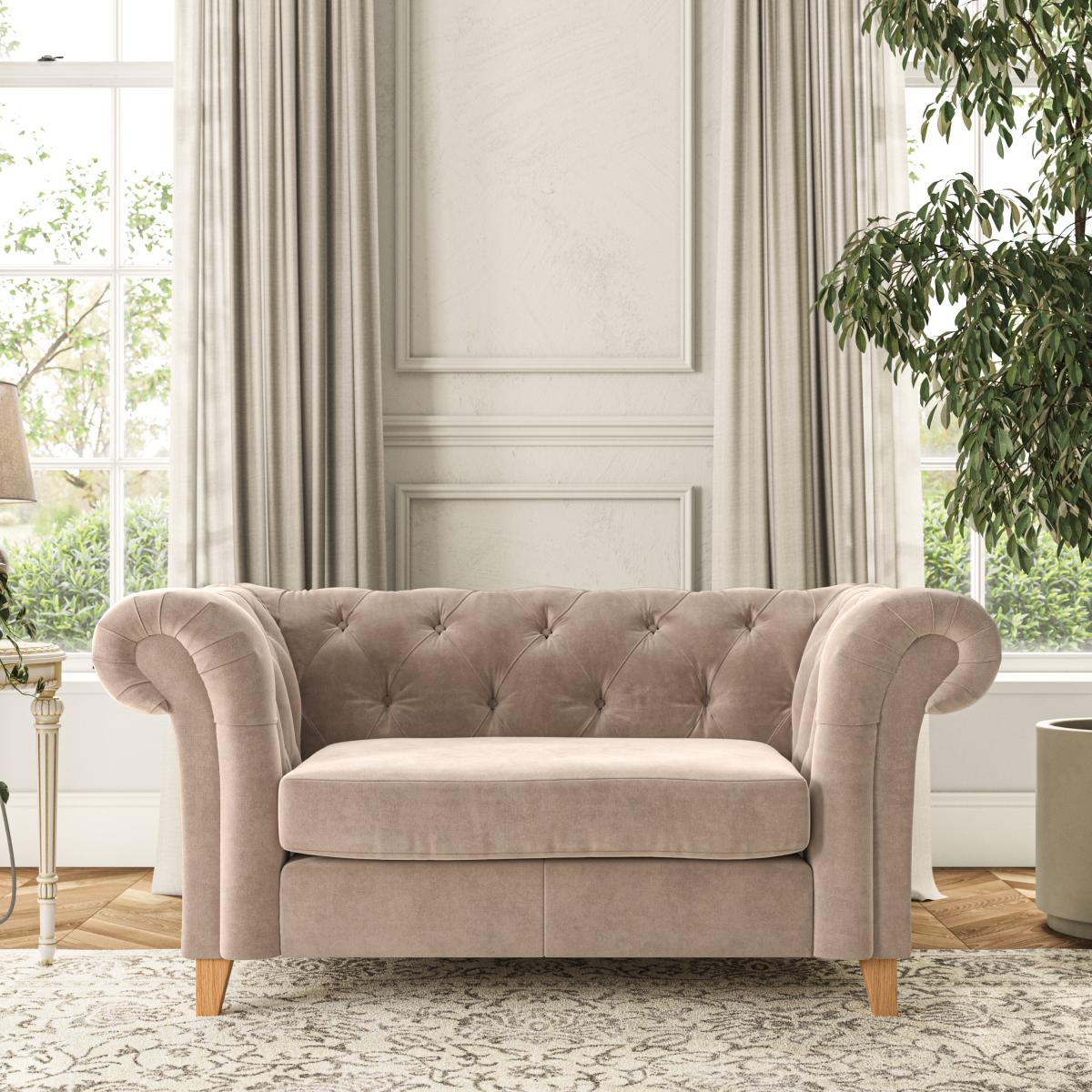 * Chesterfield style* Scroll arms* Serpentine seat springs* Choose your support, fabric and leg colour Featuring an authentic Chesterfield design with generously scrolled arms and striking deep buttoning, this chair adds a touch of sophistication to your living space. Built for both style and durability, it includes serpentine seat springs for lasting comfort and a Superloop sprung back for superior support. You can choose between a supportive, low-maintenance foam seat or a more relaxed 'Qualofill Blue' fibre seat, which is made from 100% recycled polyester, including post-consumer and ocean plastics. The self-sewn seat cushions lend a contemporary edge to the traditional design, while the hardwood legs, available in two finishes, offer a customisable touch and are easy to fit. Made to order, the Pimlico Snuggle Chair can be tailored to your preferences with a wide selection of colours, fabrics, foot types, and fillings, allowing you to create a truly personalised piece that enhances the comfort and style of your home.