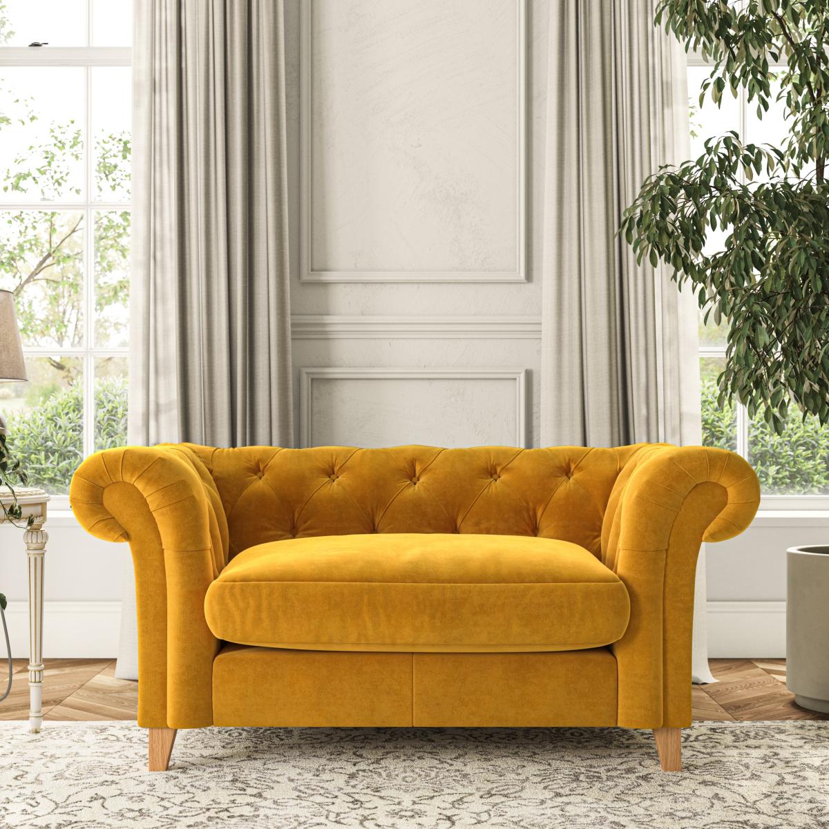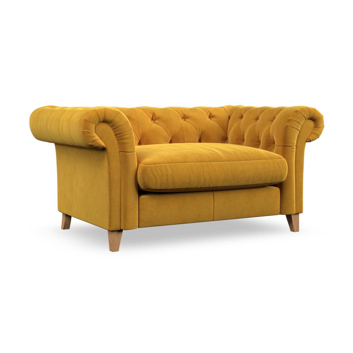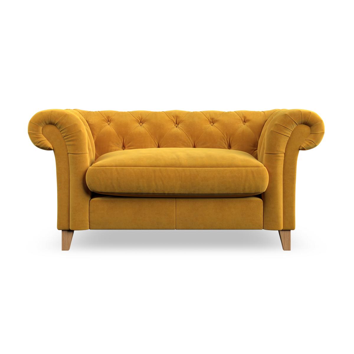 * Chesterfield style* Scroll arms* Serpentine seat springs* Choose your support, fabric and leg colour Featuring an authentic Chesterfield design with generously scrolled arms and striking deep buttoning, this chair adds a touch of sophistication to your living space. Built for both style and durability, it includes serpentine seat springs for lasting comfort and a Superloop sprung back for superior support. You can choose between a supportive, low-maintenance foam seat or a more relaxed 'Qualofill Blue' fibre seat, which is made from 100% recycled polyester, including post-consumer and ocean plastics. The self-sewn seat cushions lend a contemporary edge to the traditional design, while the hardwood legs, available in two finishes, offer a customisable touch and are easy to fit. Made to order, the Pimlico Snuggle Chair can be tailored to your preferences with a wide selection of colours, fabrics, foot types, and fillings, allowing you to create a truly personalised piece that enhances the comfort and style of your home.