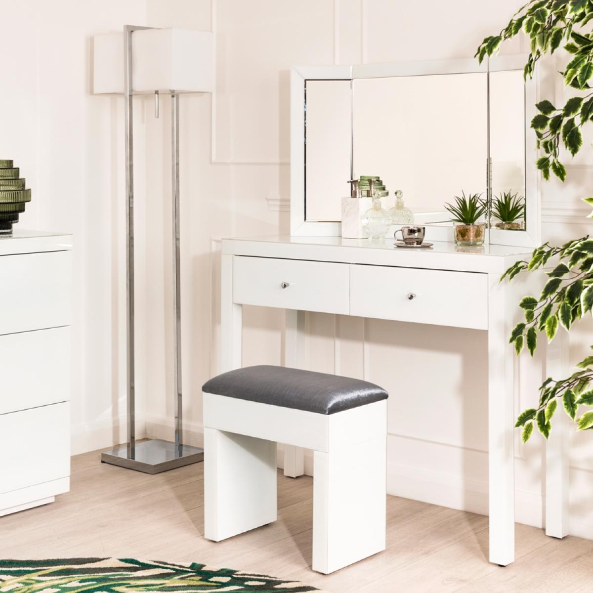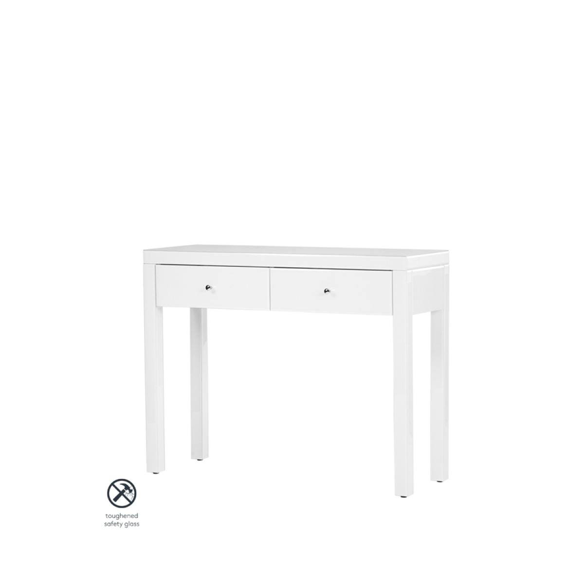 Timeless hand crafted dressing table. Toughened white glass with 4mm bevelled edge. Two spacious drawers. Solid timber frame. Metal drawer runners. Sleek conical handles. Part of our extensive Pimlico furniture collection.