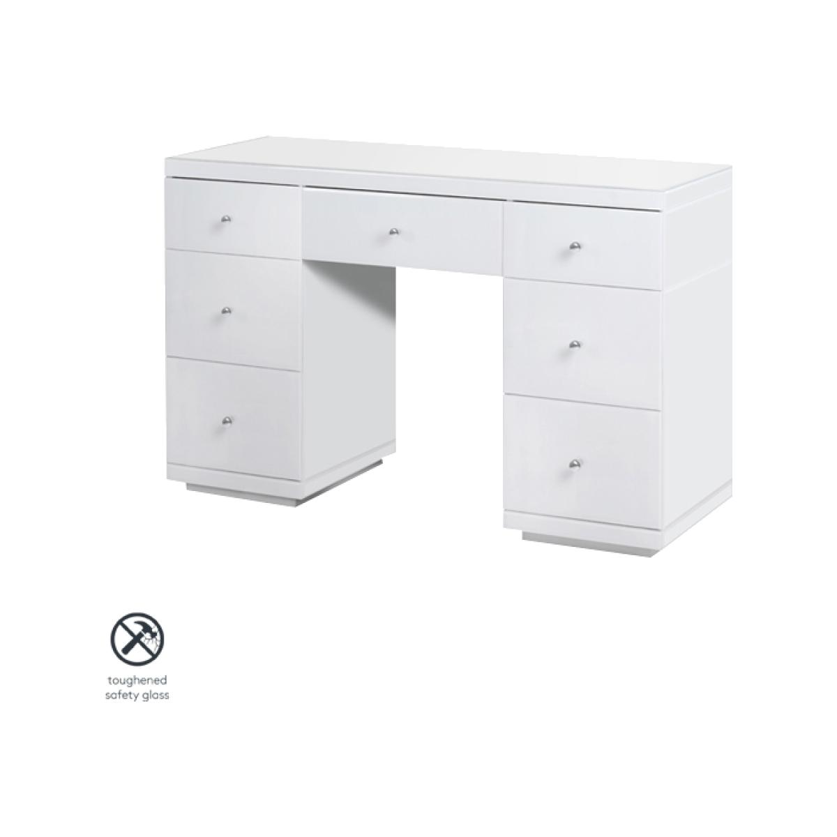Timeless hand crafted dressing table. Toughened white glass with 4mm bevelled edge. Seven spacious drawers. Solid timber frame. Metal drawer runners. Sleek conical handles. This item arrives in 3 different parts that require simple assembly (2 persons required).