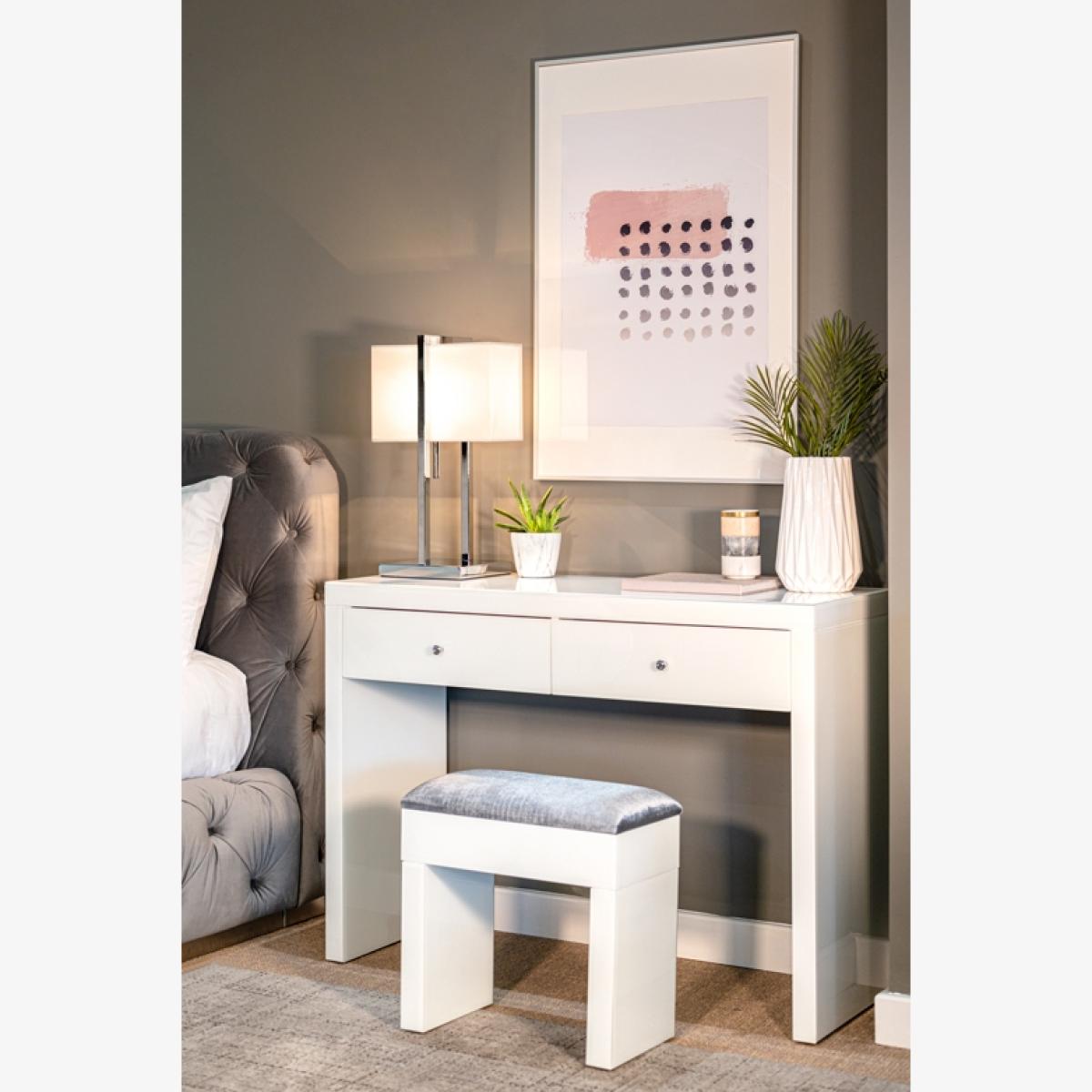 Timeless hand-crafted stool. Toughened white glass with 4mm bevelled edge. Silver velvet upholstery fabric. Solid timber frame. Minimal assembly required. Dressing table and other items are not included.