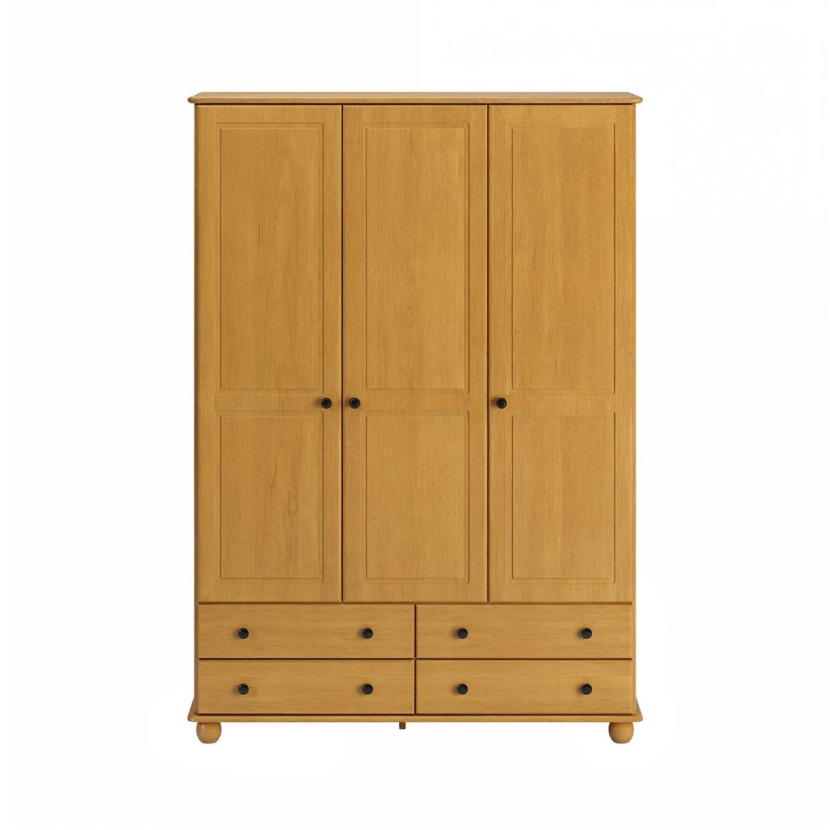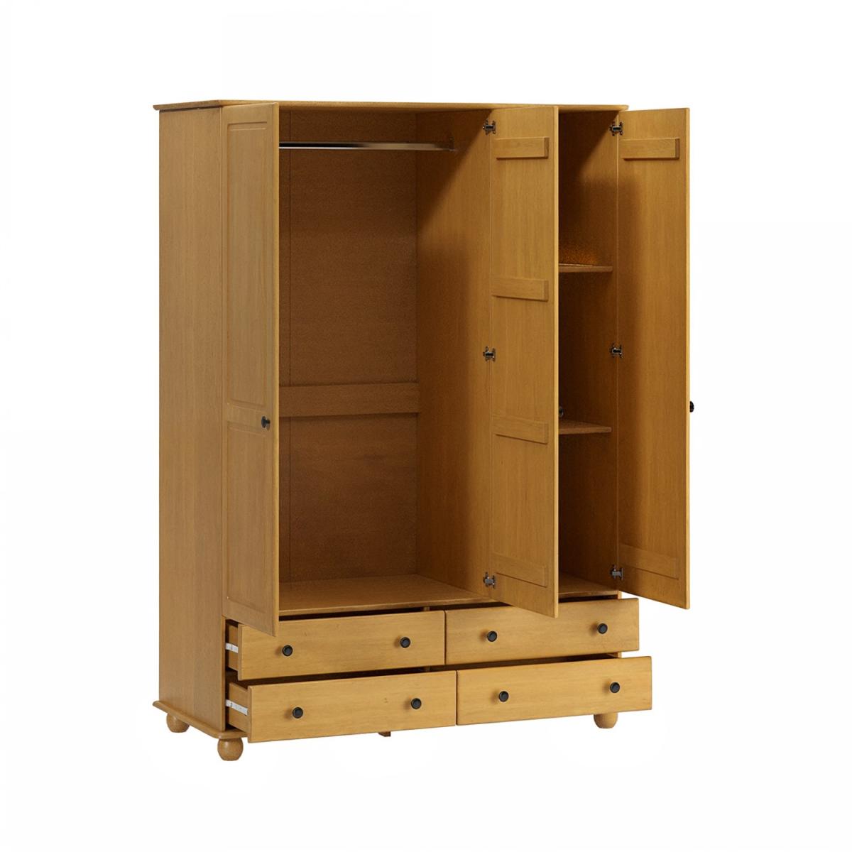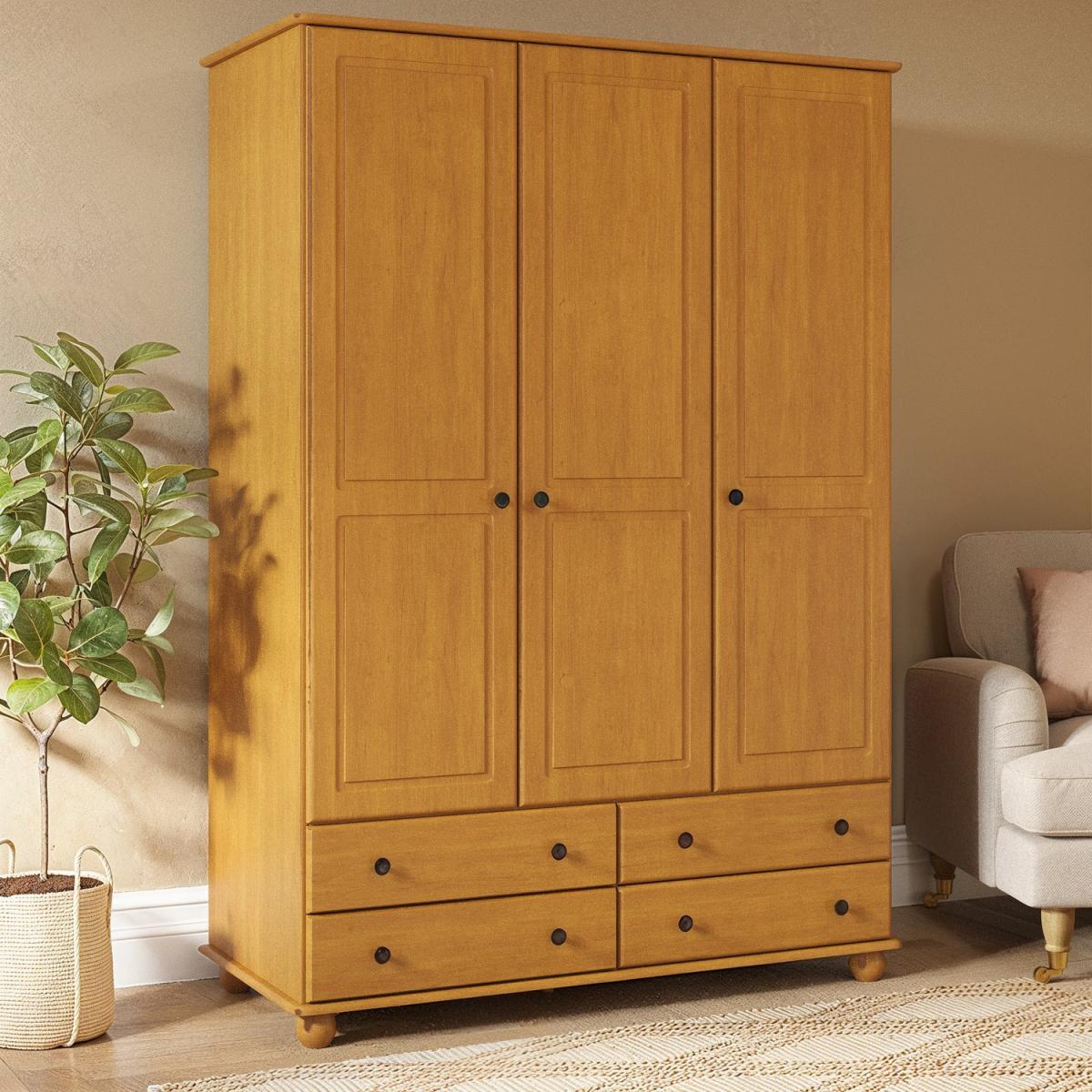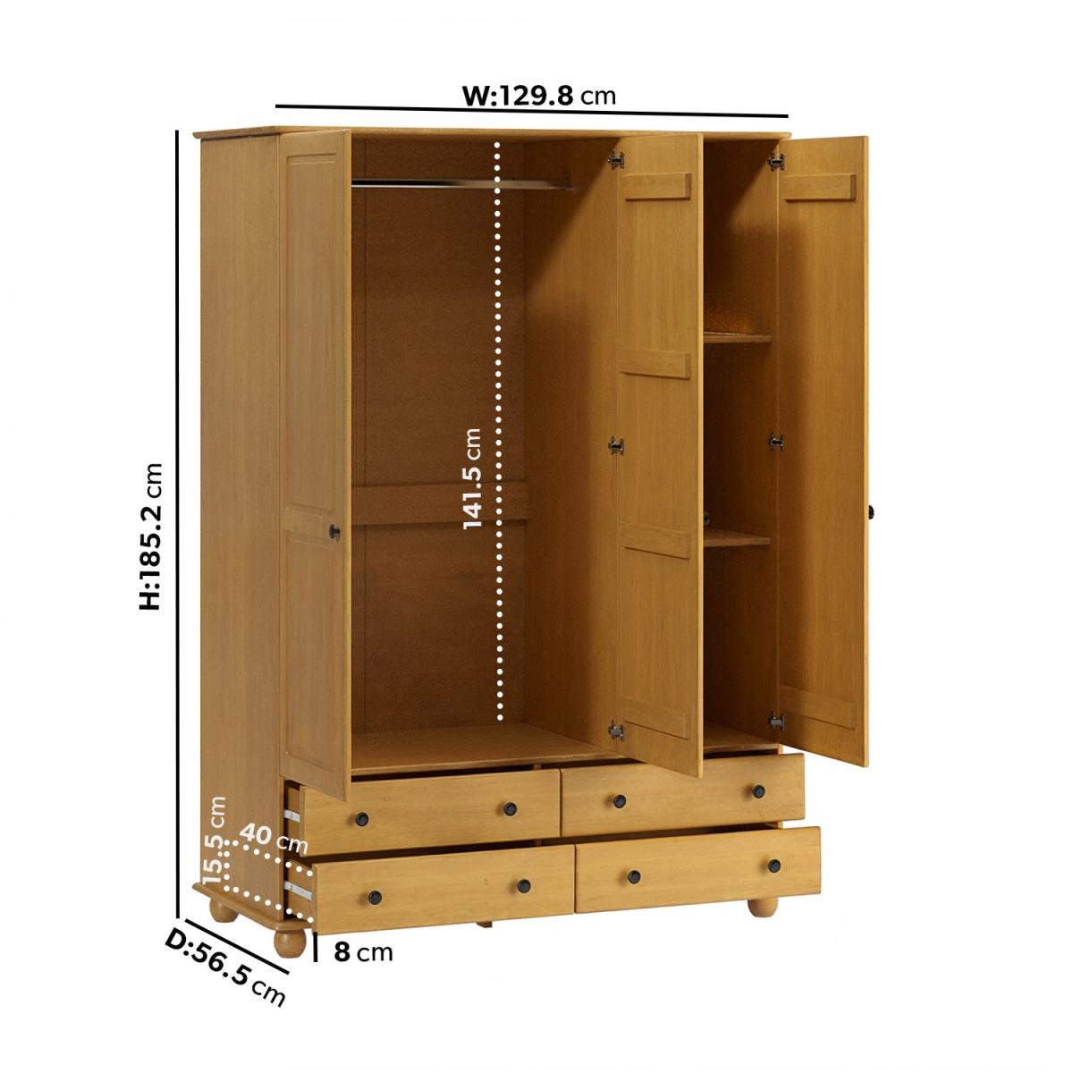 The Hampton Pine 3 door triple wardrobe is meticulously crafted from solid pine, combining elegance with durability. Its blend of classic and contemporary design is enhanced by rustic metal handles. Store your clothes and essentials in style with the Hampton three-door wardrobe. The double doors open to reveal a generous hanging space, while a third door conceals three shelves. Alongside the spacious storage behind each door, this piece also includes four drawers, perfect for shoes or accessories. Dimensions: W129.8 x D56.5 x H185.2 cm Weight: 67.6 kg Number of drawers: 4 Drawer dimensions: W61.8 x D40 x H15.5 cm Runners: Wooden Colour: Brown Finish: Natural Material: Solid pine wood and MDF Assembly required: Yes Packed dimensions: Box 1: W146.5 x D61.6 x H11.1 cm, Box 2: W179 x D57.5 x H6.1 cm, Box 3- W148.5 x D44.6 x H8.1 cm