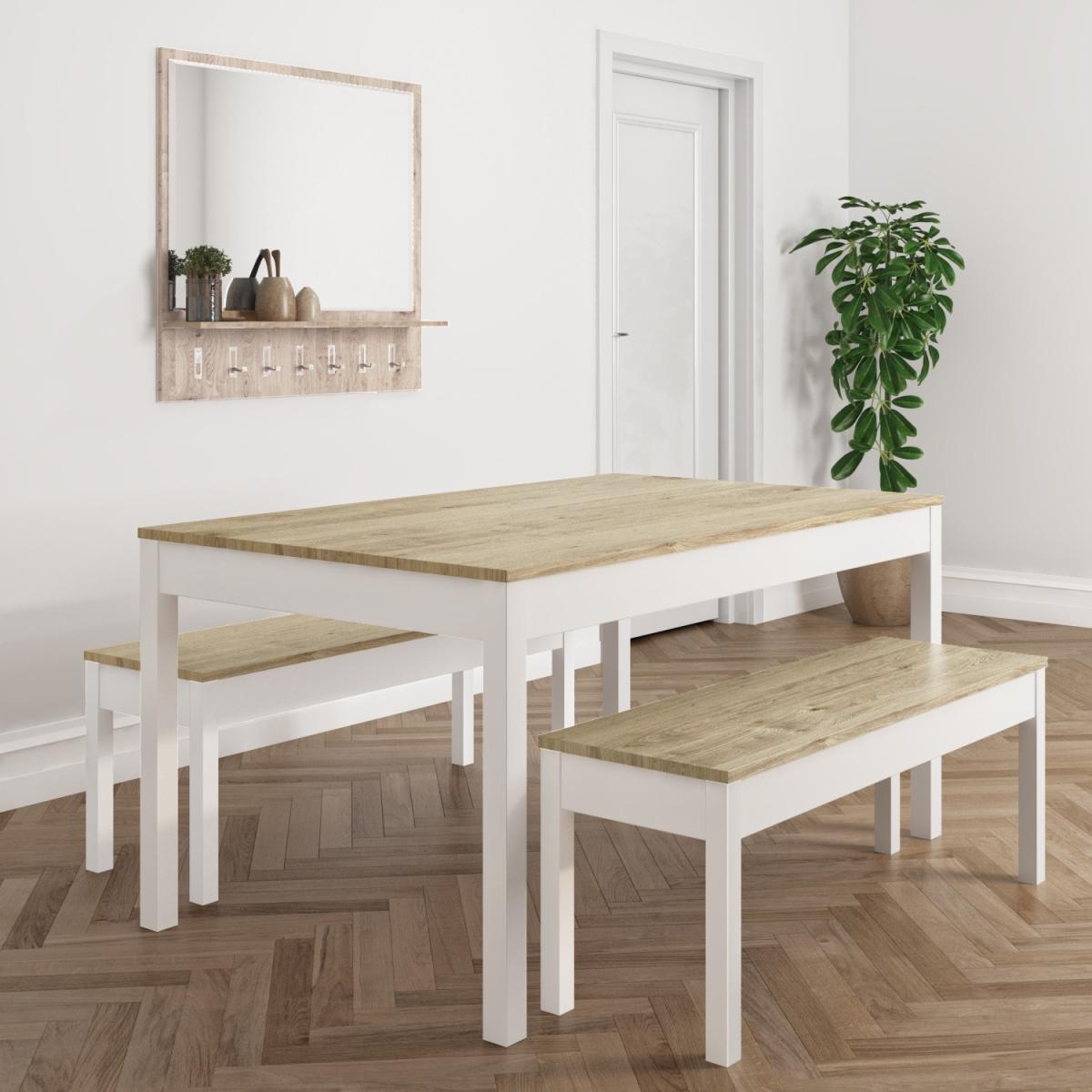 Features we love Charming country yet modern dining table and; benches. Highly durable construction made from solid pine. Comfortably seats 4 people. perfect for family dining. Family-friendly waxed finish with white painted frames. Space-saving the benches tuck easily under the table. . This bundle includes. White and Solid Pine Dining Table - Seats 6 - Emerson. 2 x White and Solid Pine Dining Benches - Seat 2 - Emerson All about me. Understated and timeless. This Emerson dining set makes a stylish addition to any dining space thanks to the waxed pine tops and white painted frames. It’ll suit both modern and traditional settings. It's perfect for cosy family dining. The benches make a fab alternative to chairs too. It’s easy to clean and maintain too which means it'll continue to look good for a long time. Need to know. Table dimensions. W152 x D92 x H76 cm Each bench dimensions. W120 x D38 x H46 cm Number of benches. 2 Table weight. 23kg Bench weight. 12kg Table seats. 6 Each bench seats. Up to 6 Colour. White and natural Finish. Painted and waxed tops Material. Solid pine Assembly required. Yes.