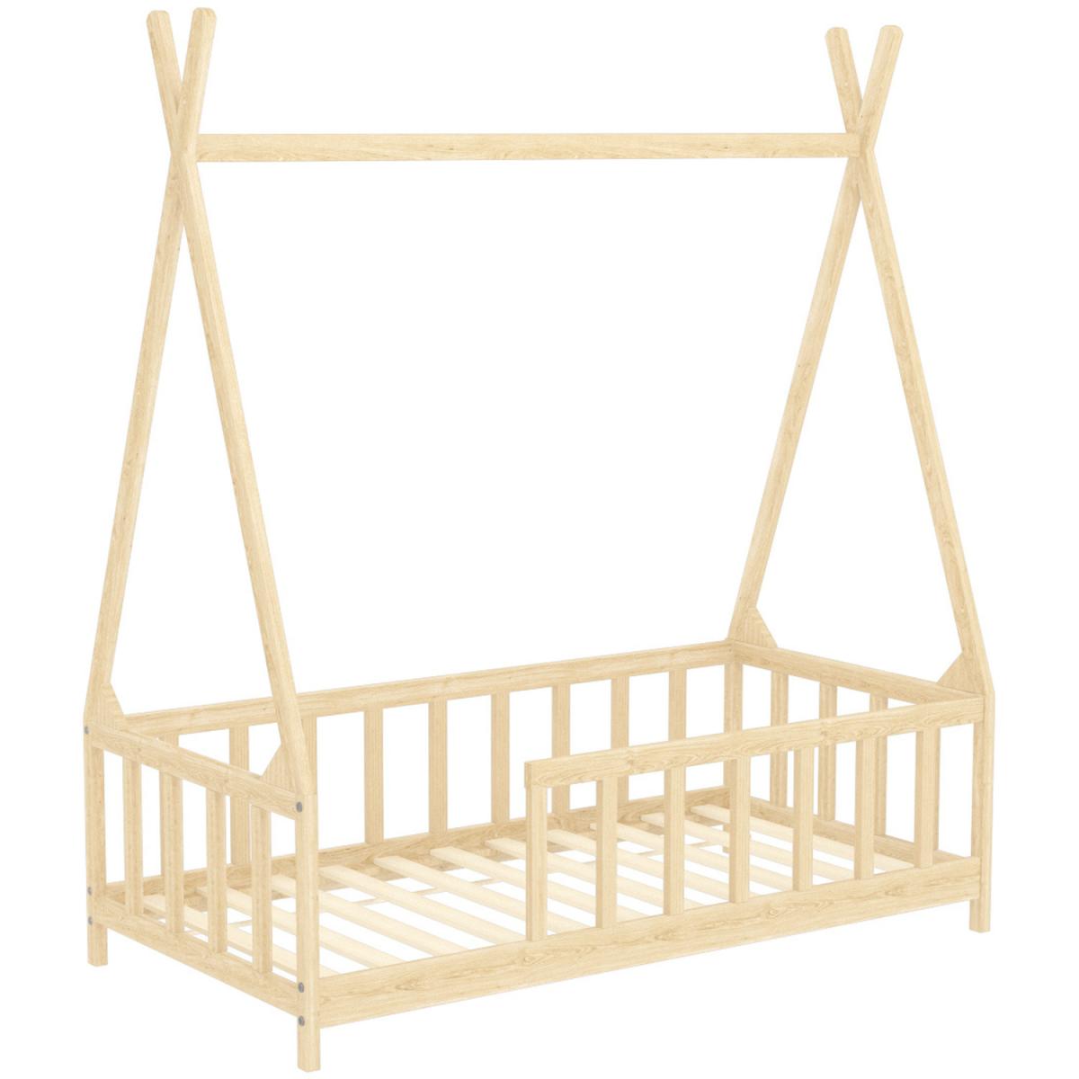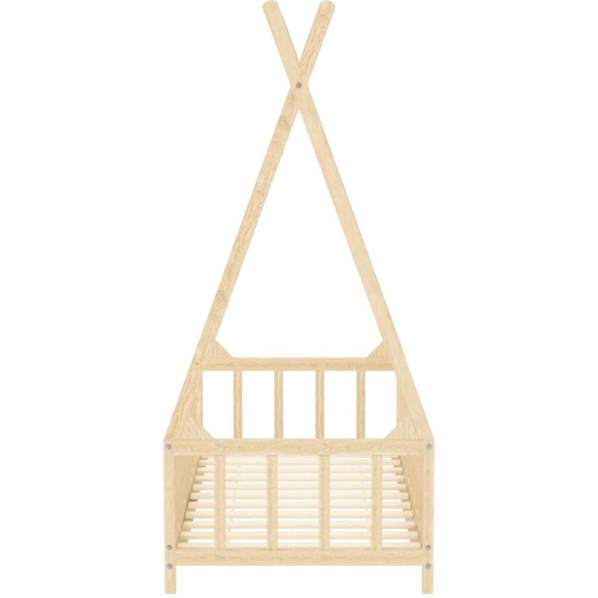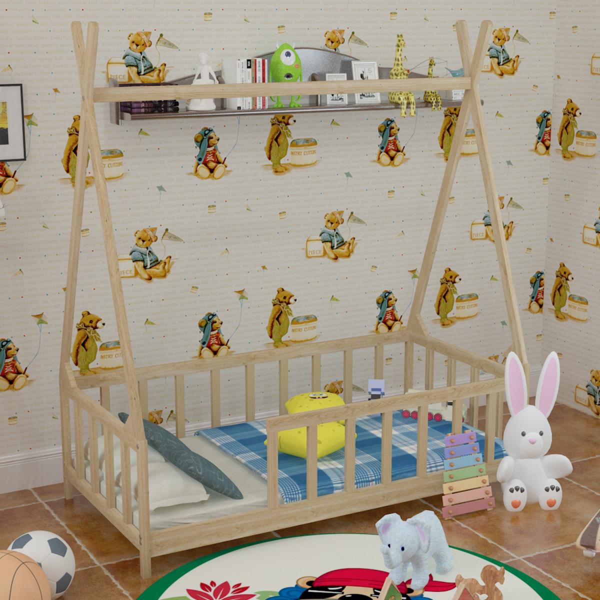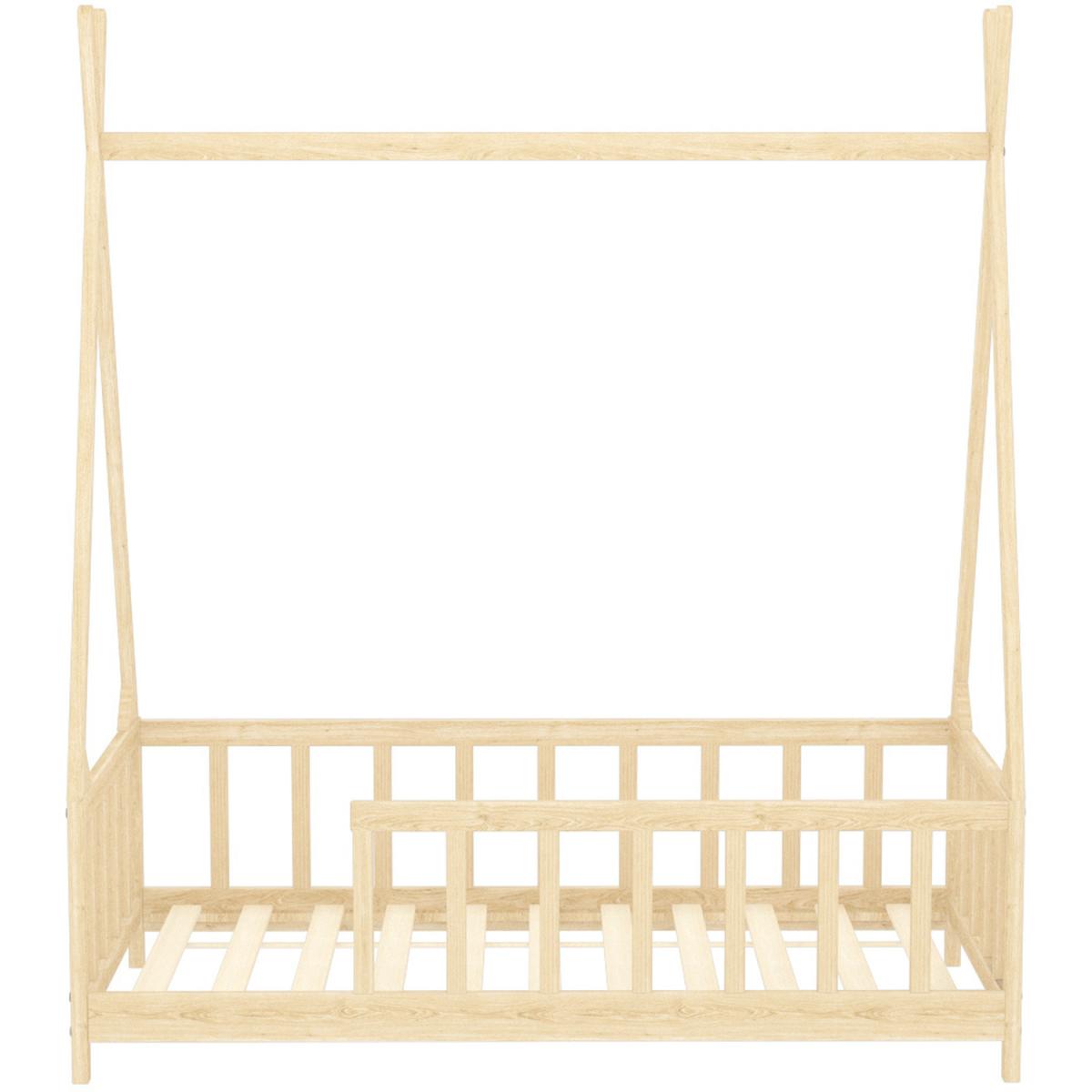 The childlike shape and the pure colour are an excellent gift for children. This beautiful bed gives the children's night a dreamy colour. The bed is smartly designed with a cradle-style frame where you can hang bed curtains to create privacy for your kid. Pinewood is strong and safe, harmless to children and promotes sustainable development. This bed frame provides not just a sleeping area, but can be used as a play area, reading nook, or playhouse. The solid slats provide a sturdy base for your mattress. This wooden bed is also perfect as a reading nook or a playhouse for your child.