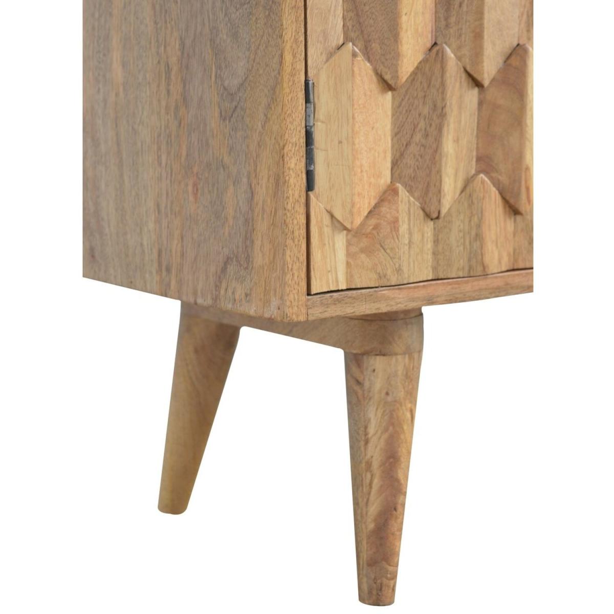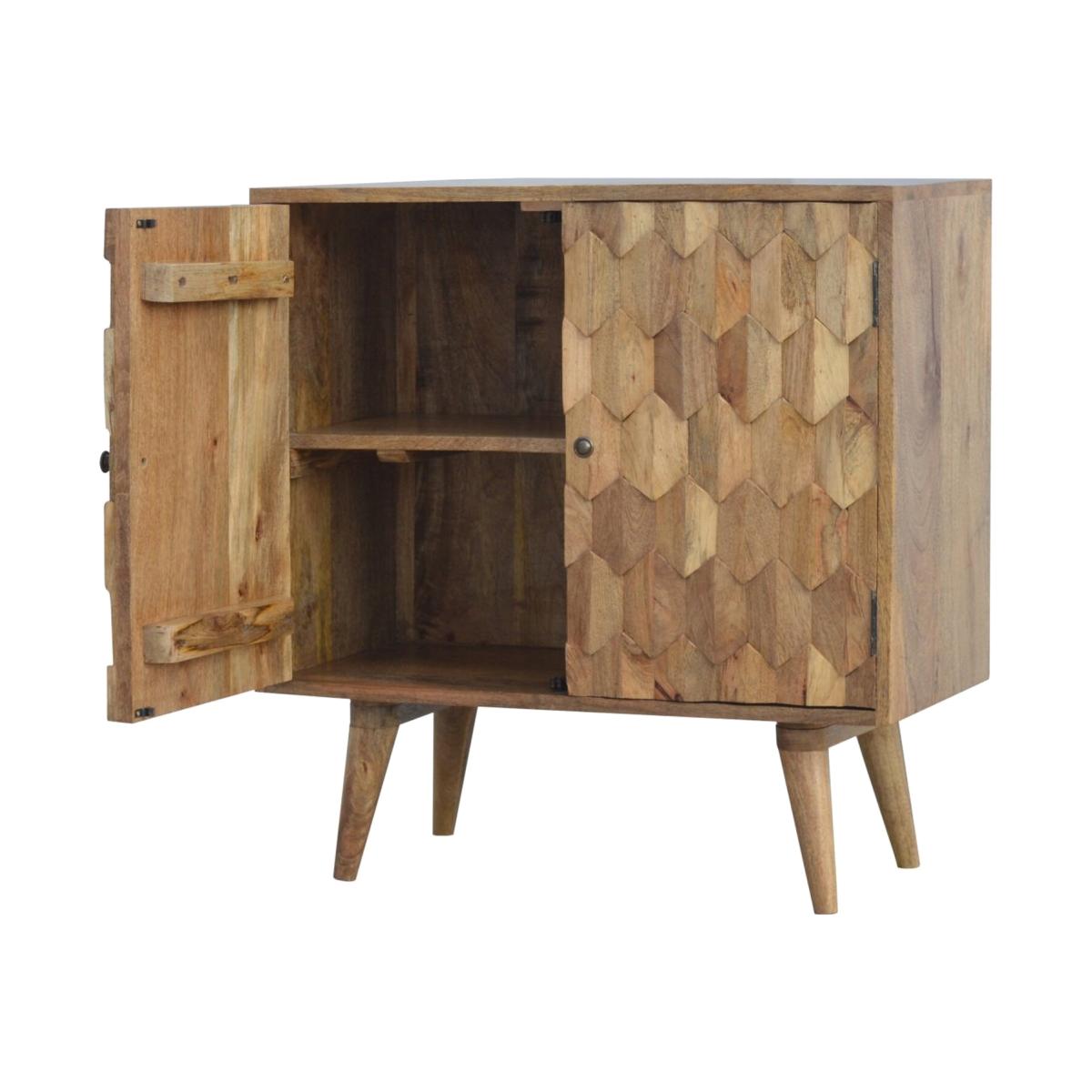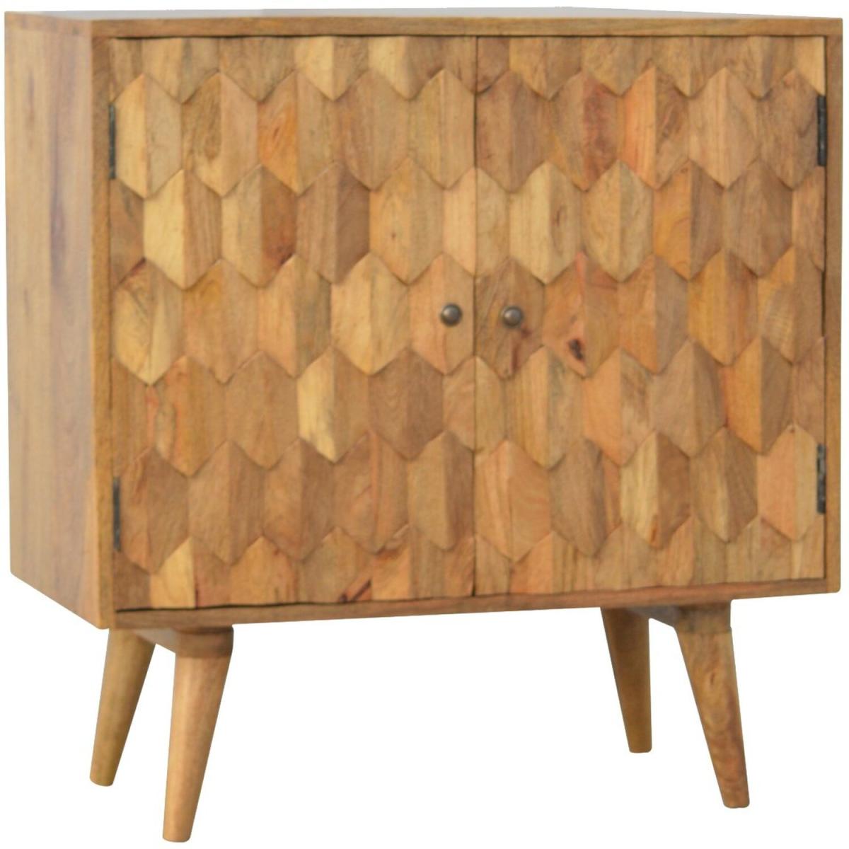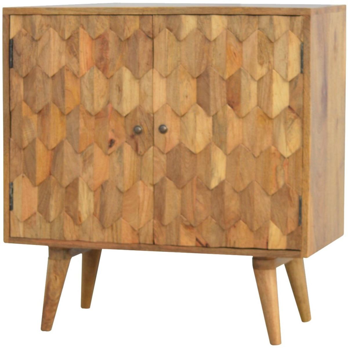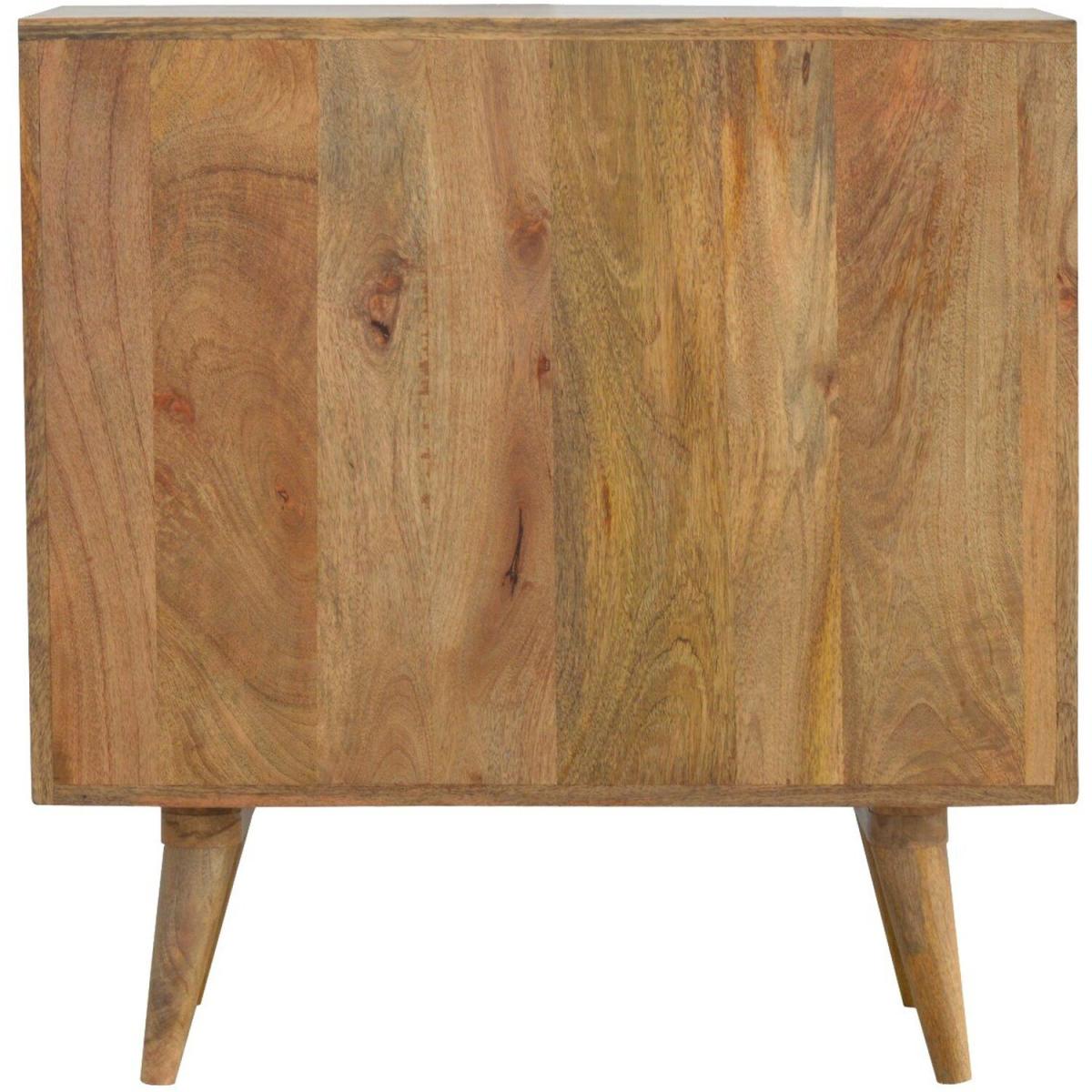 This handy cabinet has been constructed from 100% solid mango wood and has a fine oak-ish finish. Its pineapple carved design gives the product a unique twist and provides enough space with 2 large doors that offer useful storage. Other features include shiny knobs and 4 Nordic style feet. This cabinet is the perfect addition to any home.