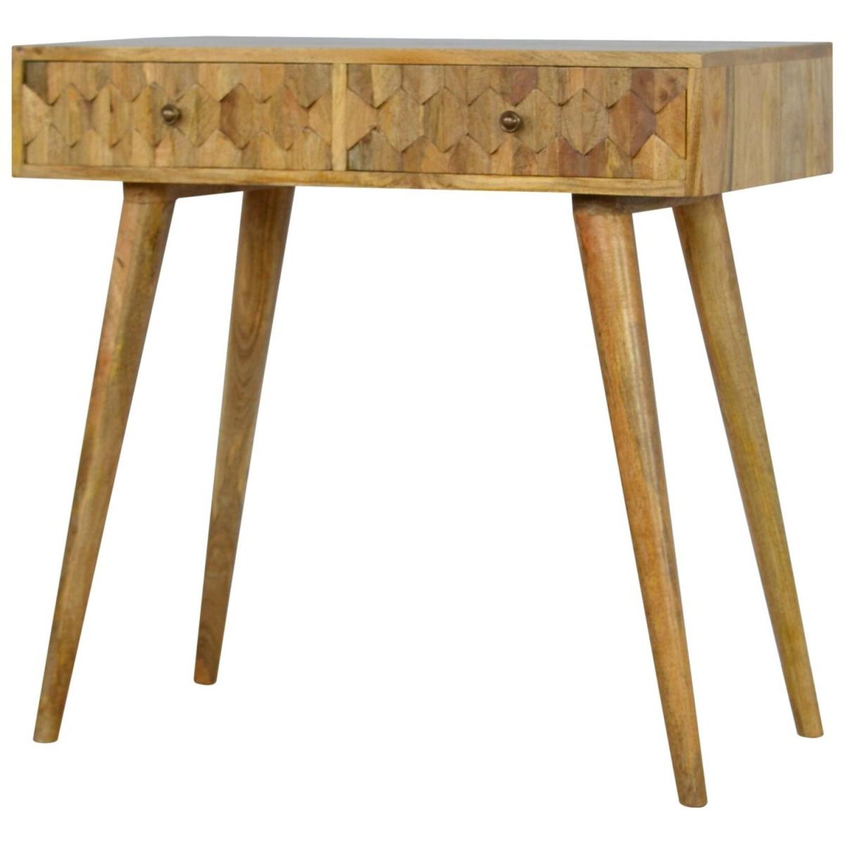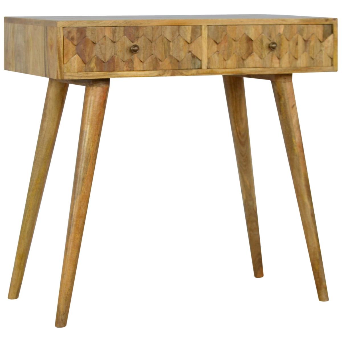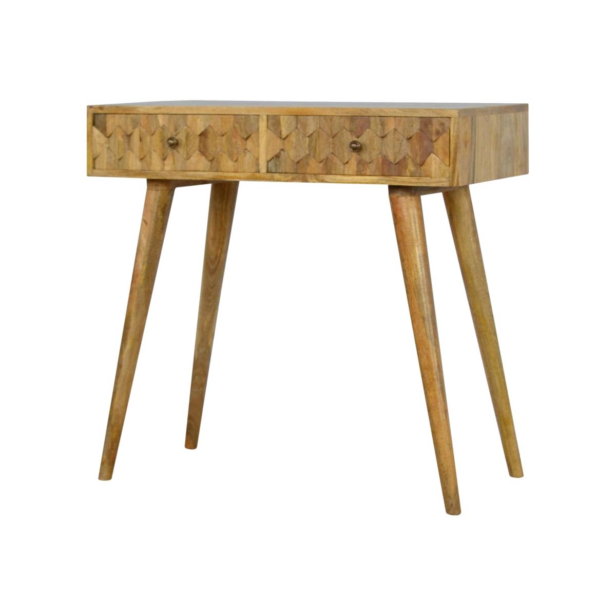 Add this console table to your hallway, living room, or bedroom. Standing on 4 Nordic style legs it features 2 spacious drawers which each have 1 shiny knob. This is a very stylish and versatile piece that features a hand-carved pineapple design on the wood which can match any style of interior and could go nicely with a variety of different colours and finishes. This piece can stand alone or can be completed with the matching collection.