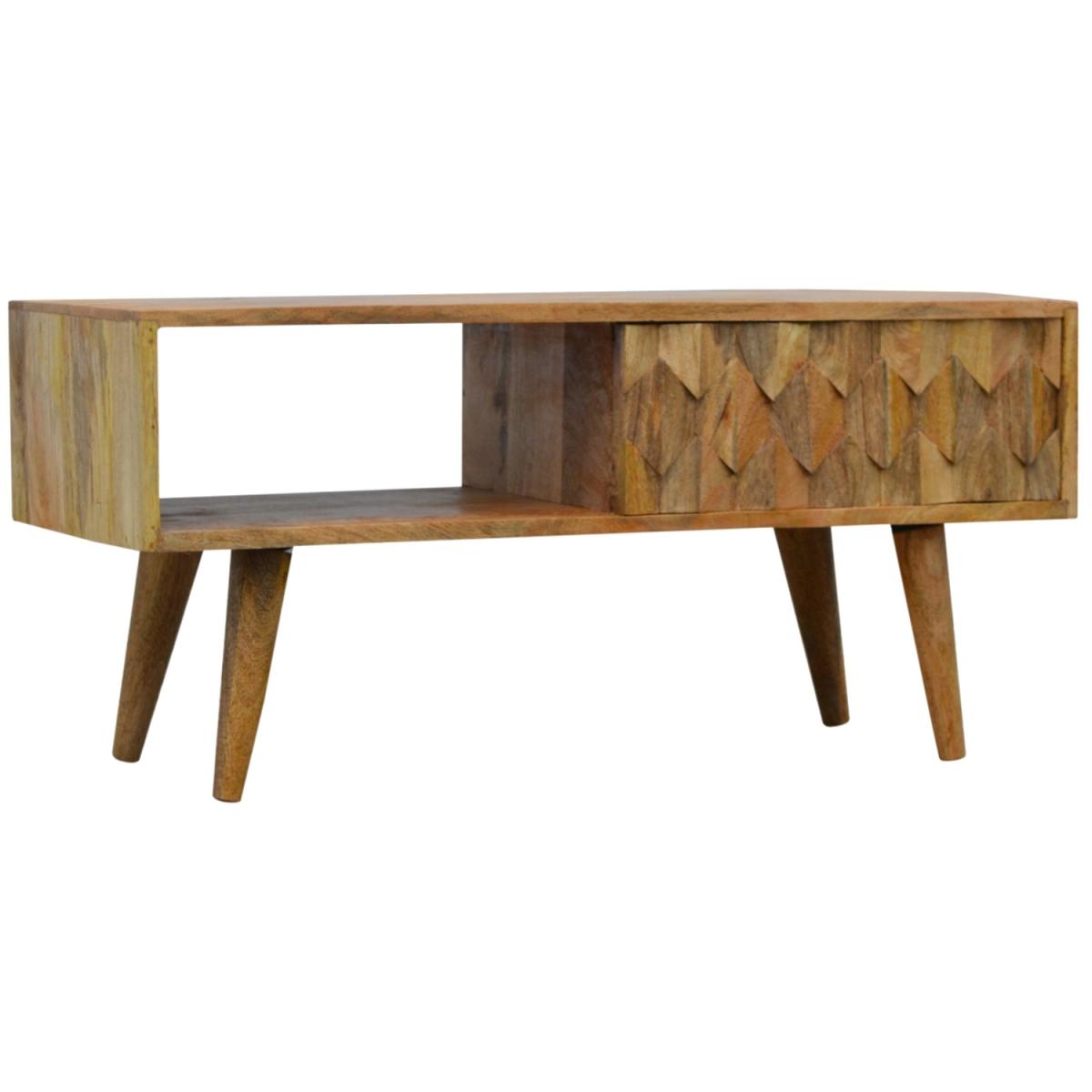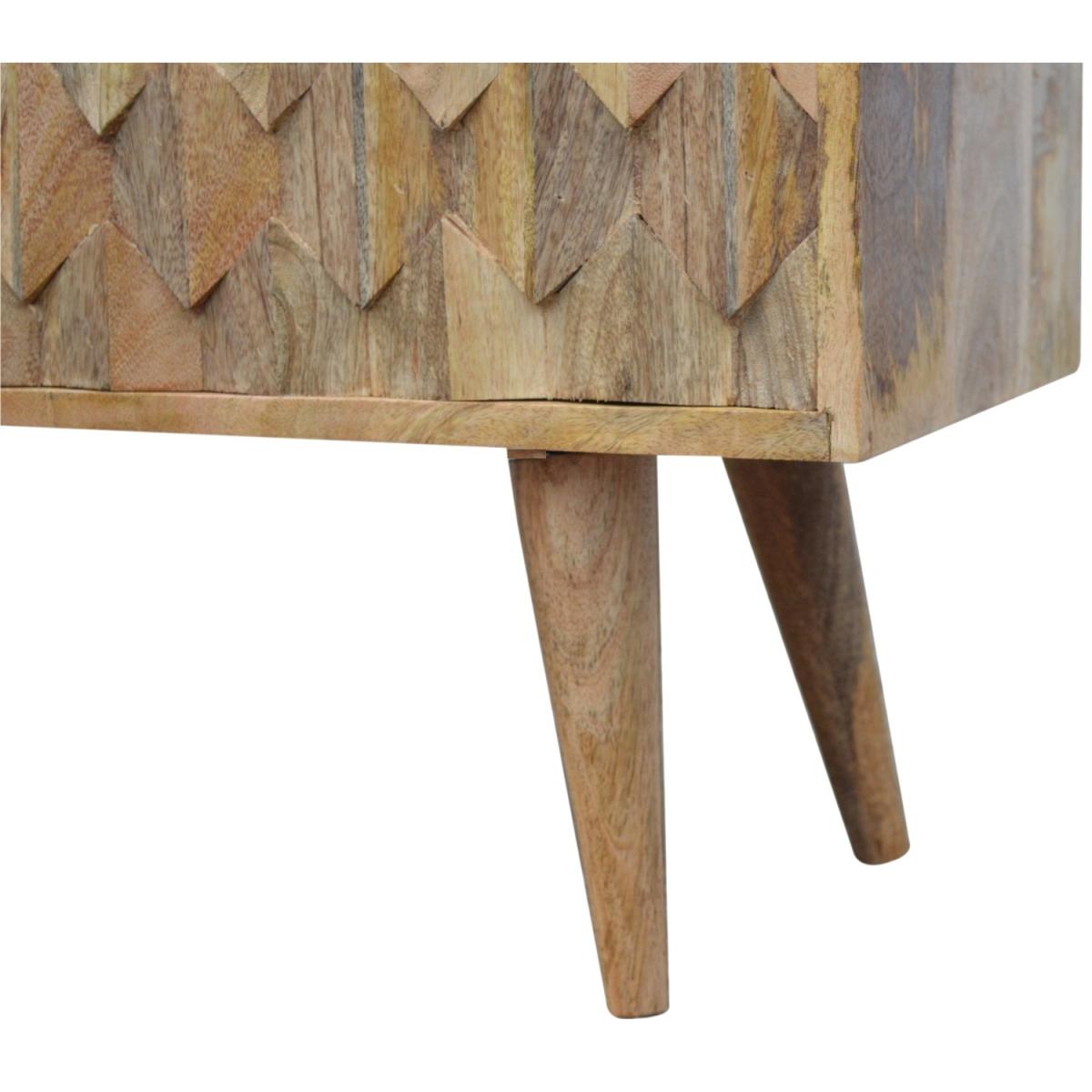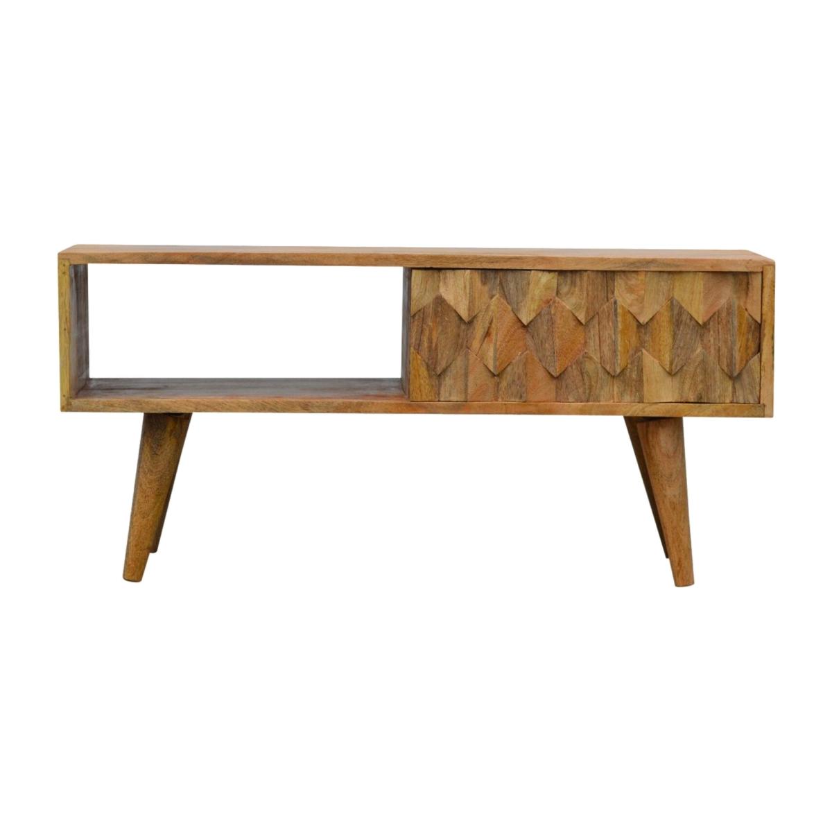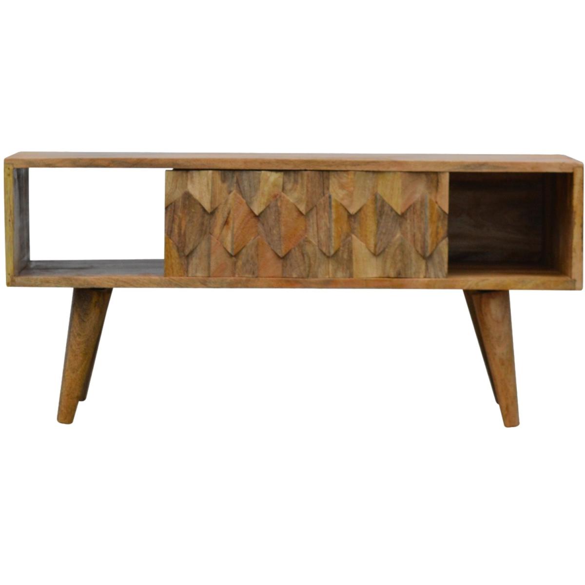 Pineapple Carved Media Unit with Sliding Door. This media unit has been constructed from 100% solid mango in oak-ish finish. It stands on 4 Nordic style legs making it strong and sturdy. Some other features include an open slot with 1 sliding door with a pineapple carved door front design. It can look great alone or be partnered from the other pieces from the pineapple carved range.