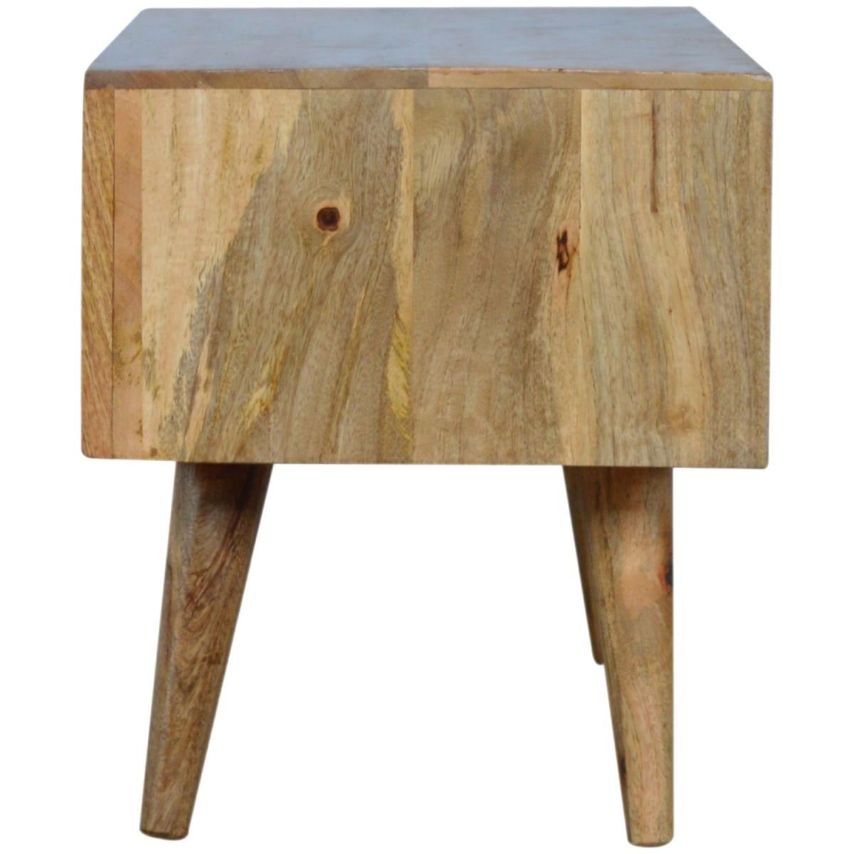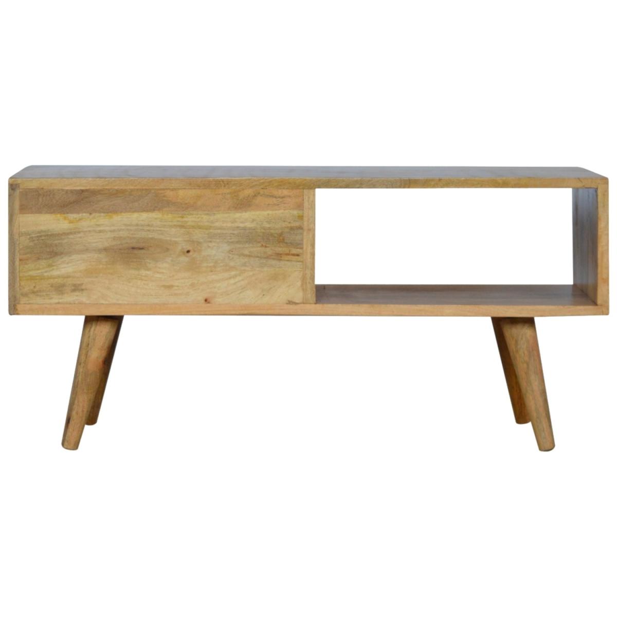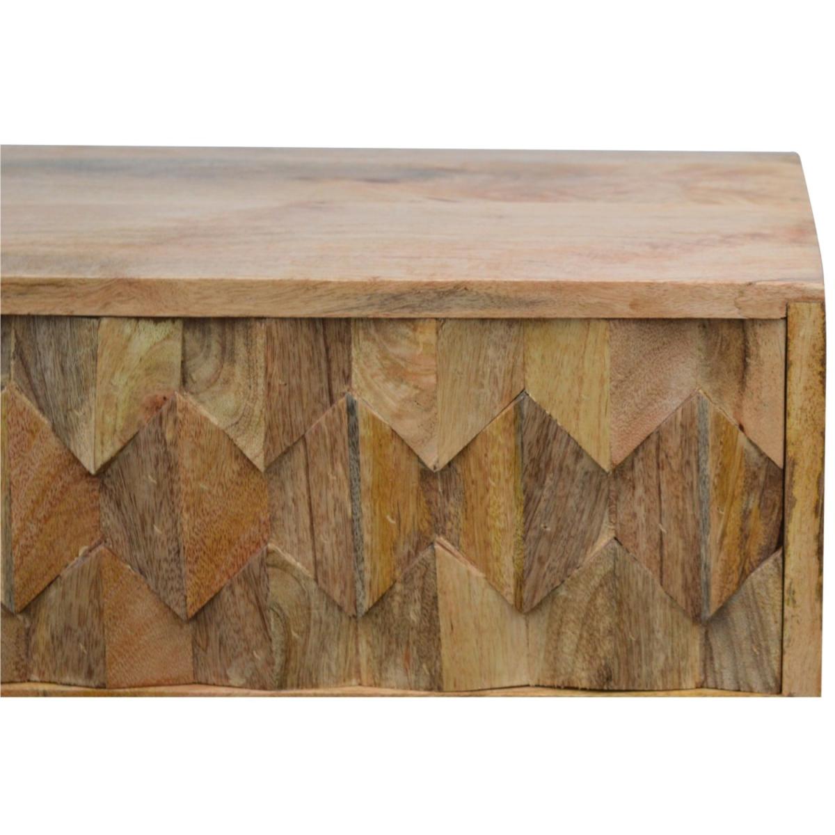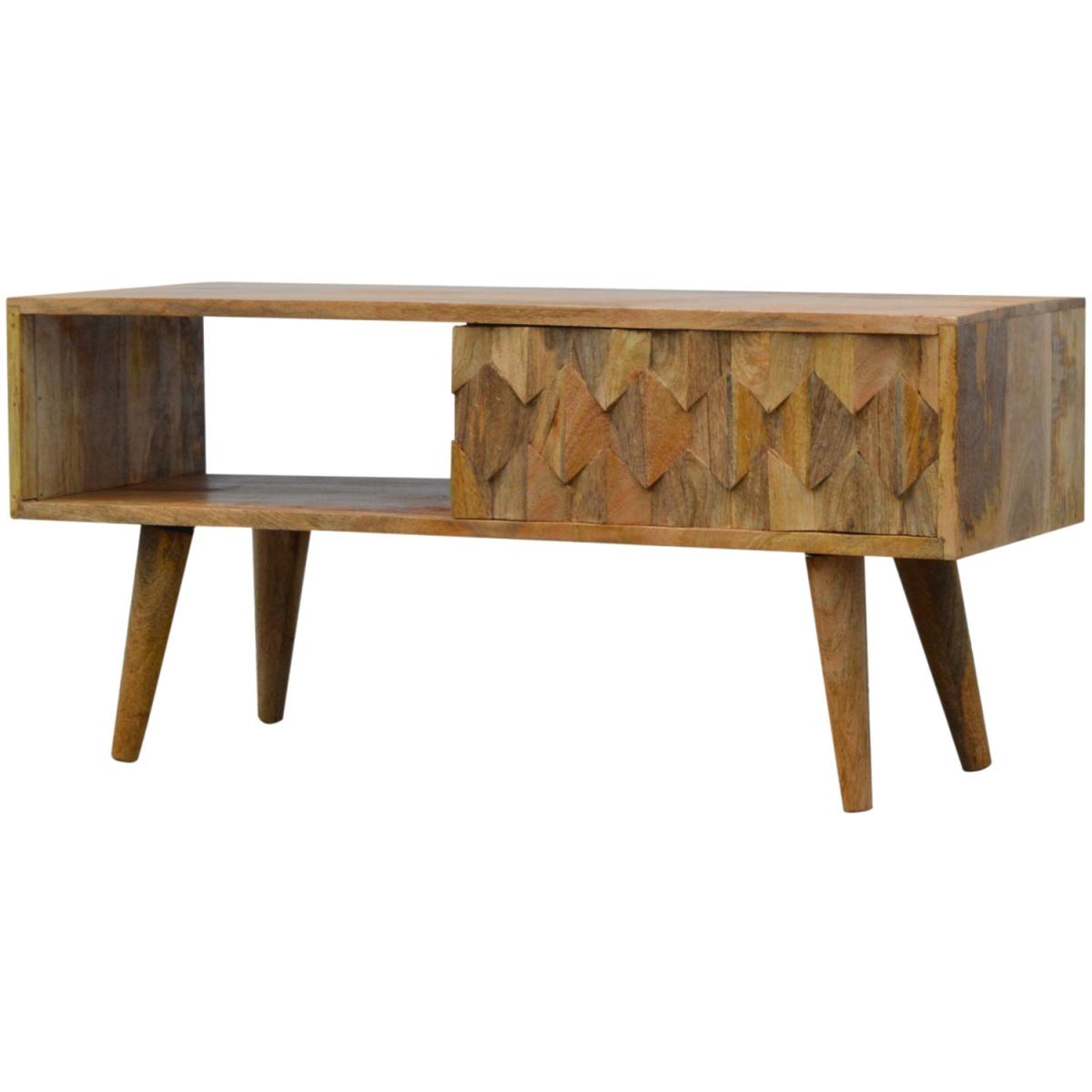 Pineapple Carved Media Unit with Sliding Door. This media unit has been constructed from 100% solid mango in oak-ish finish. It stands on 4 Nordic style legs making it strong and sturdy. Some other features include an open slot with 1 sliding door with a pineapple carved door front design. It can look great alone or be partnered from the other pieces from the pineapple carved range.