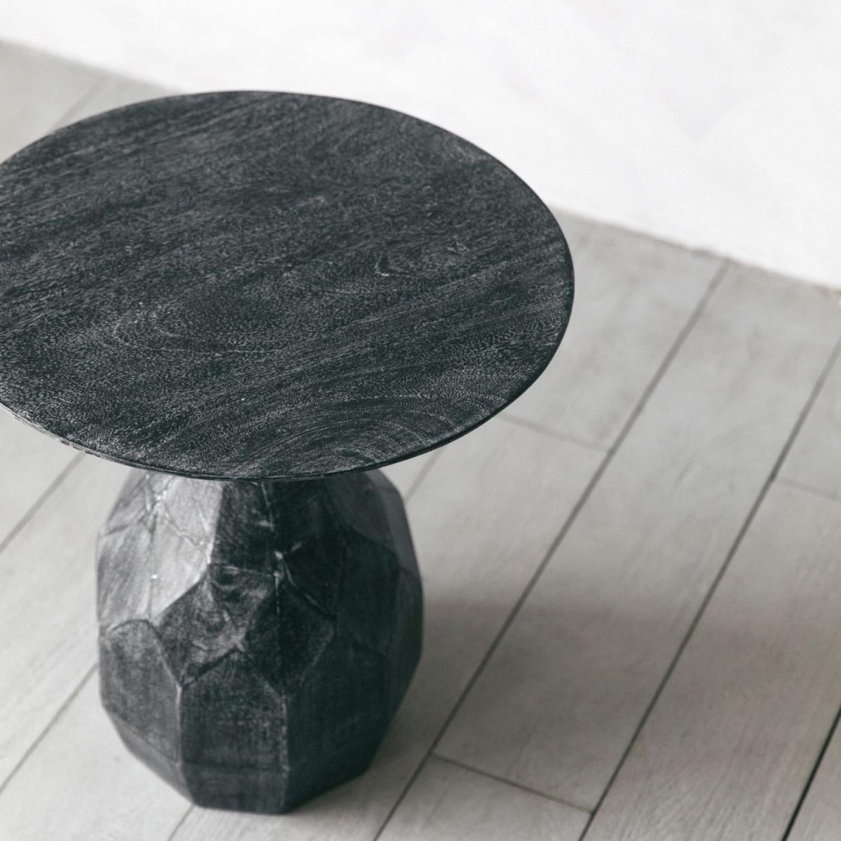 Handcrafted from mango wood with a black cerused finish, this substantial side table features a distinct pinecone shaped base and smooth, ciruclar tabletop.