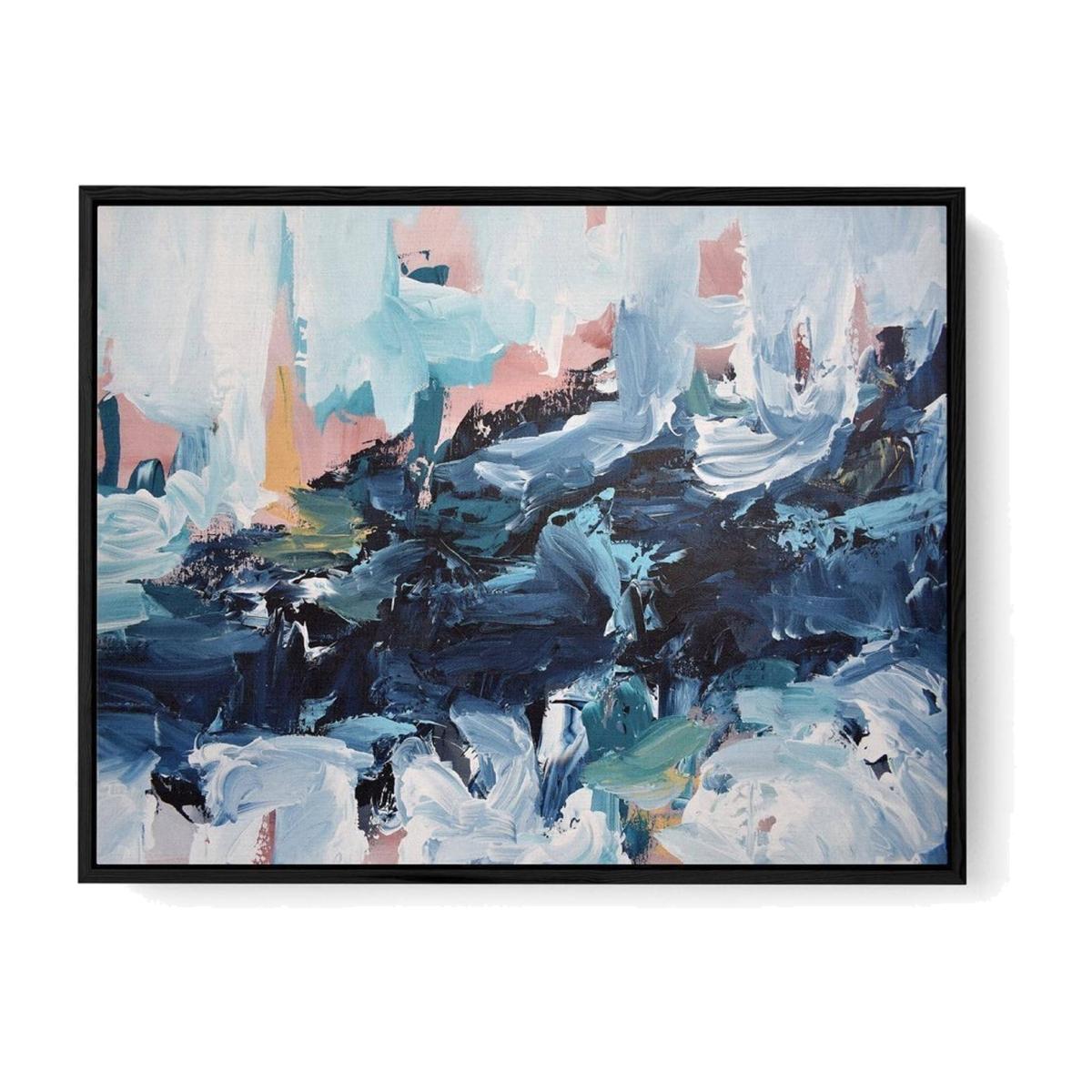 Dimensions W104x H74x D4 cm. This contemporary abstract canvas art print will add a unique touch of style to any room in your home. The colourful eye-catching design perfectly complements a variety of home interiors. Printed on 100% cotton canvas with excellent colour reproduction and fade resistance. The artwork comes framed and ready to hang in a solid wood floating frame with black finish. Features. 100% Cotton Canvas Print. Arrives ready to hang on your wall Solid wooden floating frame with black finish included. Made using eco-friendly materials including wood from sustainable forests. Produced in the UKAssembly not required..