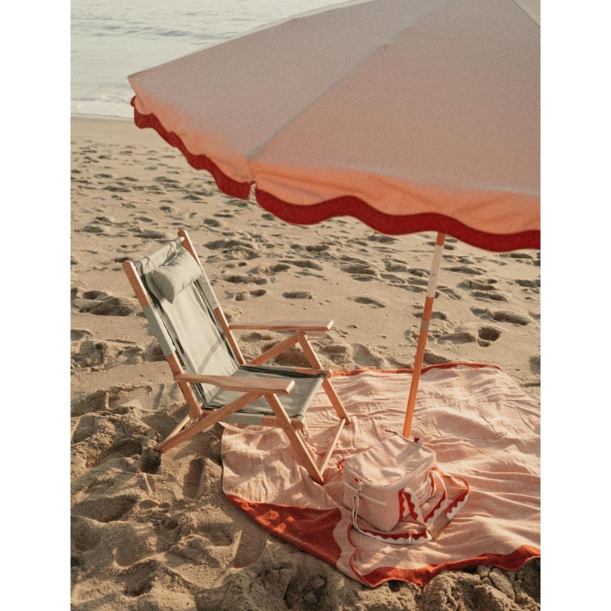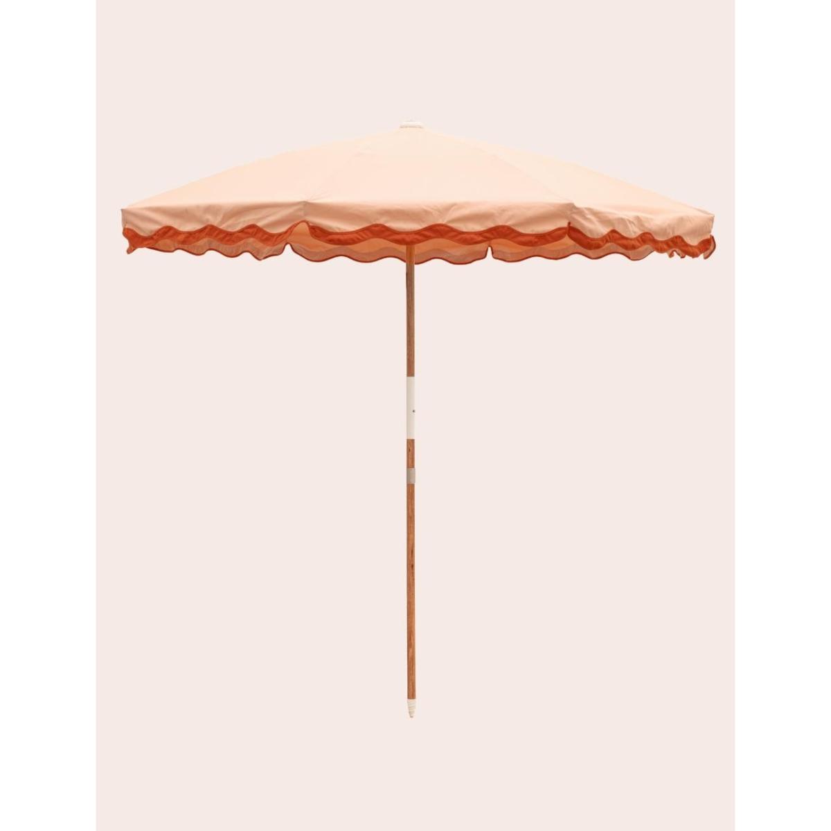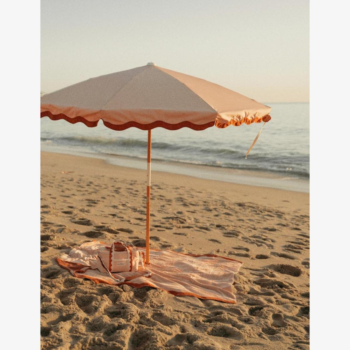 Lie in luxury underneath our Pink & Red Scalloped Parasol. Designed to be strong and elegant with maximum shade coverage for a family of four at the beach, by the pool or in the garden. Our garden parasol umbrella blocks out 98% of the sun's rays with a UPF of 50+. The sun parasol features a beautiful scalloped edge detail in red and pink tones. The canopy is UV and water-resistant with extra strong fibreglass ribs for a sun protection umbrella that is durable and stylish. Perfect for making memories in the summer heat. This umbrella is also available in Green, Mustard & White, and White & Navy.