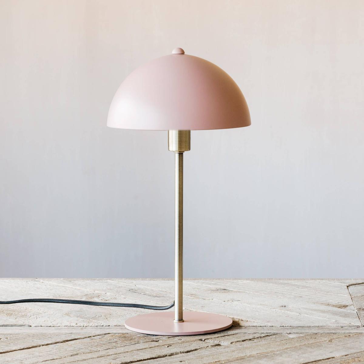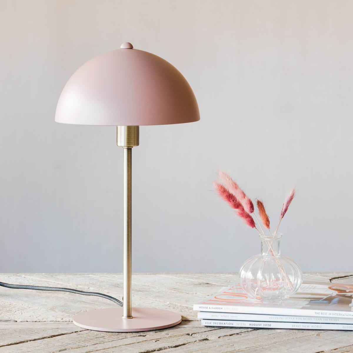 For the perfect ambient downlighting, our domed pink bonnet table lamp. Has Art Deco influences and features clean lines and brass details.