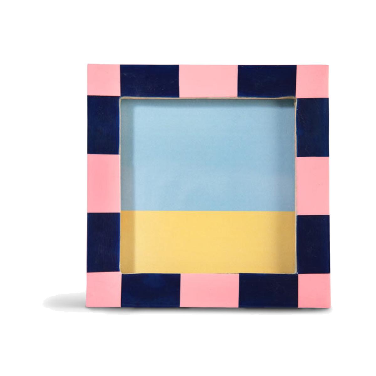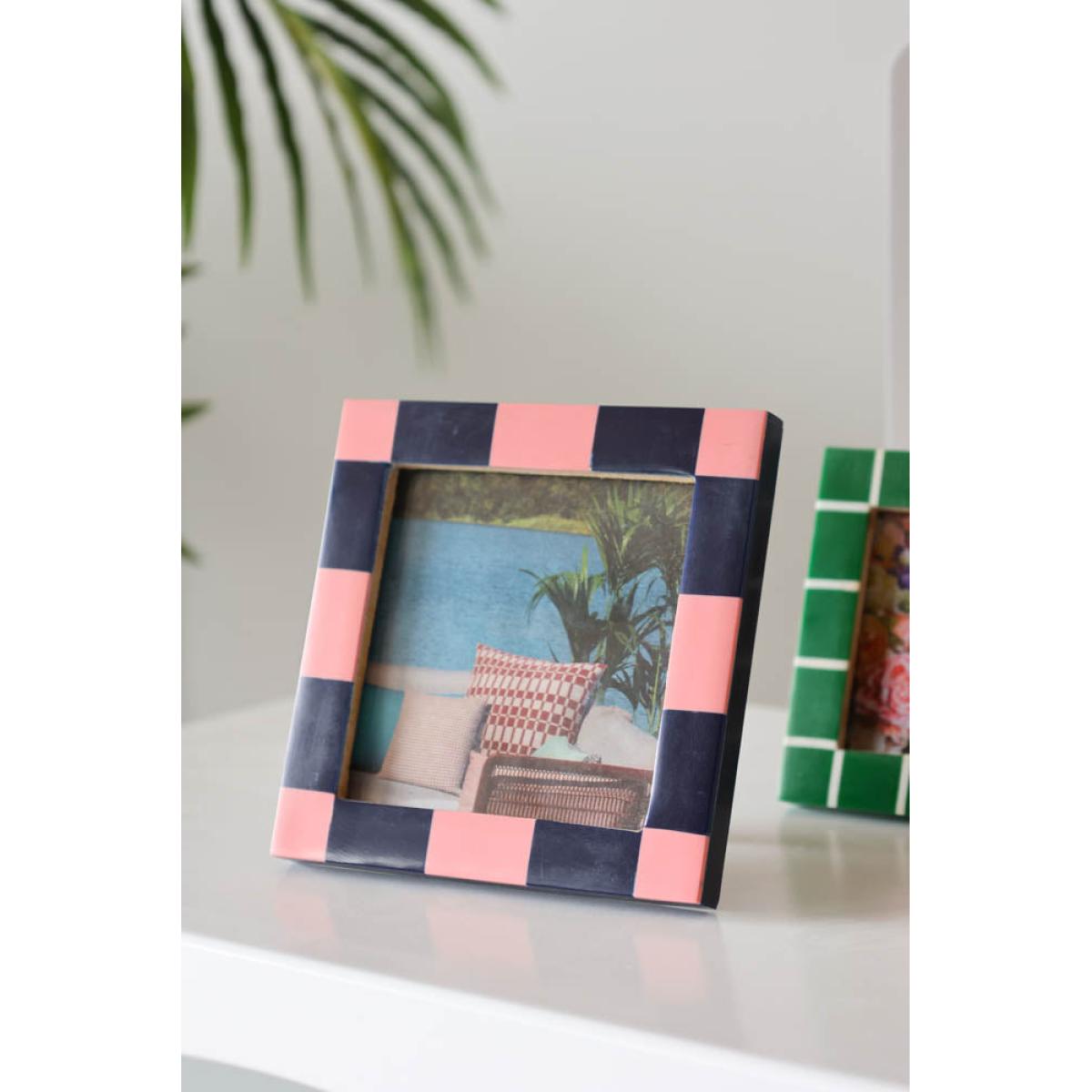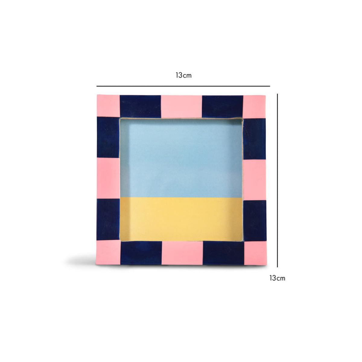 About The Pink Checkered Photo FrameThe Pink Checkered Photo Frame transforms your favourite photo with a splash of colour. With a polyresin frame, the design celebrates the checkerboard trend with a navy blue and pastel pink colour palette. Designed for square photos, the picture frame measures 13cm x 13cm and fits a 9.3cm X 9.3cm photo. Why We Think You’ll Love The Chequered Photo FrameAs one of our favourite trends of the moment, checks and stripes are a fabulous way to experiment with pattern and this frame is ideal for embracing the trend on a smaller scale. Combining pastel pink with classic navy blue, the square photo frame brings a pop of creative colour to your shelves, desk or surfaces. When it comes to styling, all you need to do is choose a treasured photo and display the frame in pride of place for all to see!